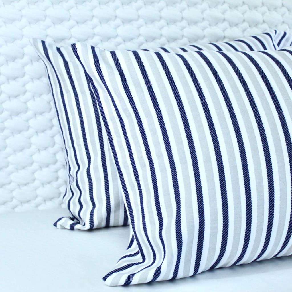 Fronha de Almofada Decorativa, em algodão com padrão de riscas em tons azul marinho e cinza. Abertura com fecho.