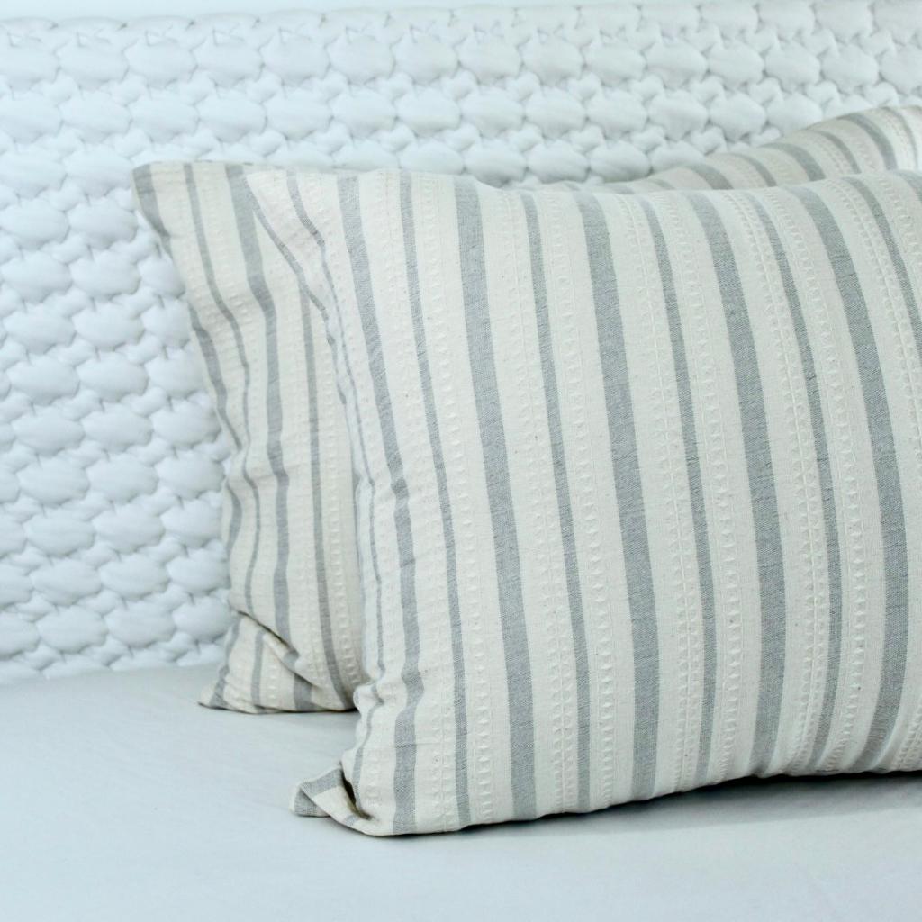 Fronha de Almofada Decorativa, em algodão com padrão riscas em tons cinza e creme. Abertura com fecho.