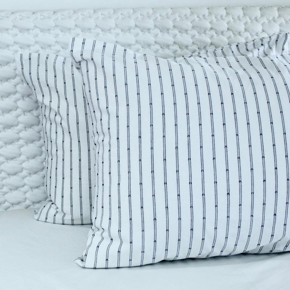 Fronha de Almofada Decorativa, em algodão com padrão de riscas em tons azul marinho e branco. Promenor de ponto azul marinho.  Abertura com fecho.