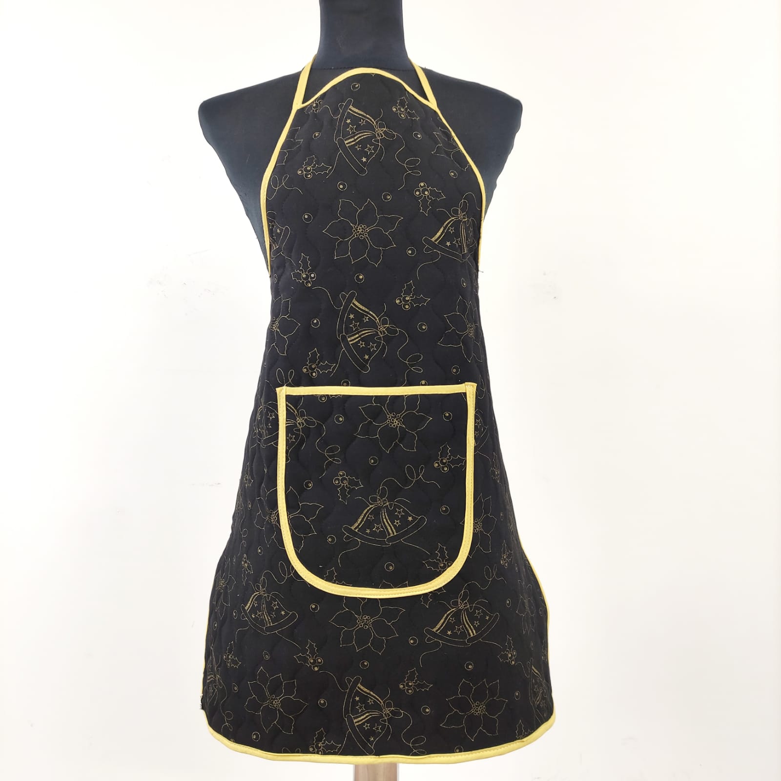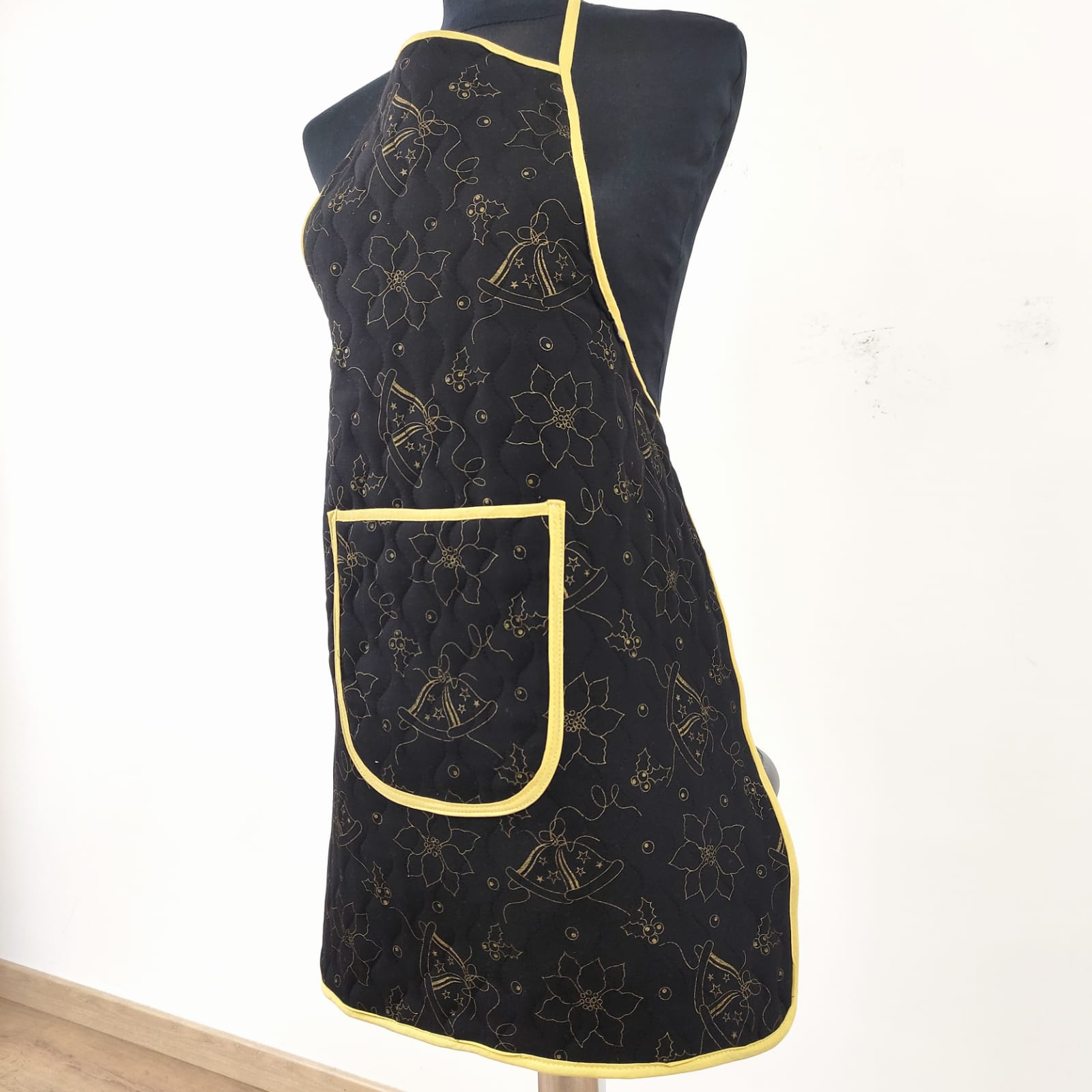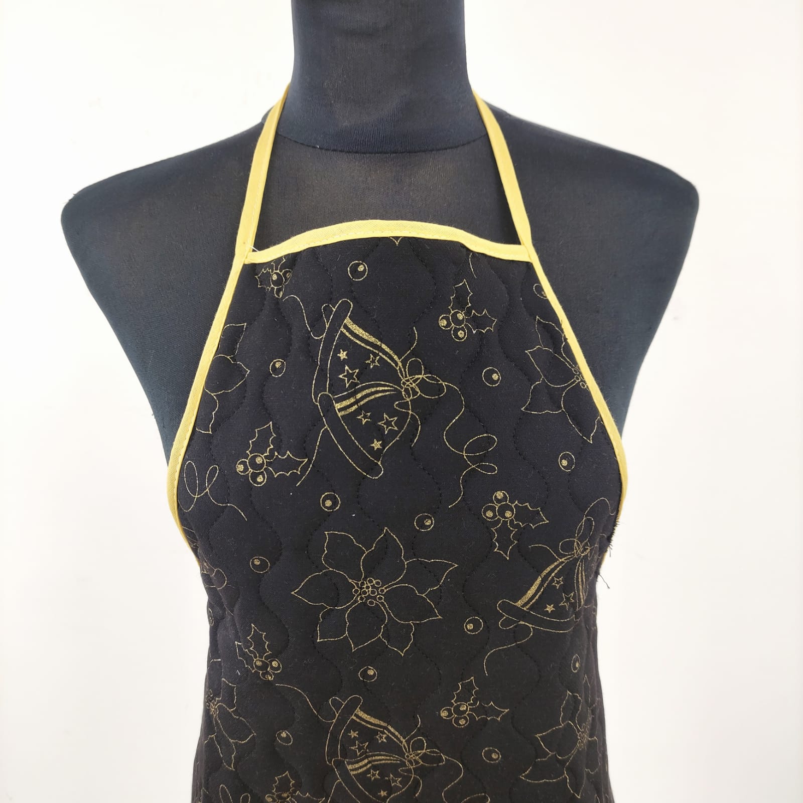 Avental acolchoado em tecido com aplicação de decorações de natal com tons de dourado.