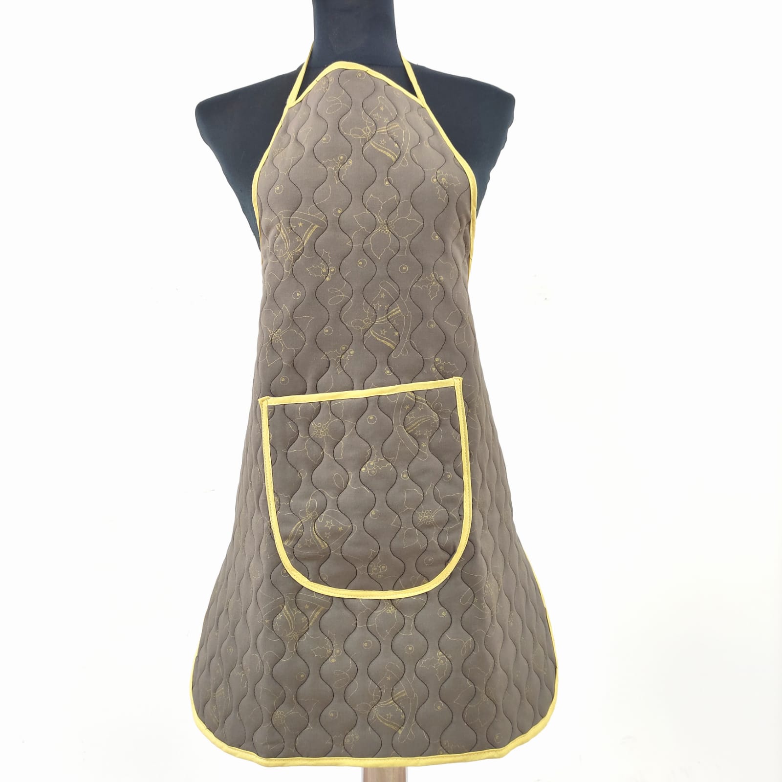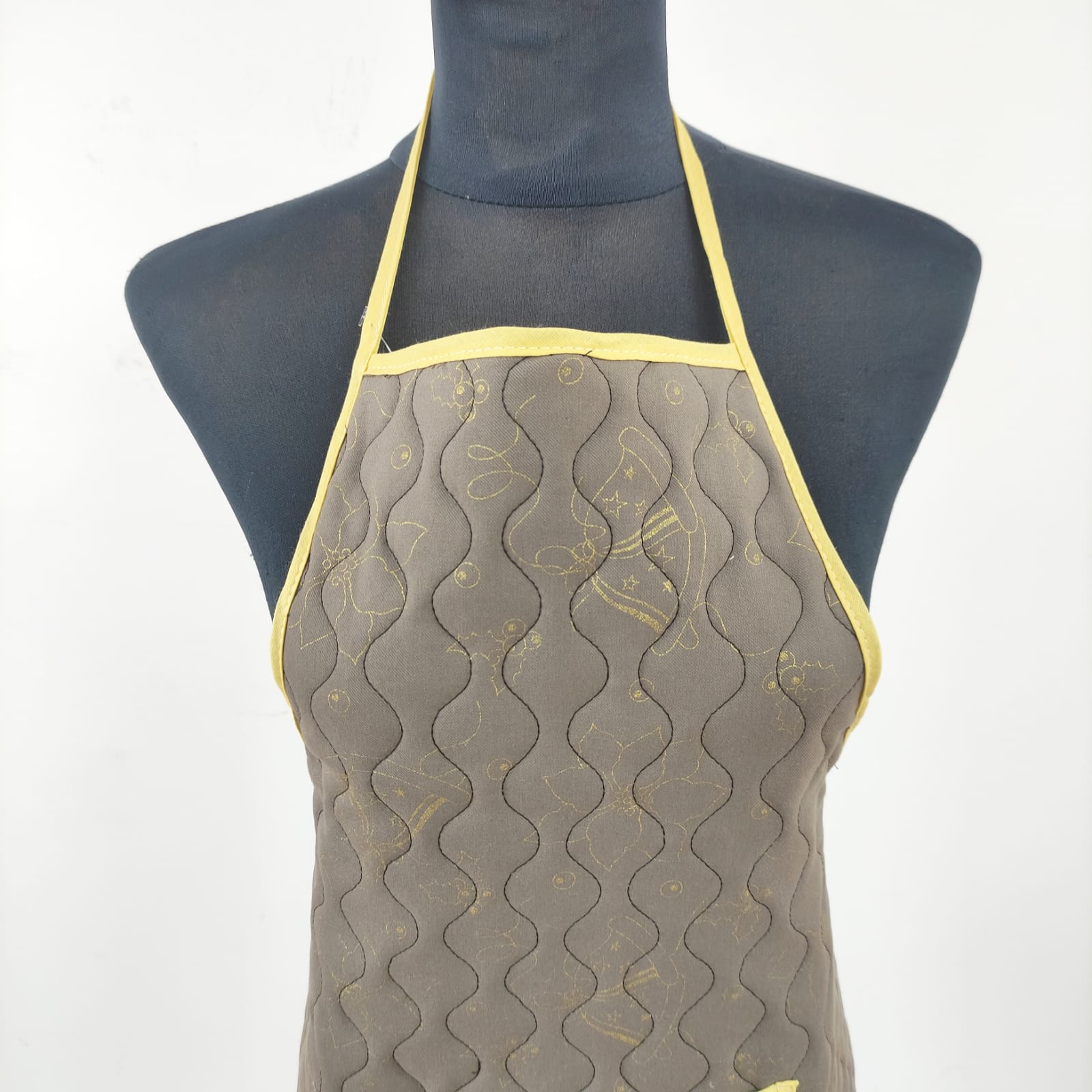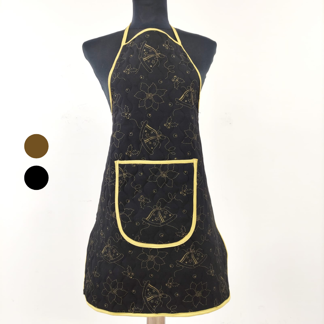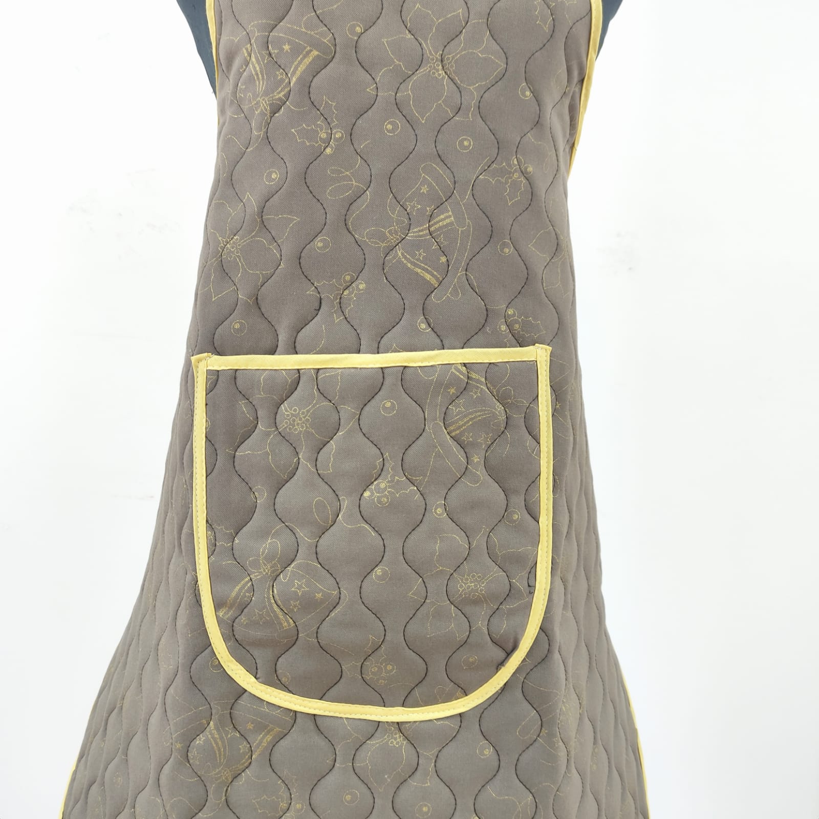 Avental acolchoado em tecido com aplicação de decorações de natal com tons de dourado.