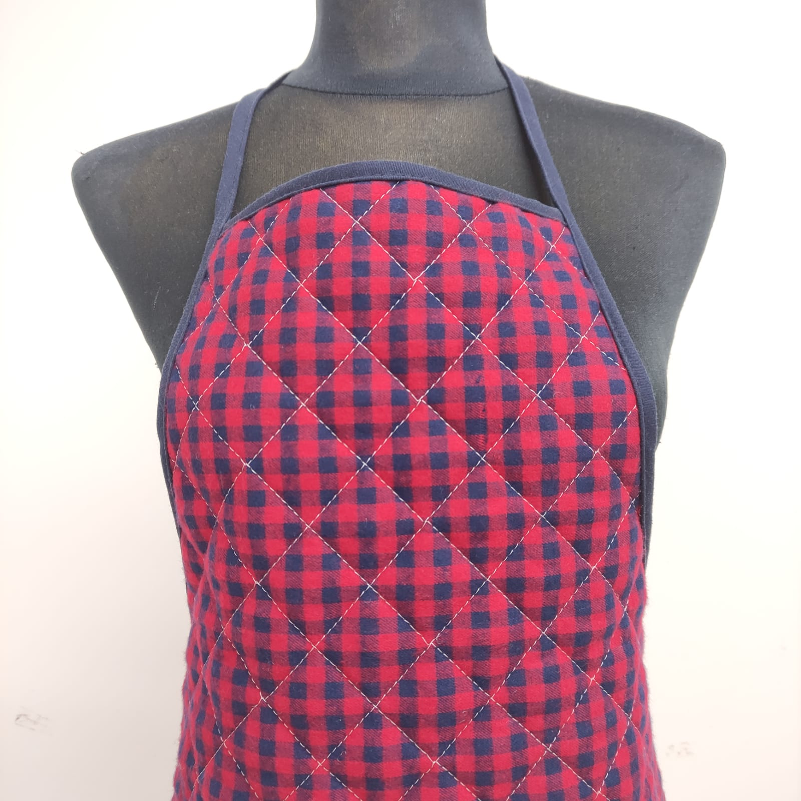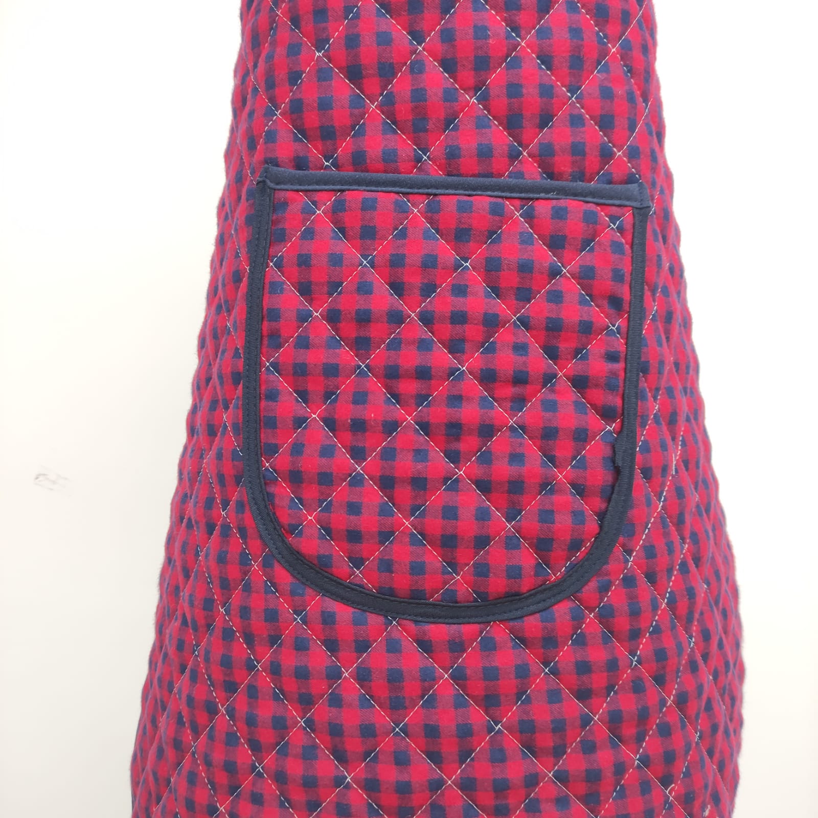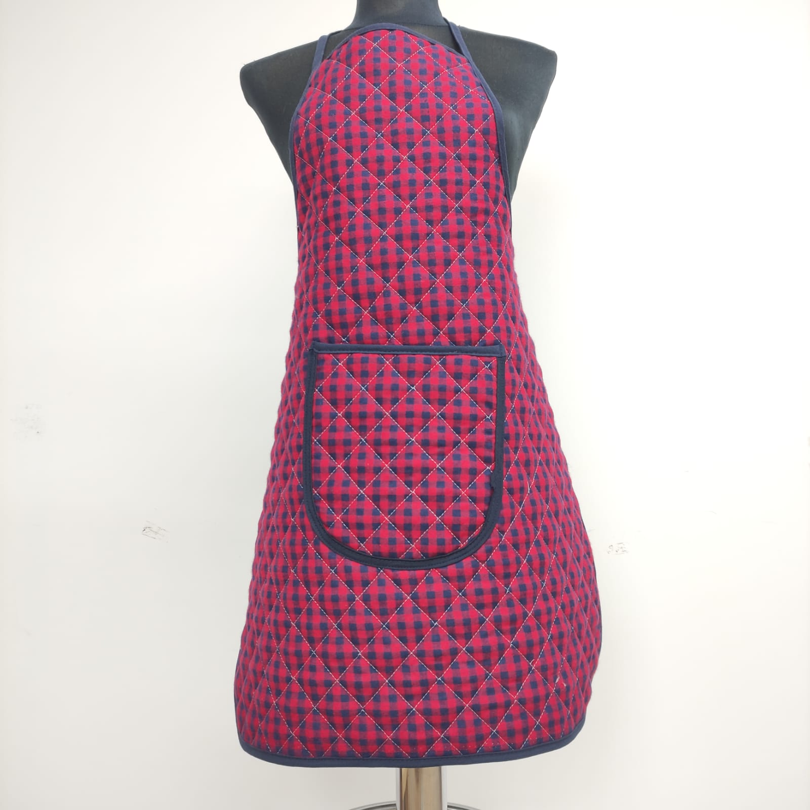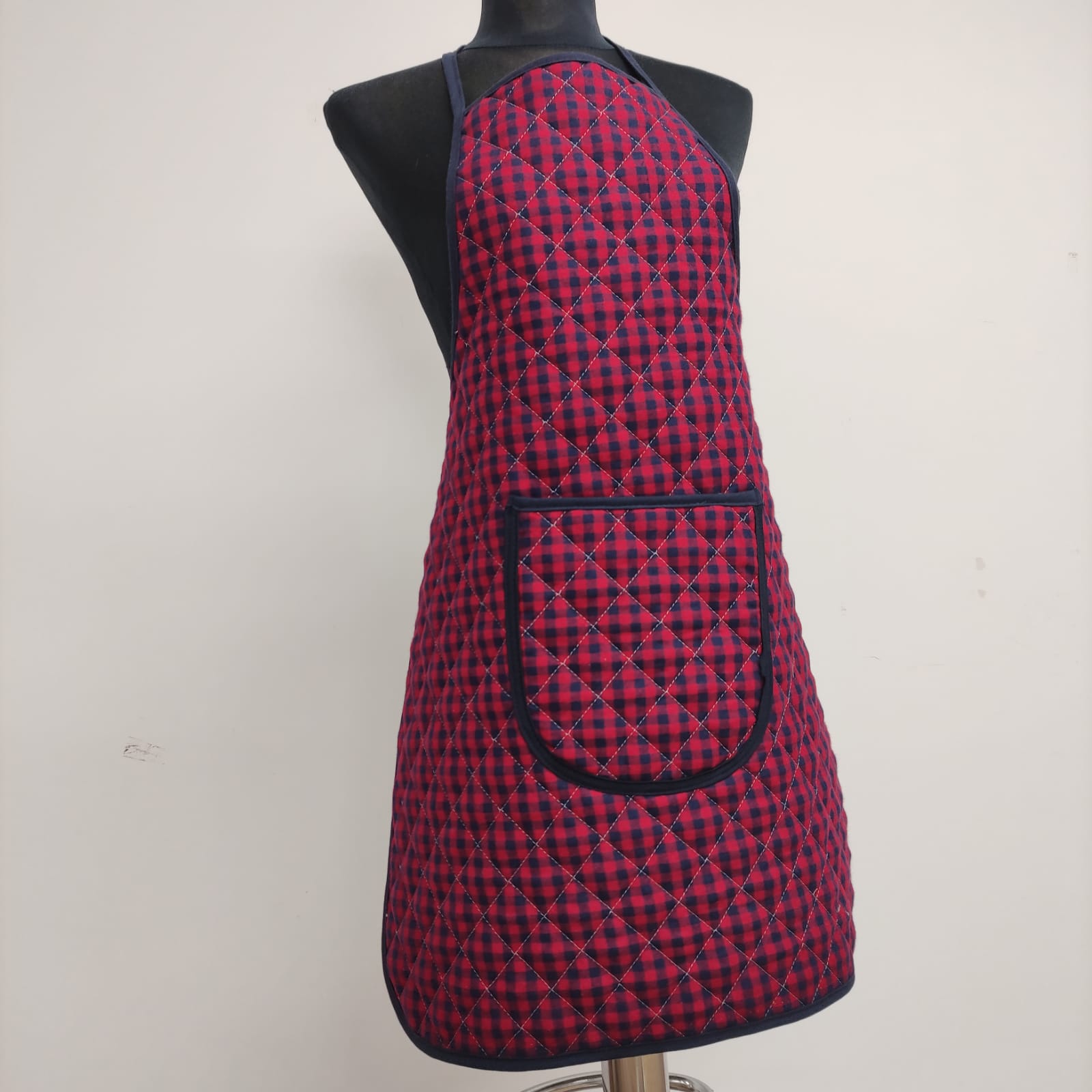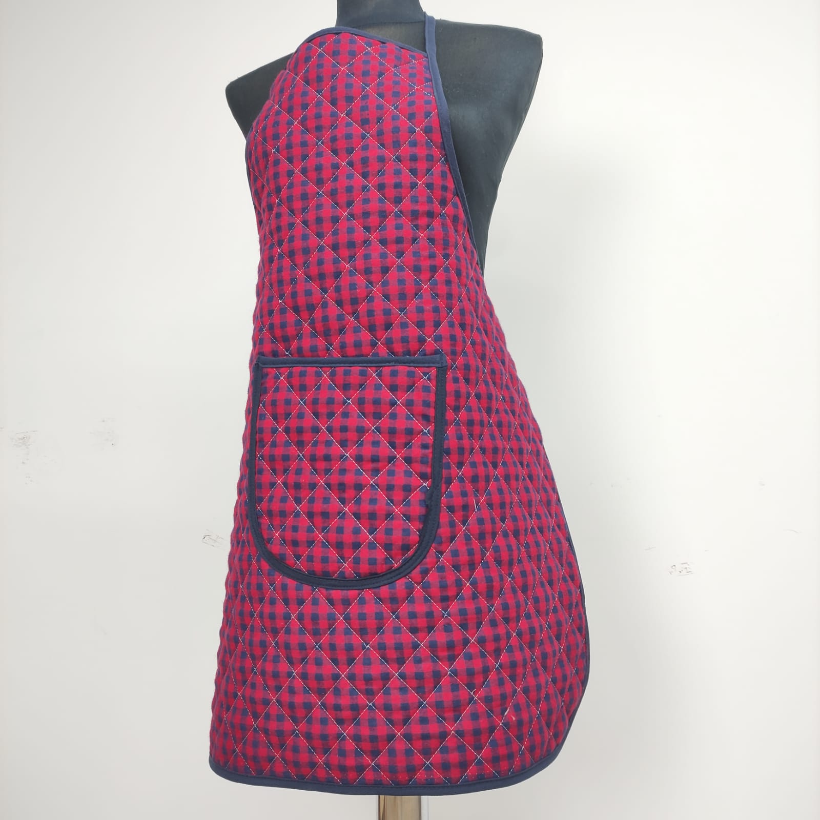 Avental acolchoado com padrão de quadradinhos, disponível em vermelho ou rosa.