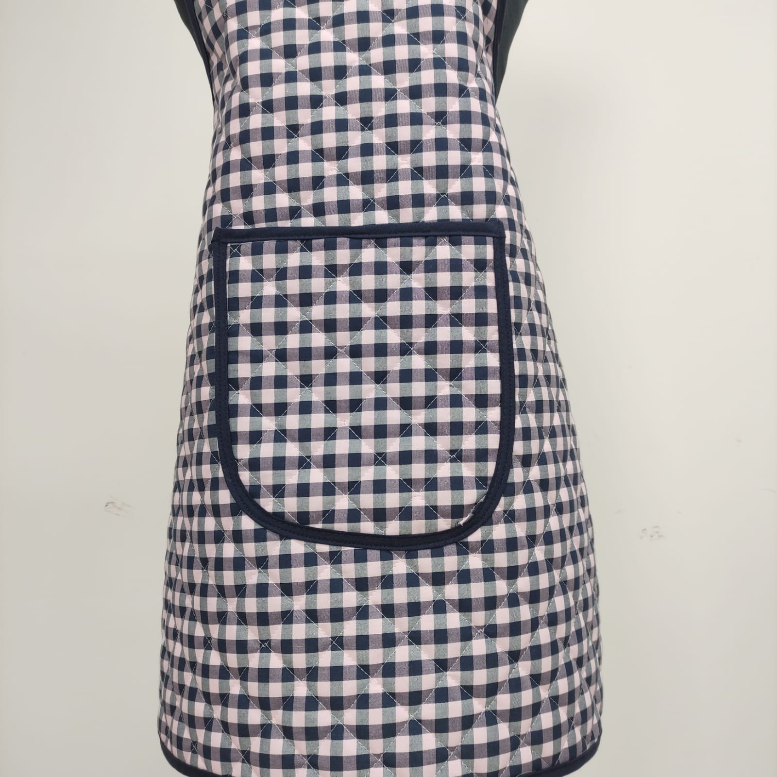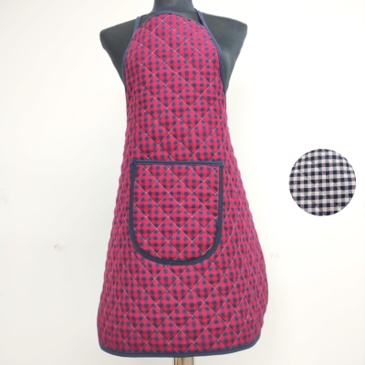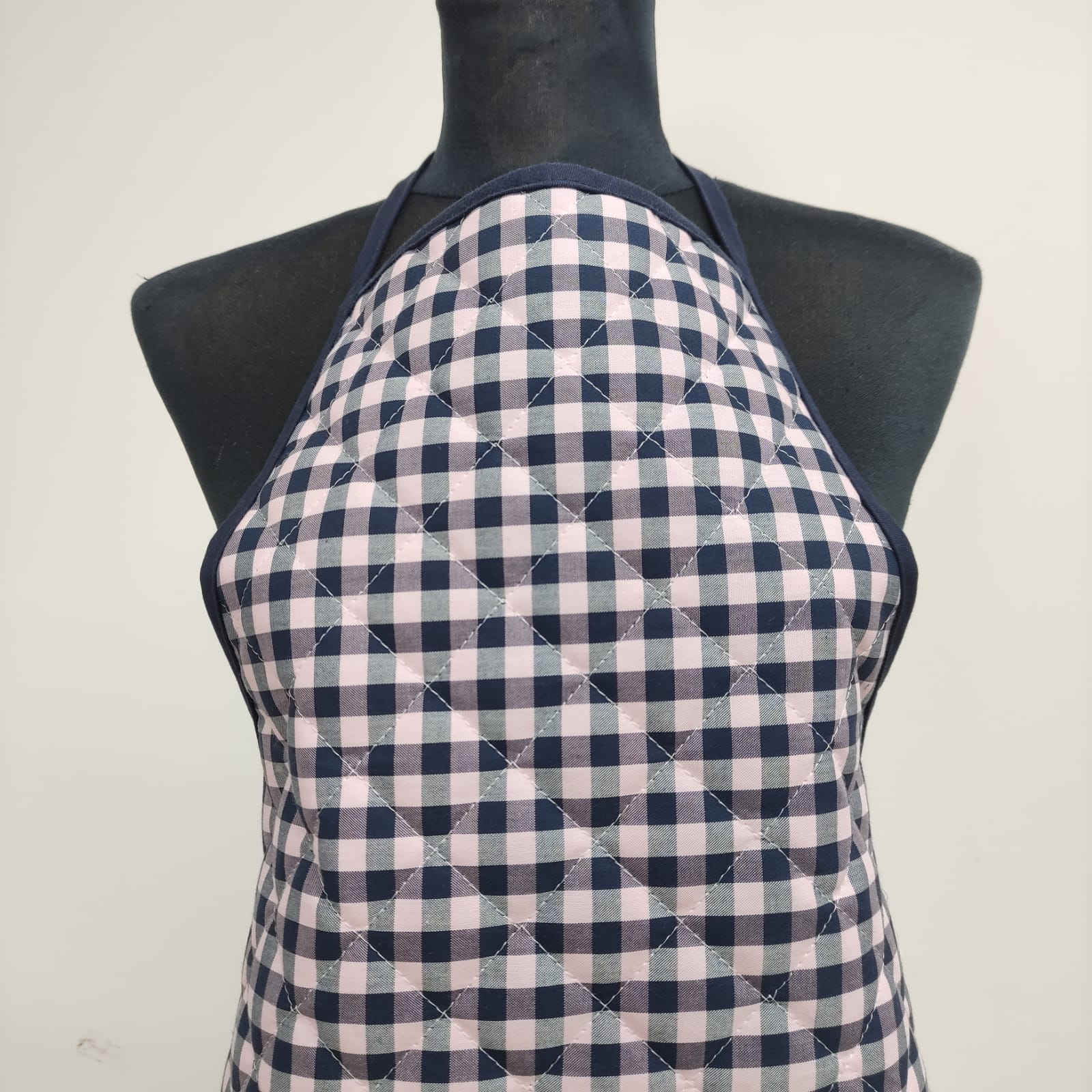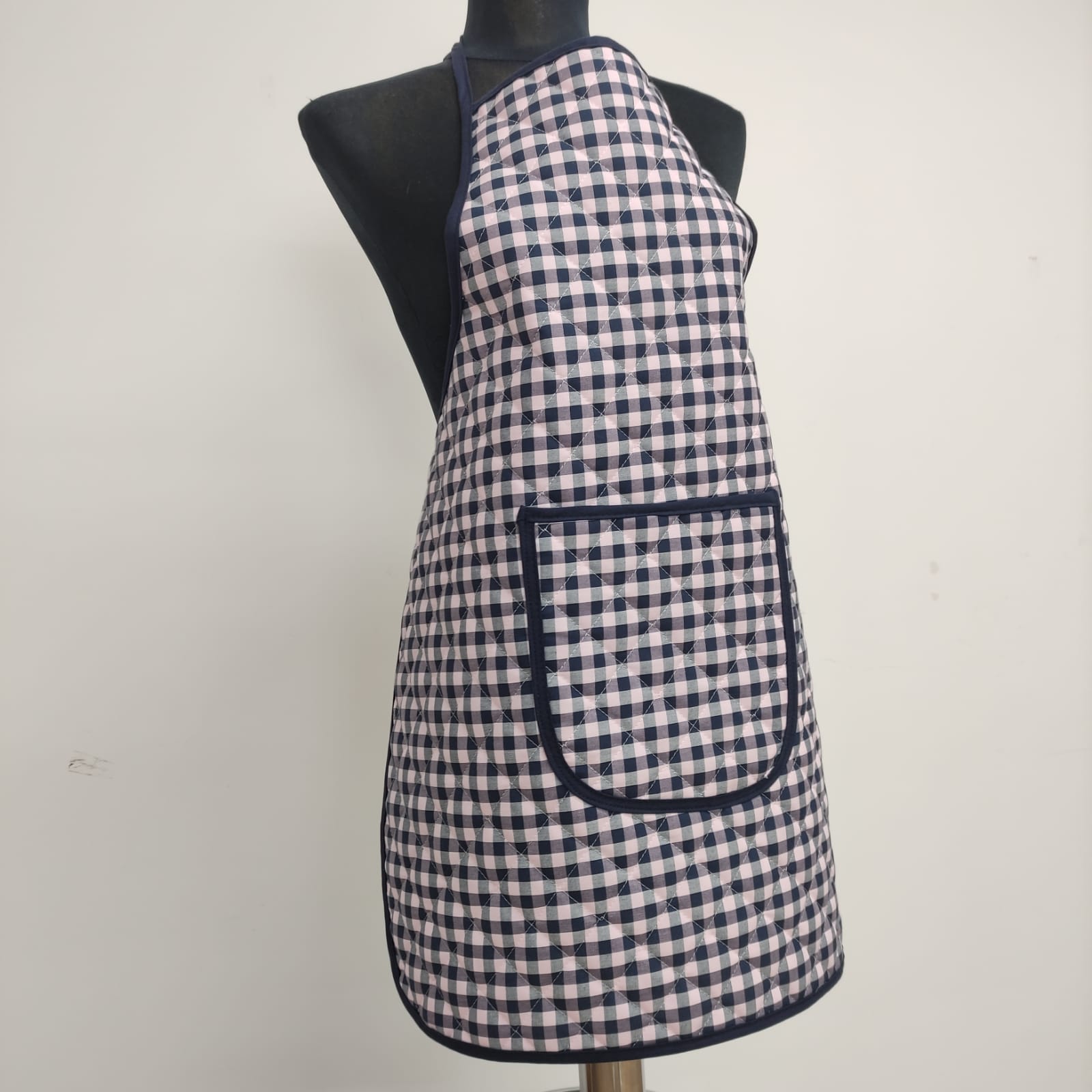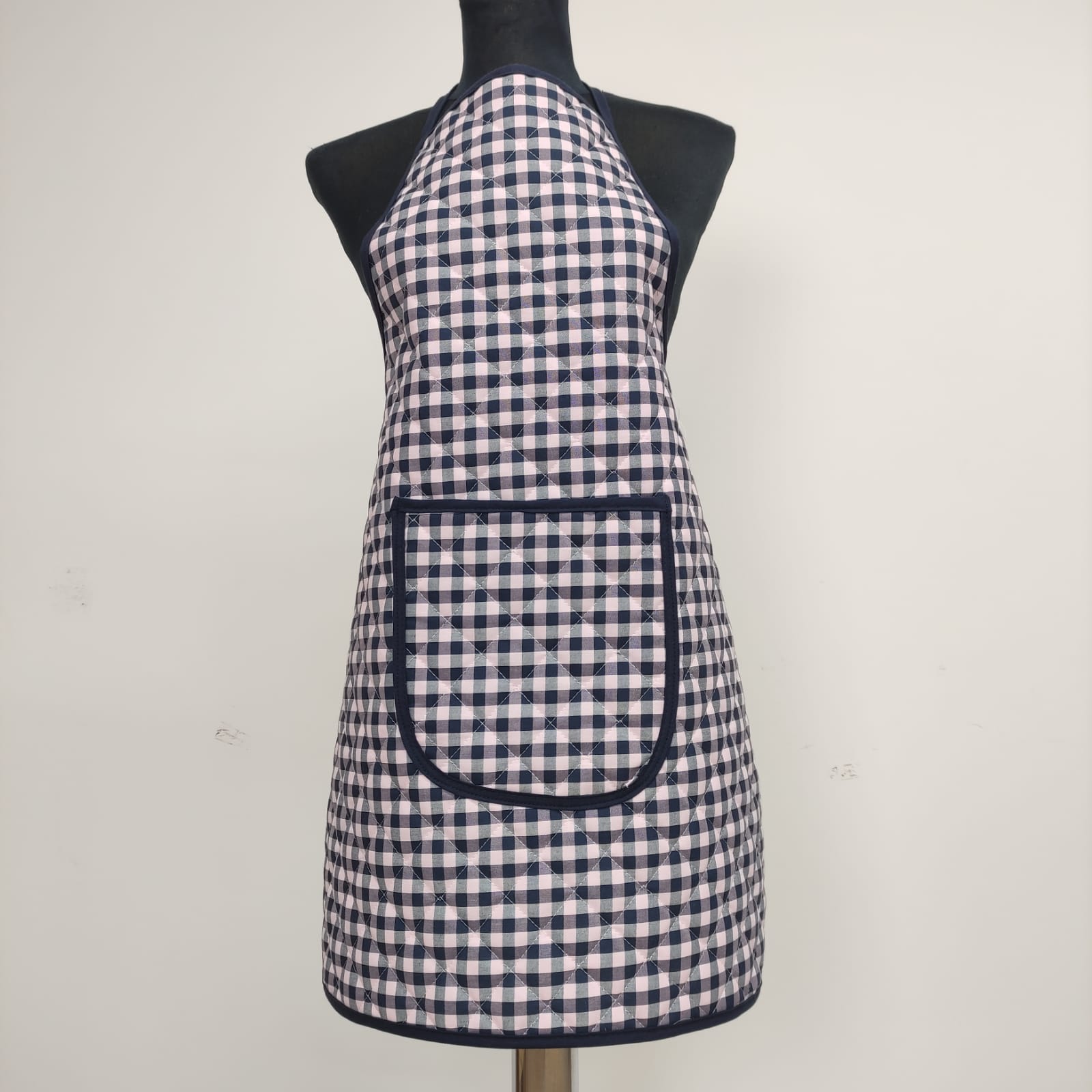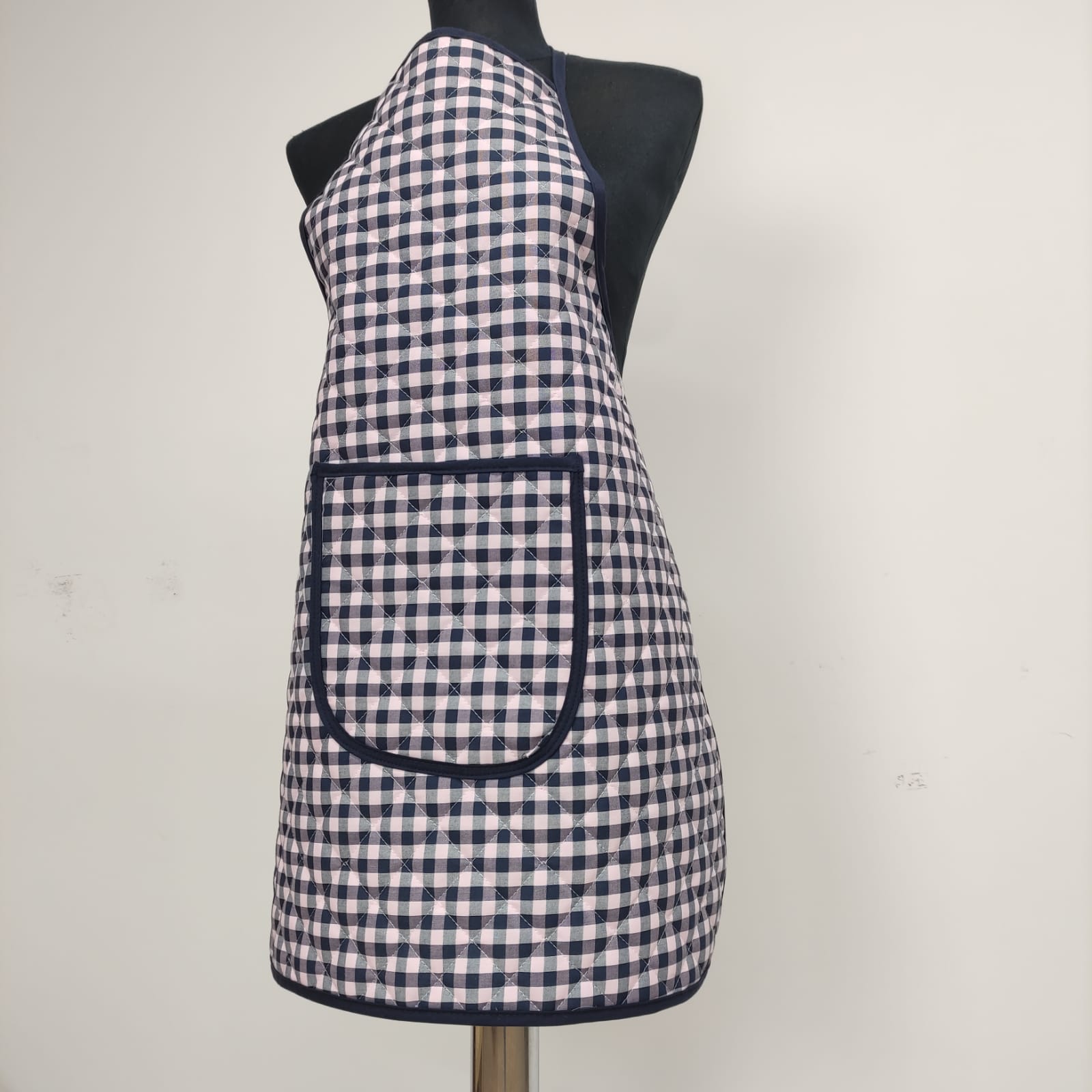 Avental acolchoado com padrão de quadradinhos, disponível em vermelho ou rosa.