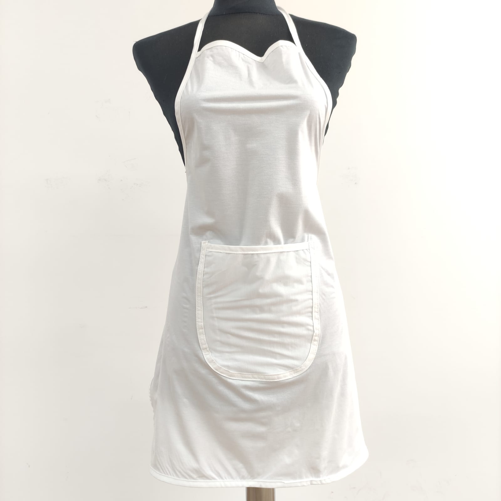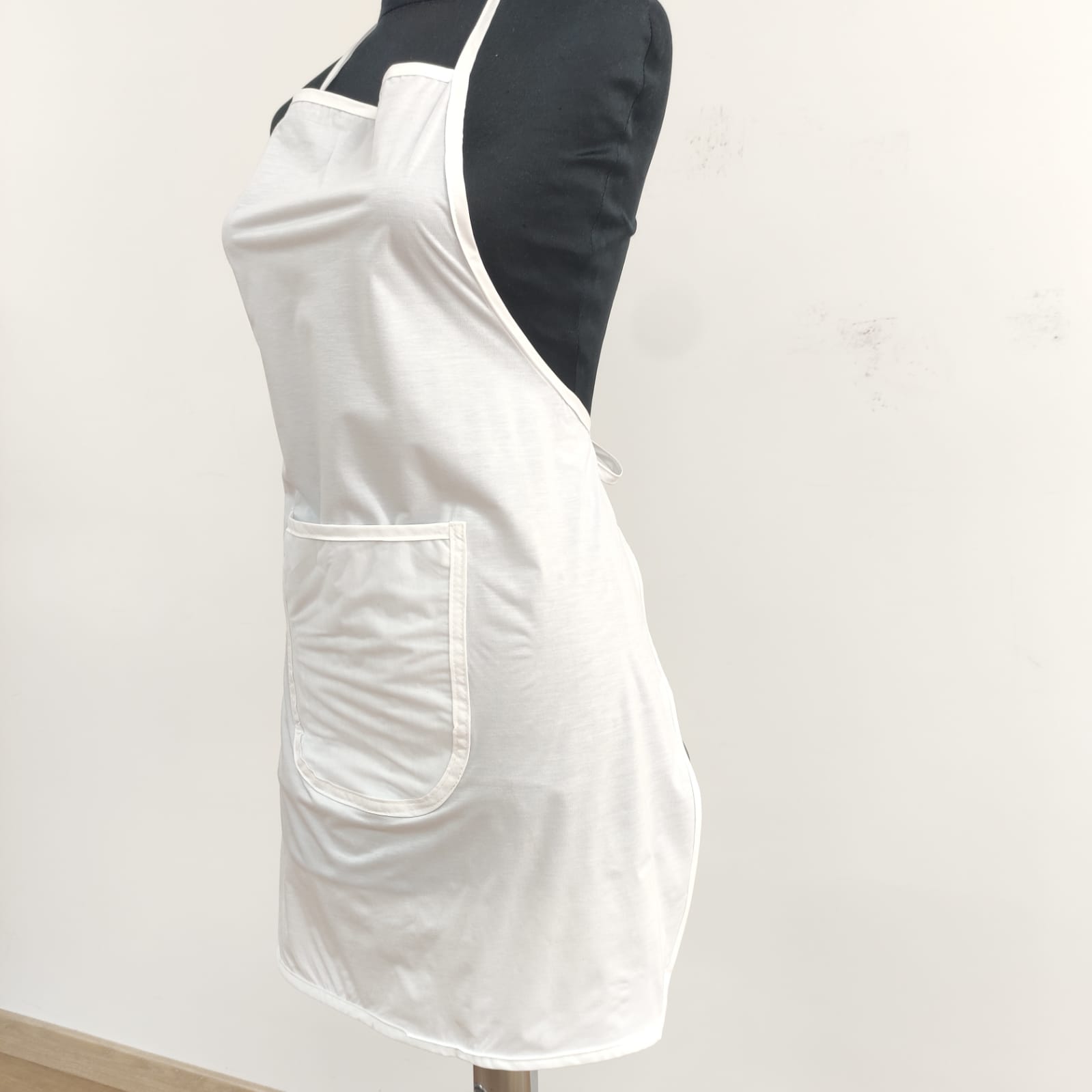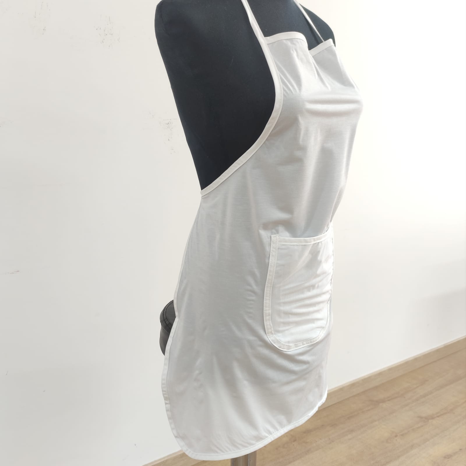 Avental na cor branca plastificado. Prático e de fácil lavagem.