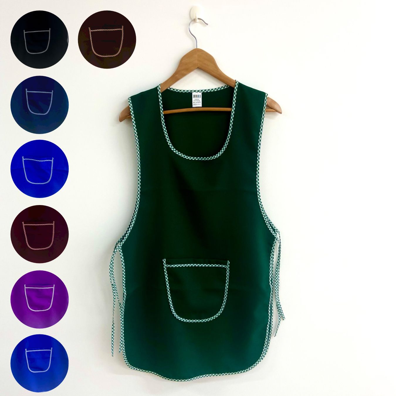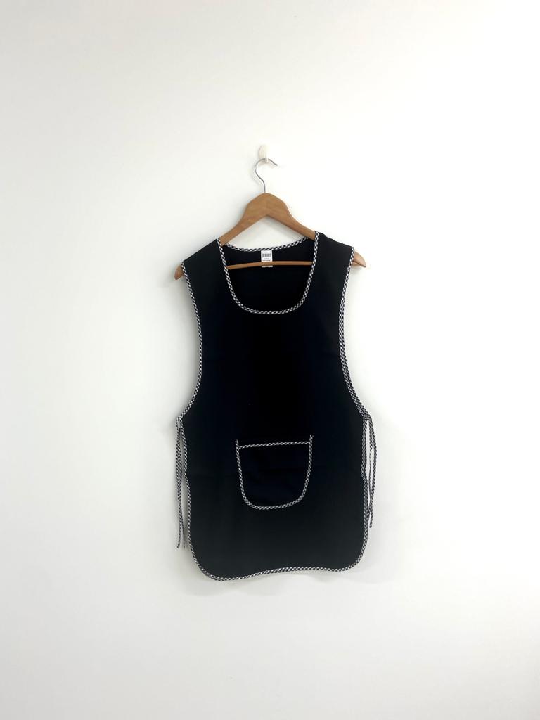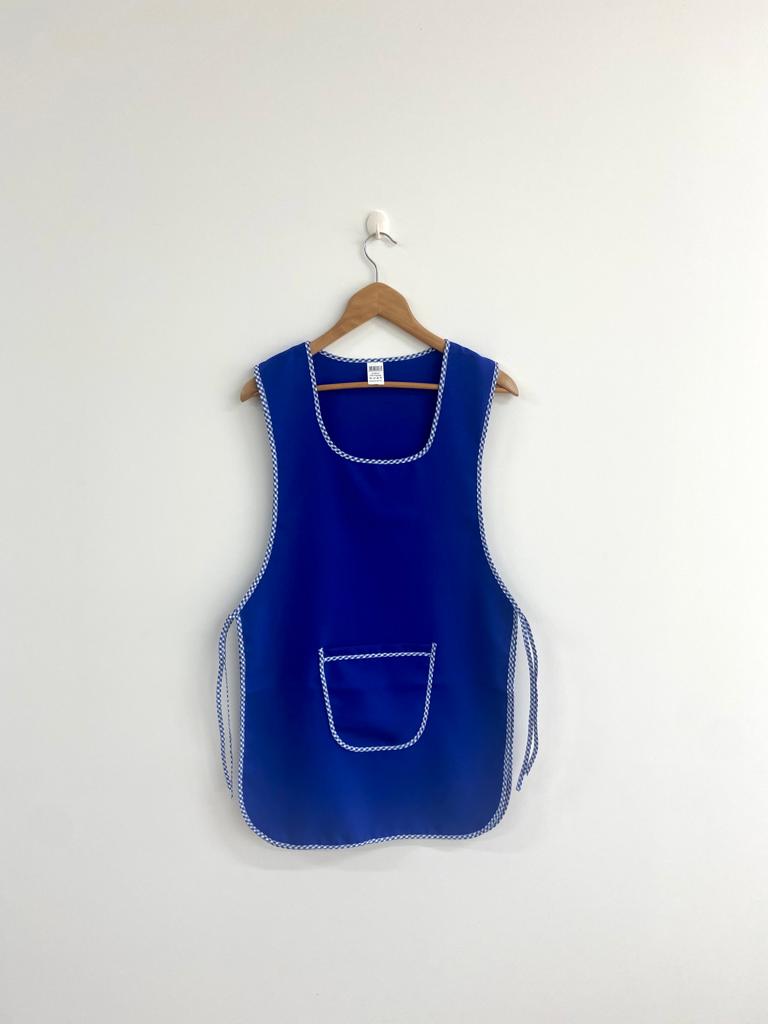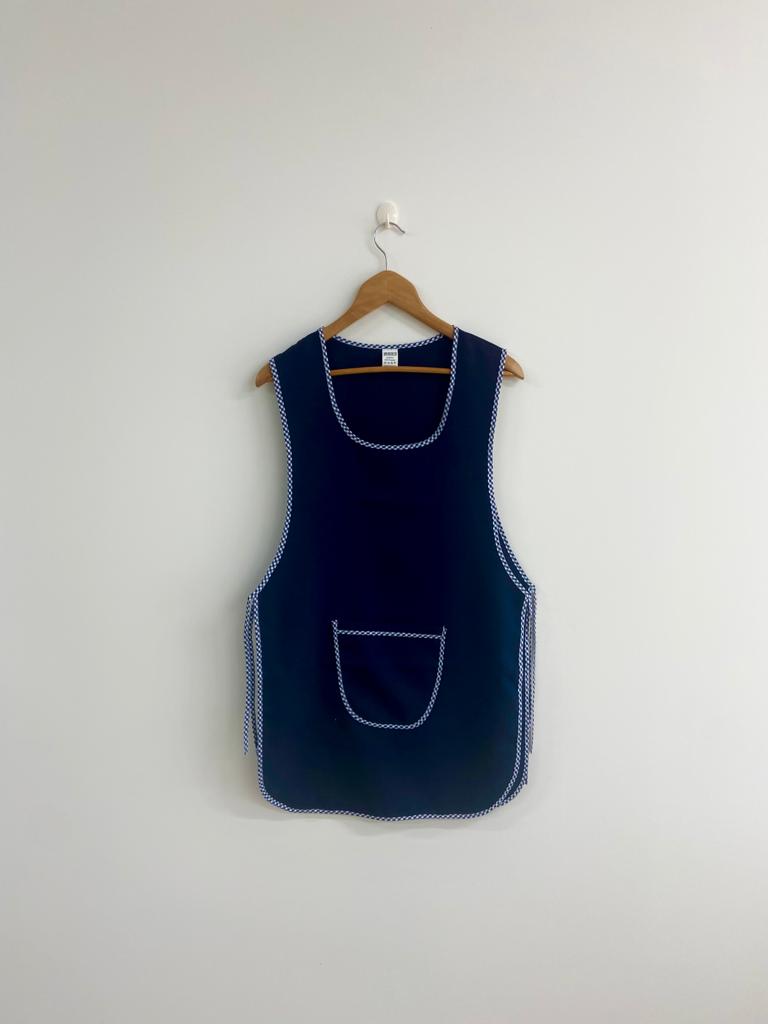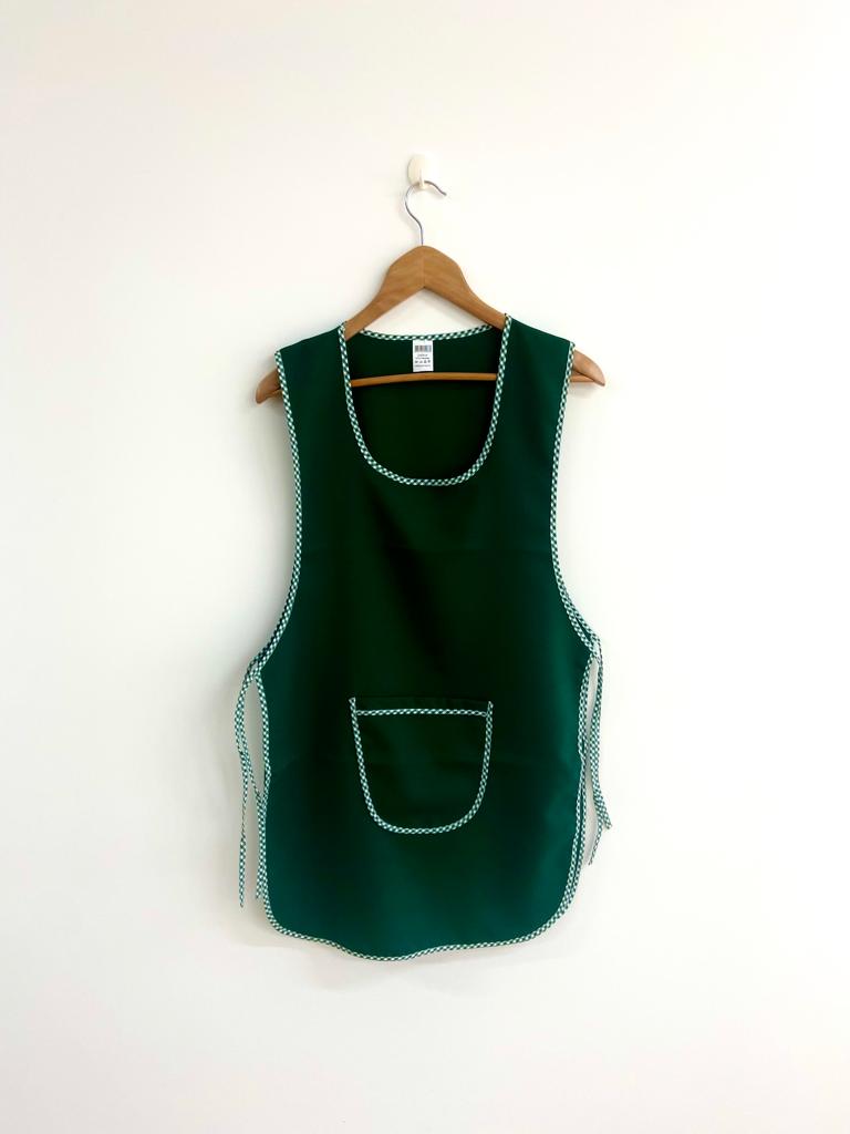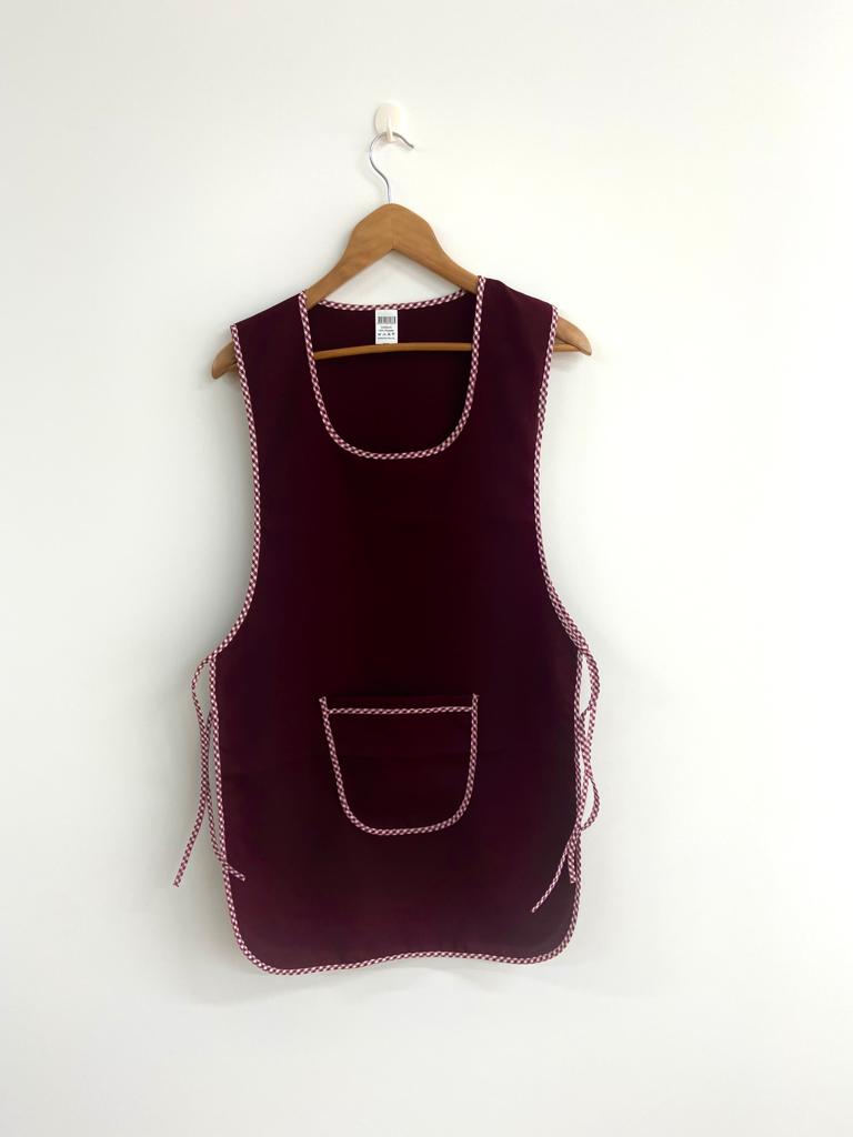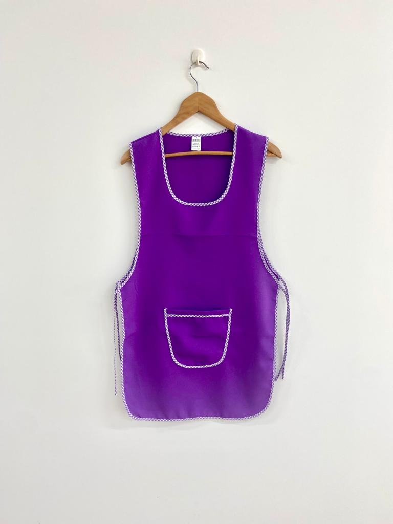 Avental de cor lisa com contorno em xadrez.