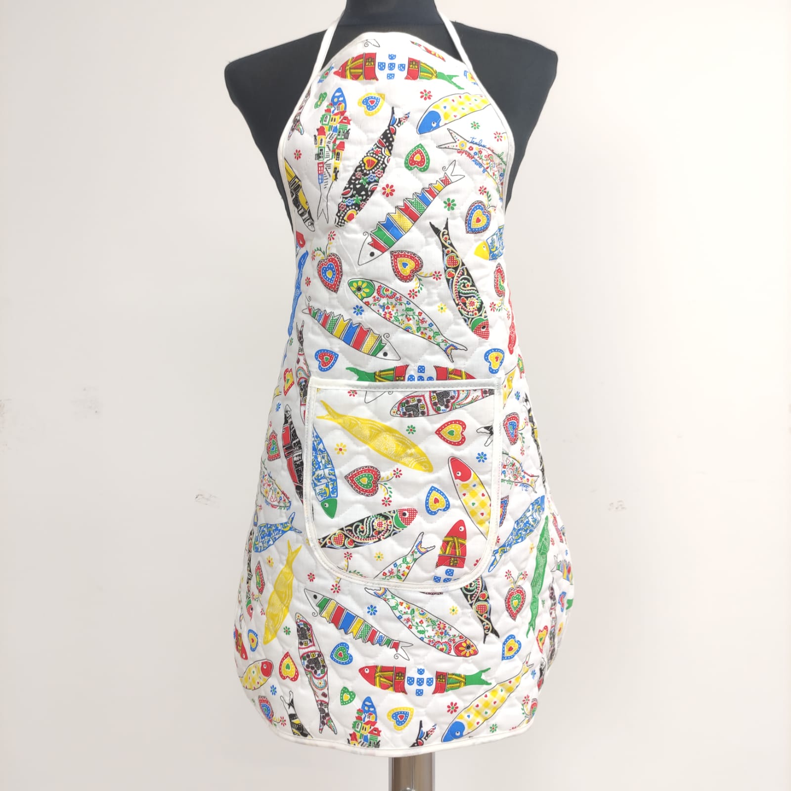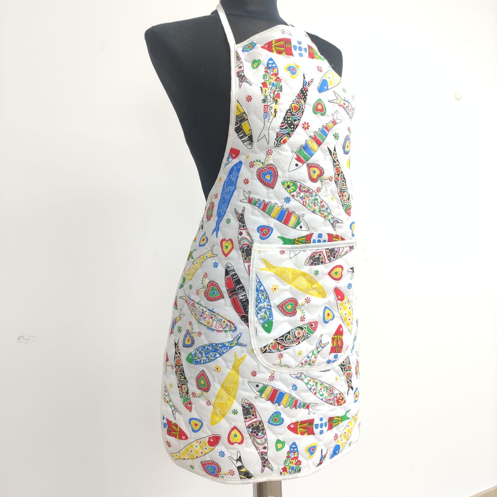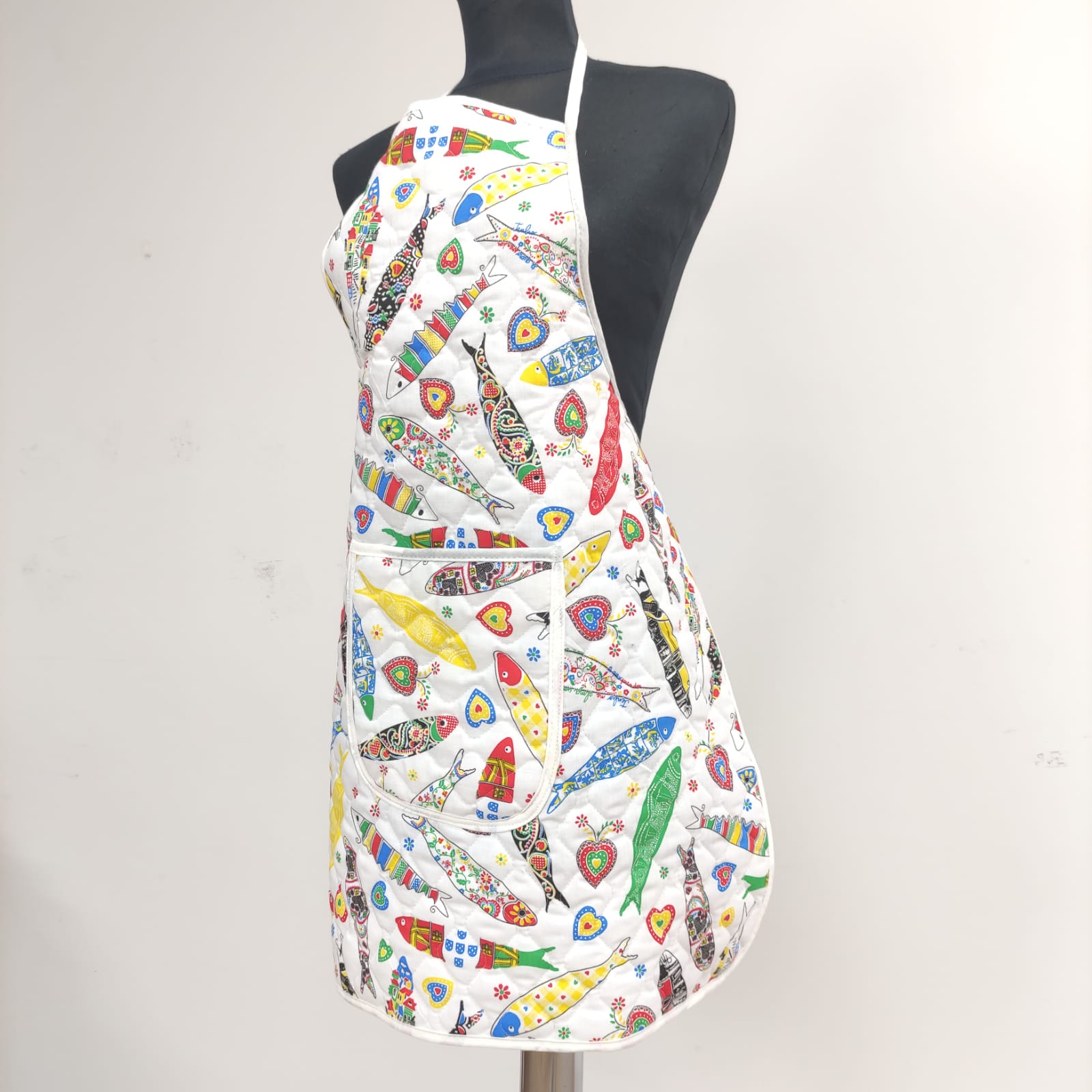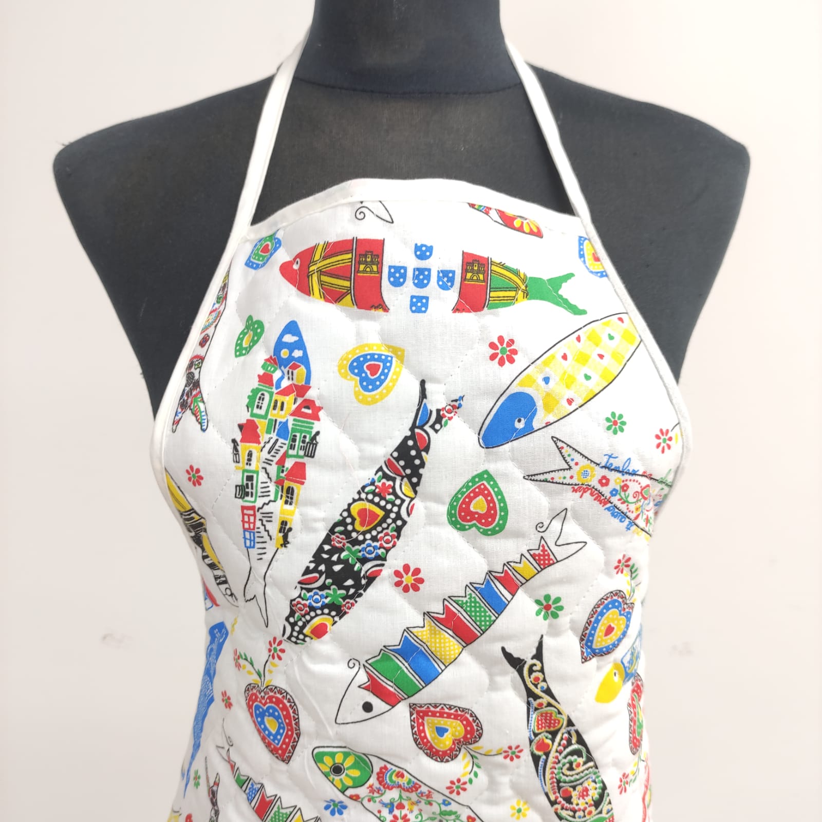 Avental acolchoado, disponivel em vários padrões de tecido estampado de cerejas, flores e sardinhas.