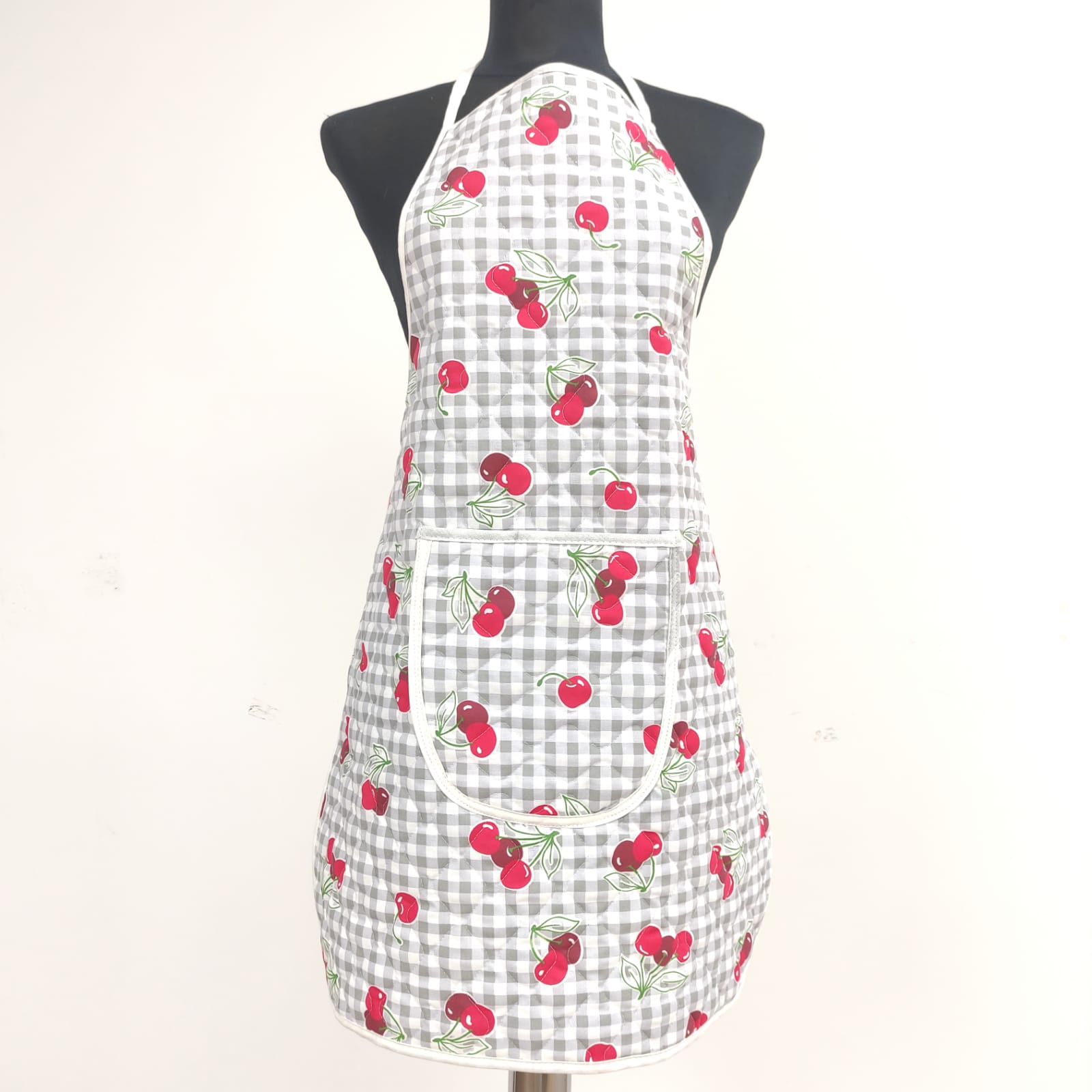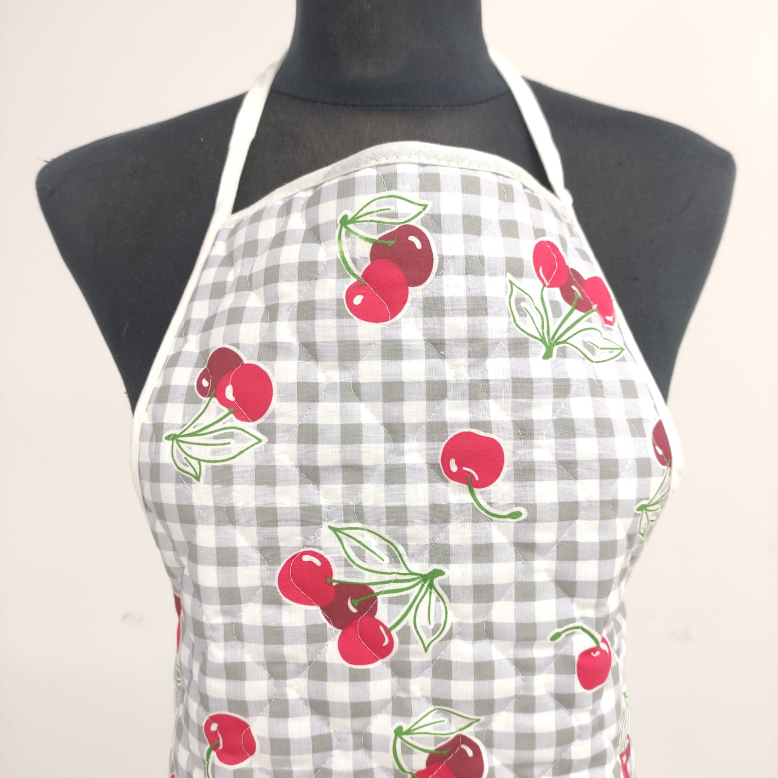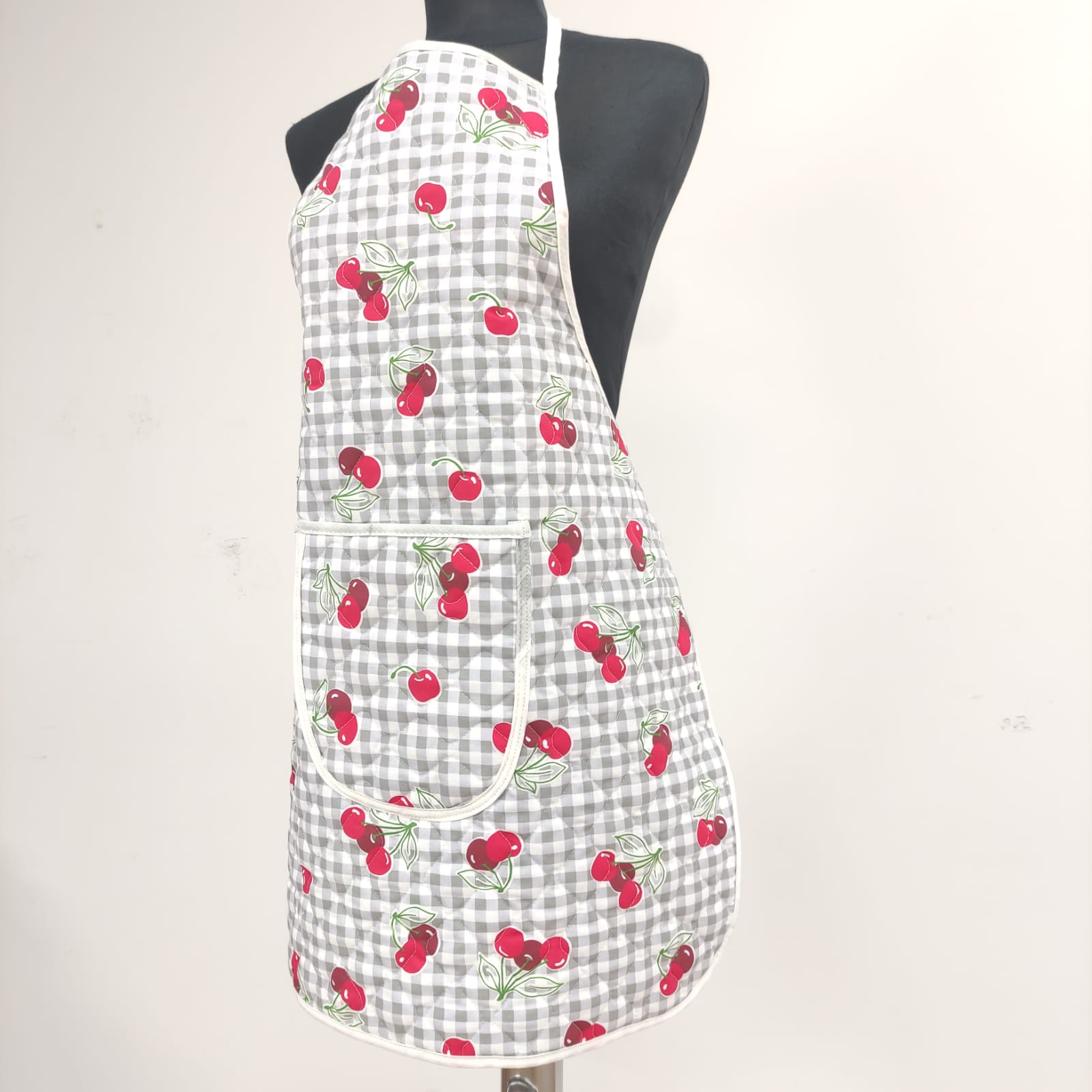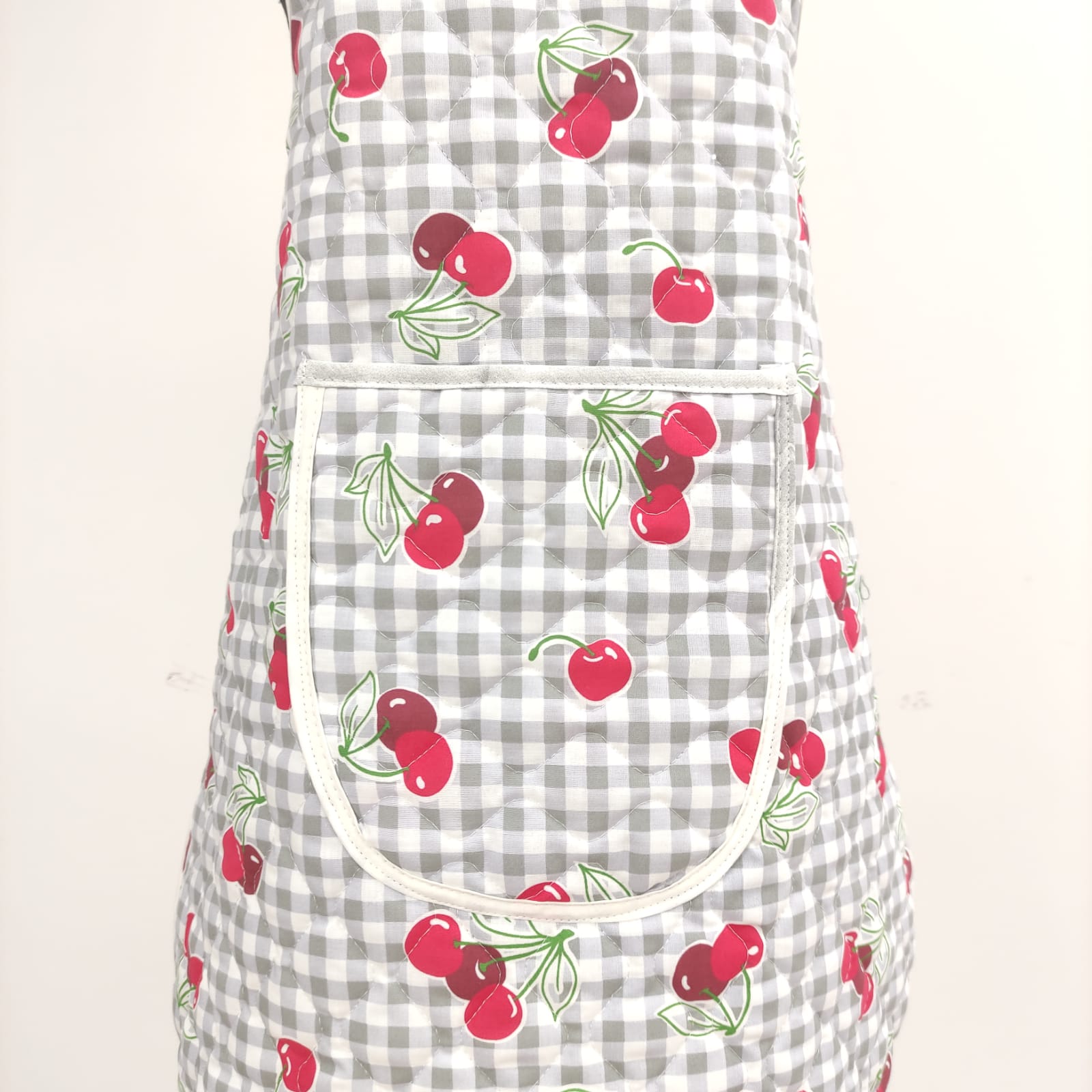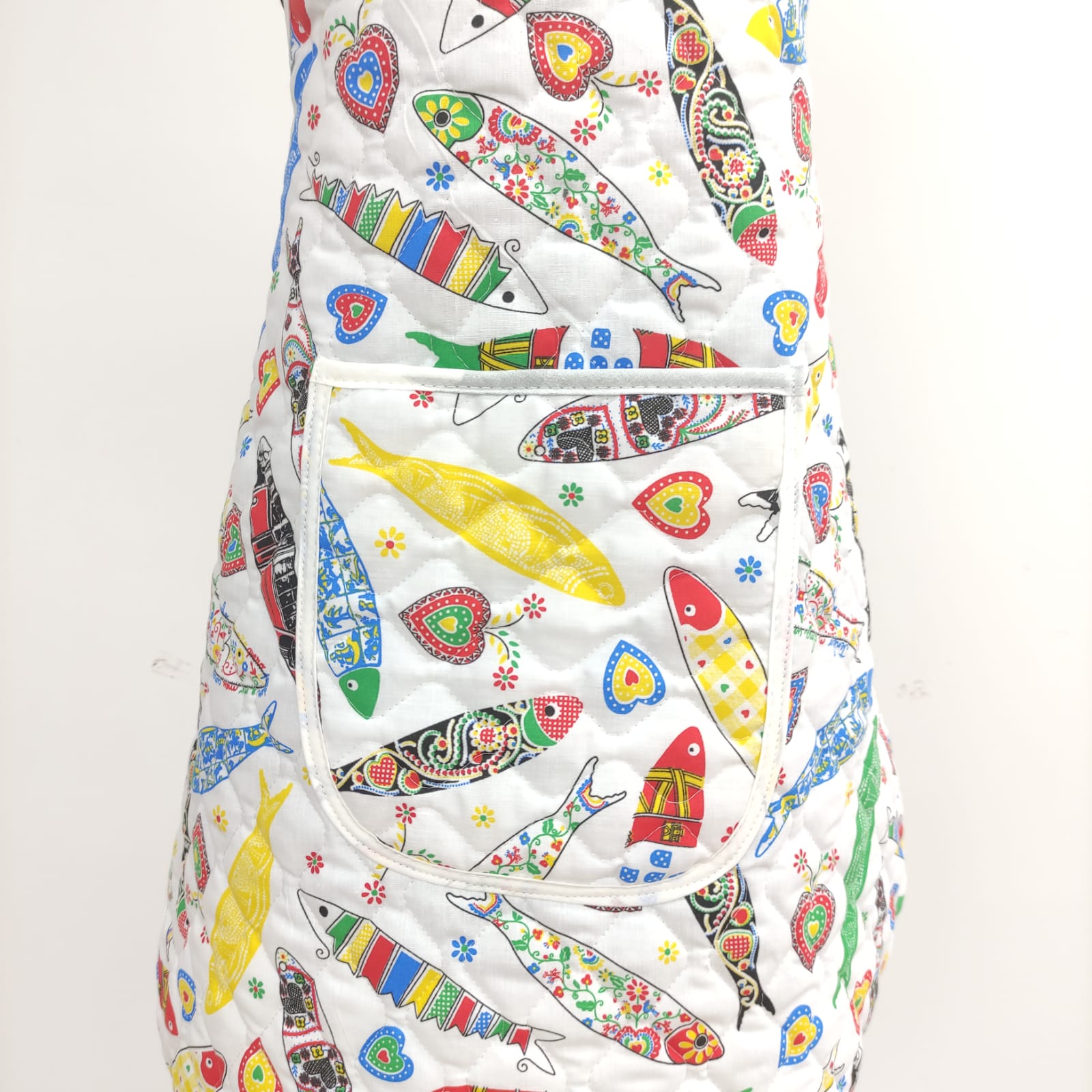 Avental acolchoado, disponivel em vários padrões de tecido estampado de cerejas, flores e sardinhas.
