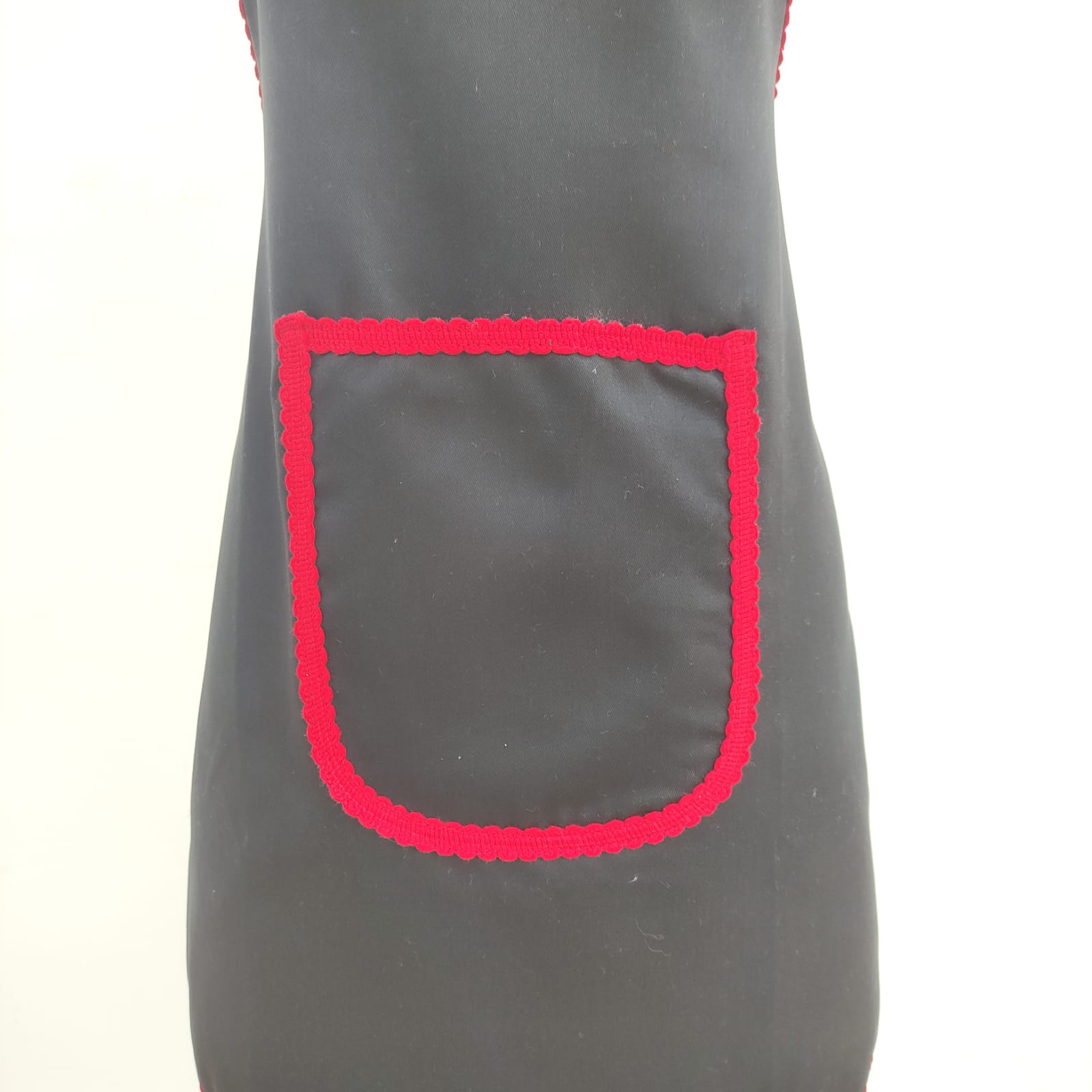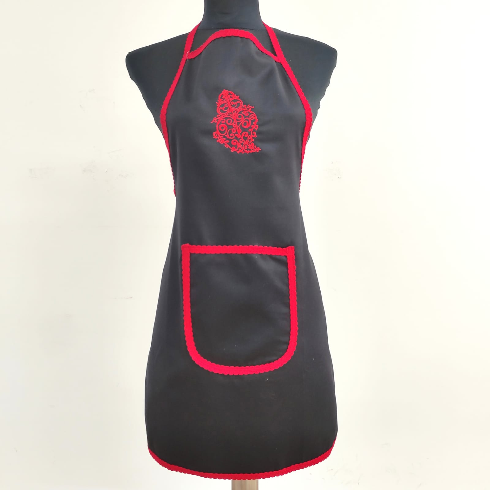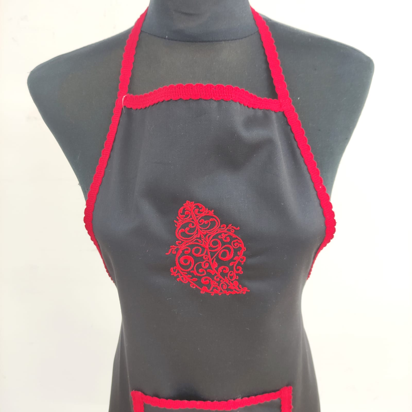 Avental Sarja em tecido preto com aplicação de um coração de Viana bordado na parte superior do avental.