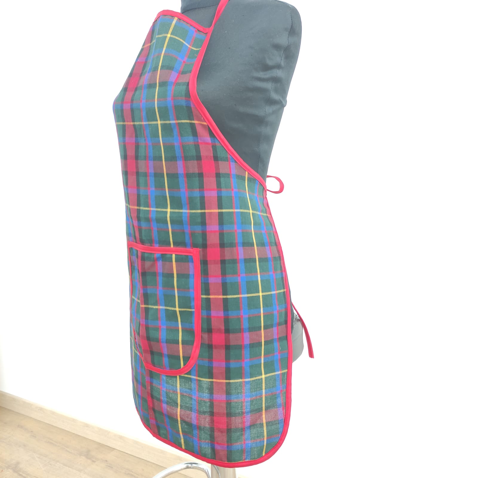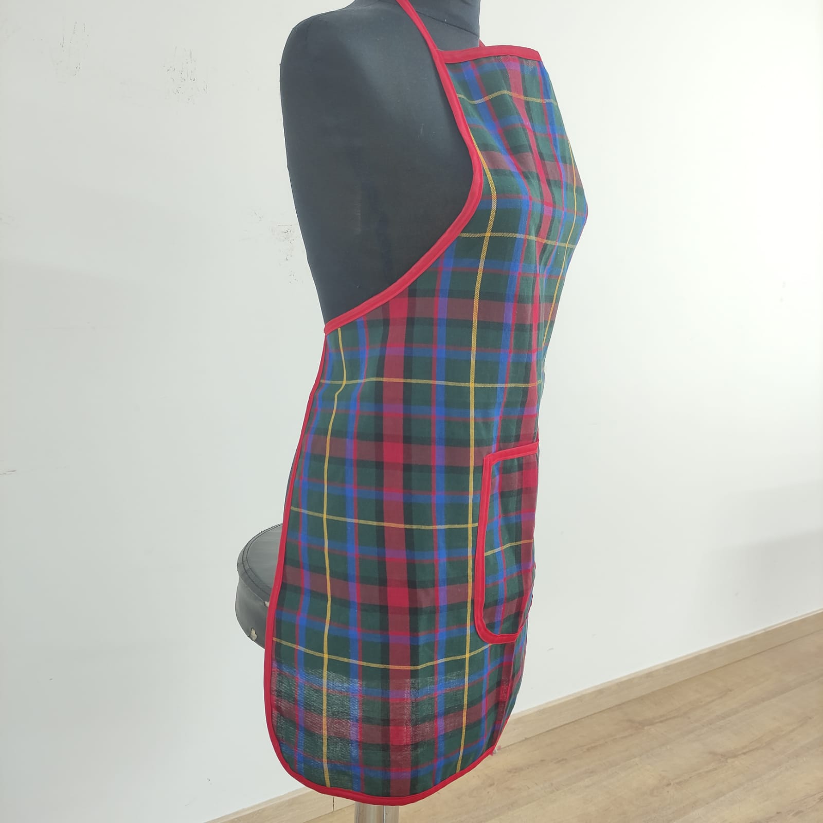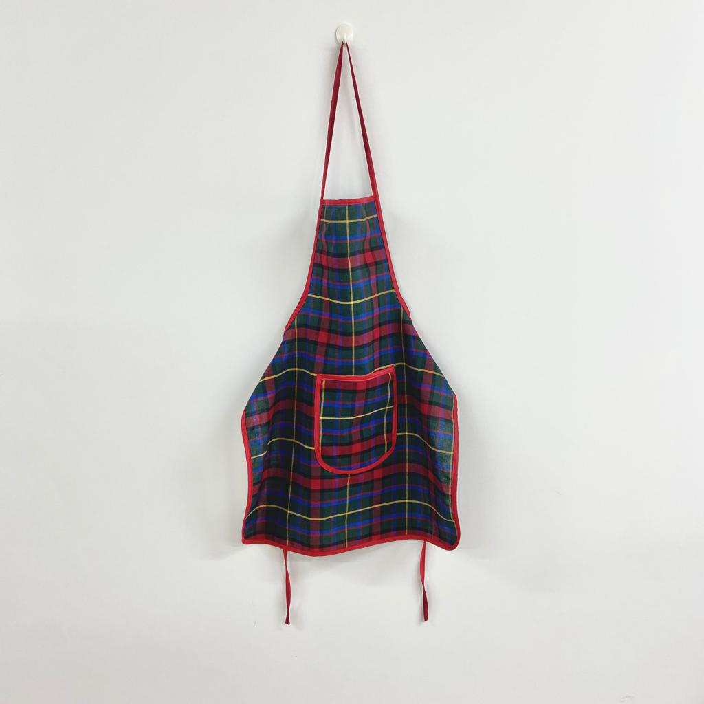 Avental Xadrez Lapónia, em sarja padrão xadrez em tons de vermelho, verde e azul.