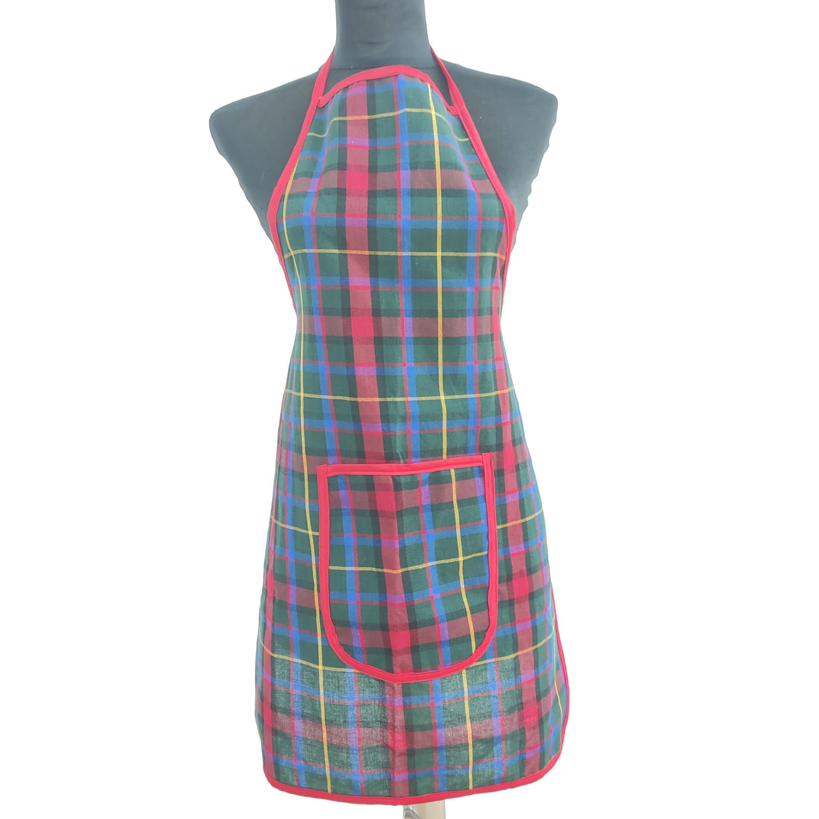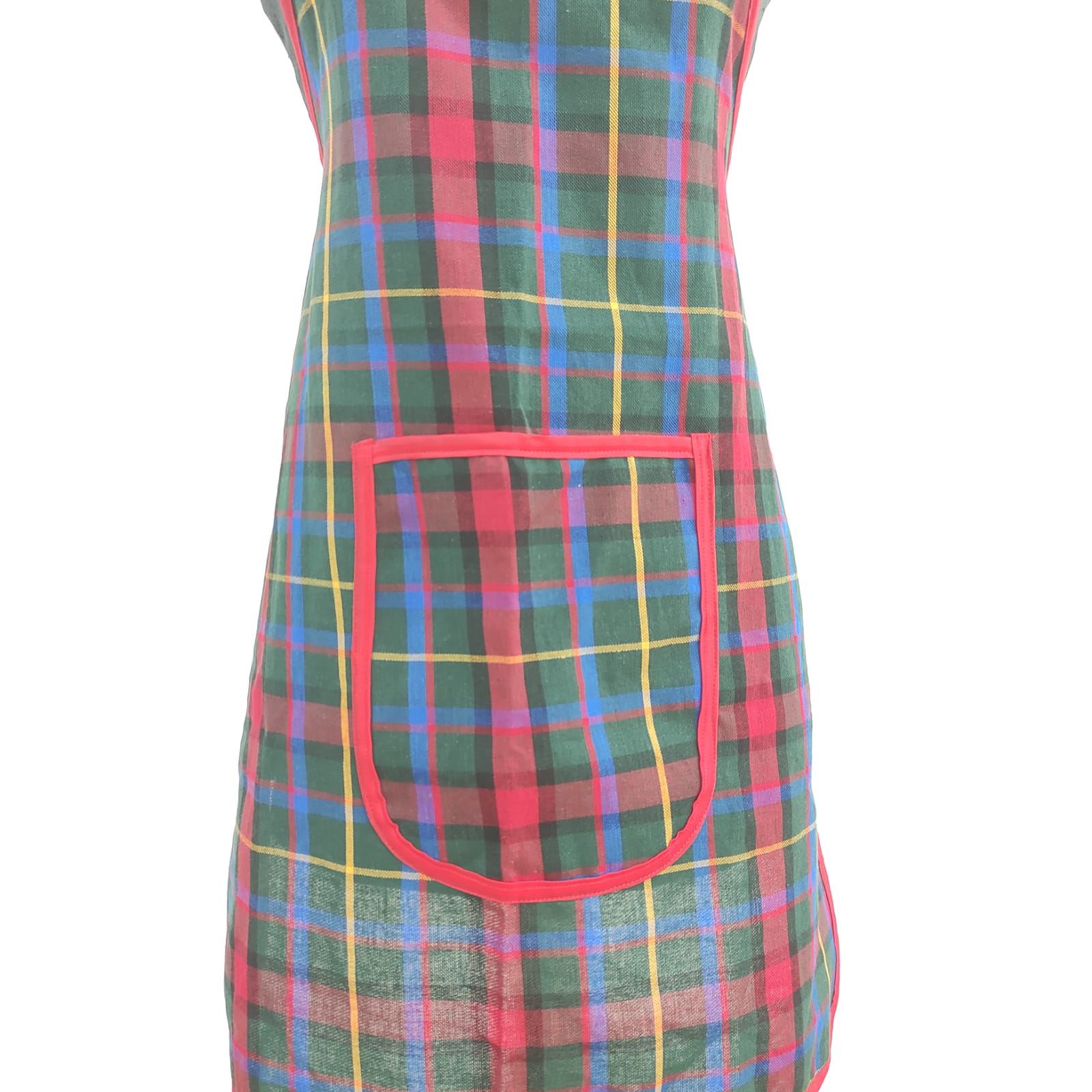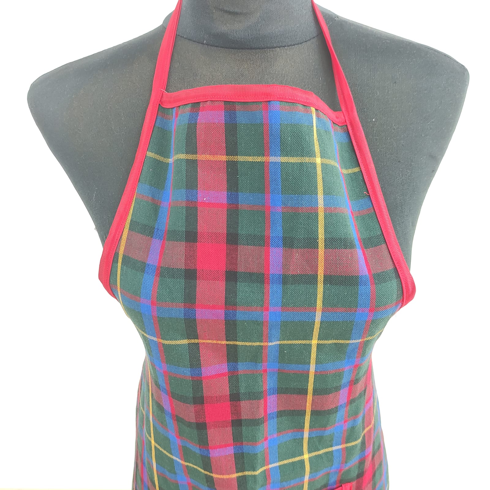 Avental Xadrez Lapónia, em sarja padrão xadrez em tons de vermelho, verde e azul.