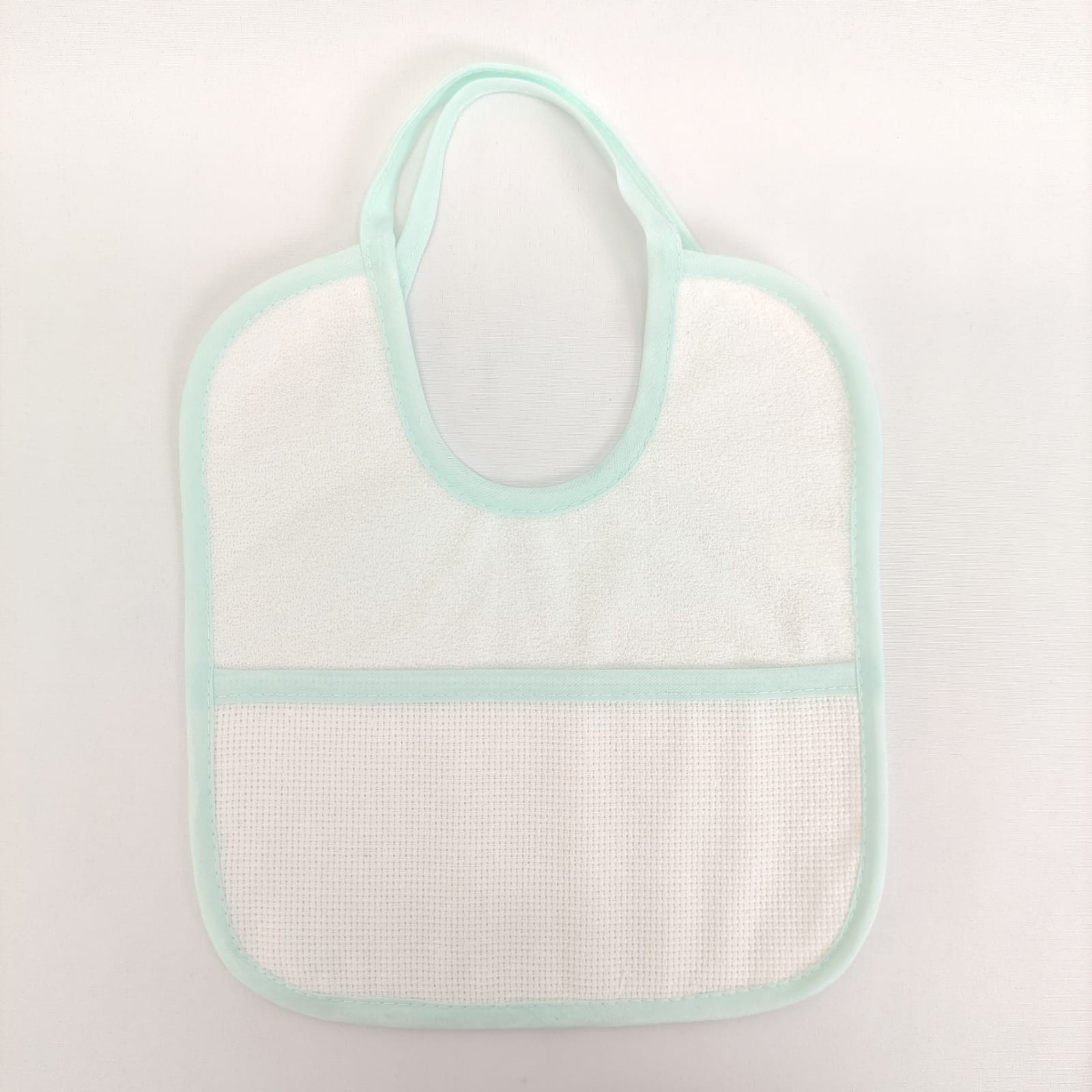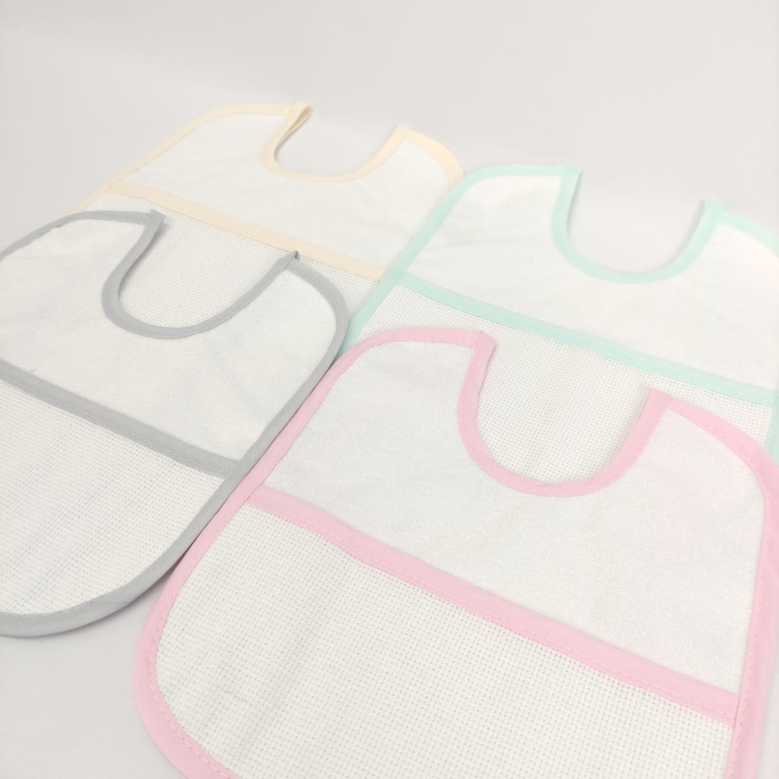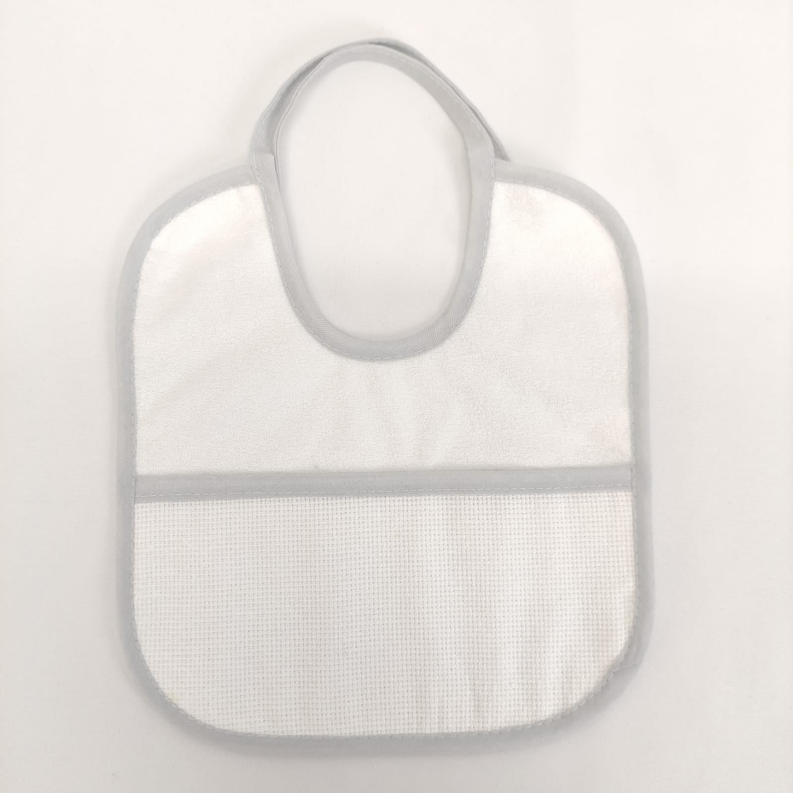 Babete com bolso para bordar e forro com plástico adaptado ao corpo do bebé.