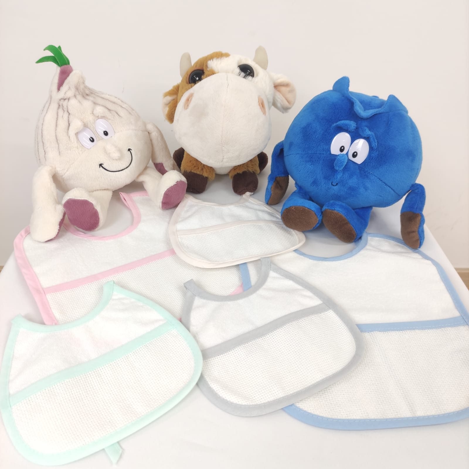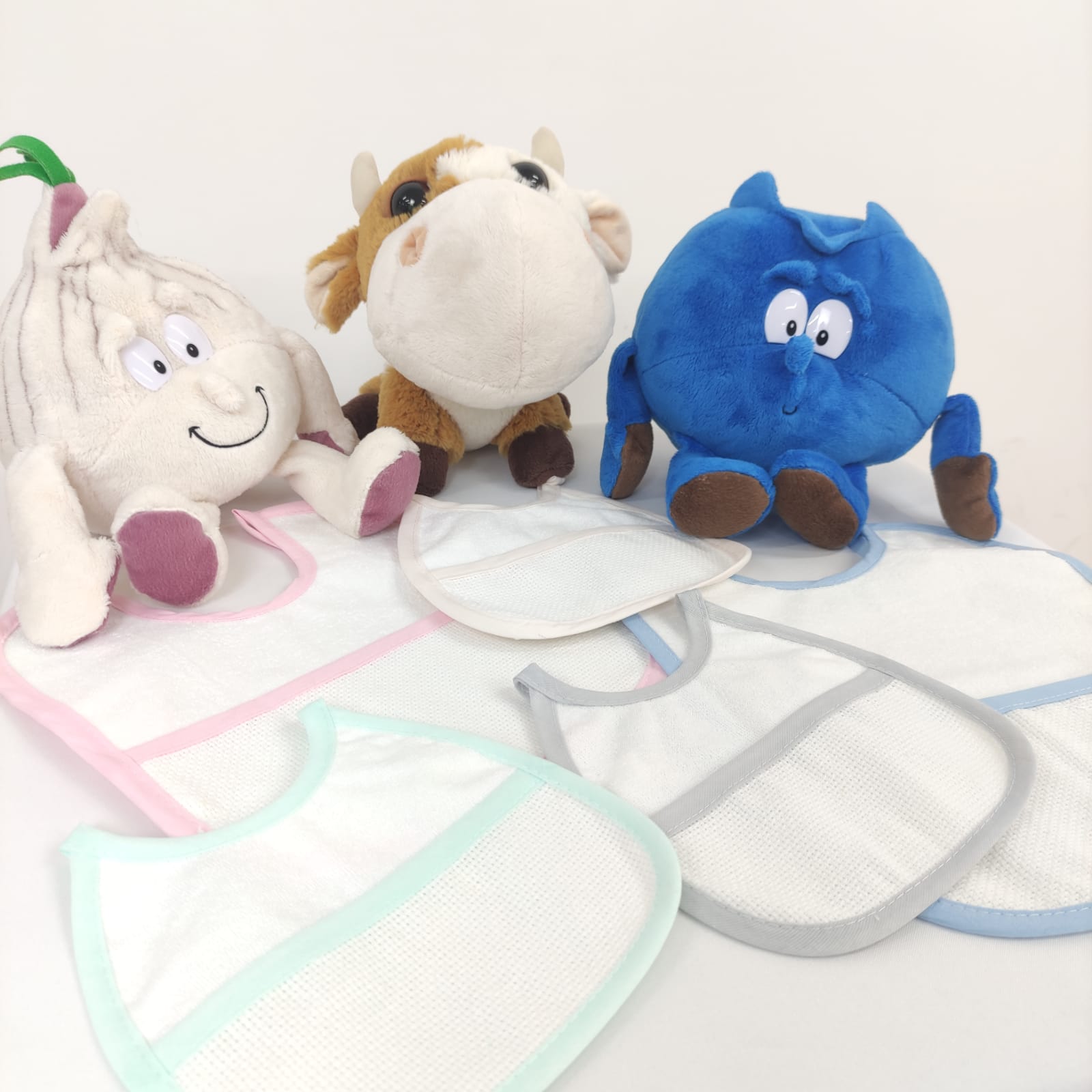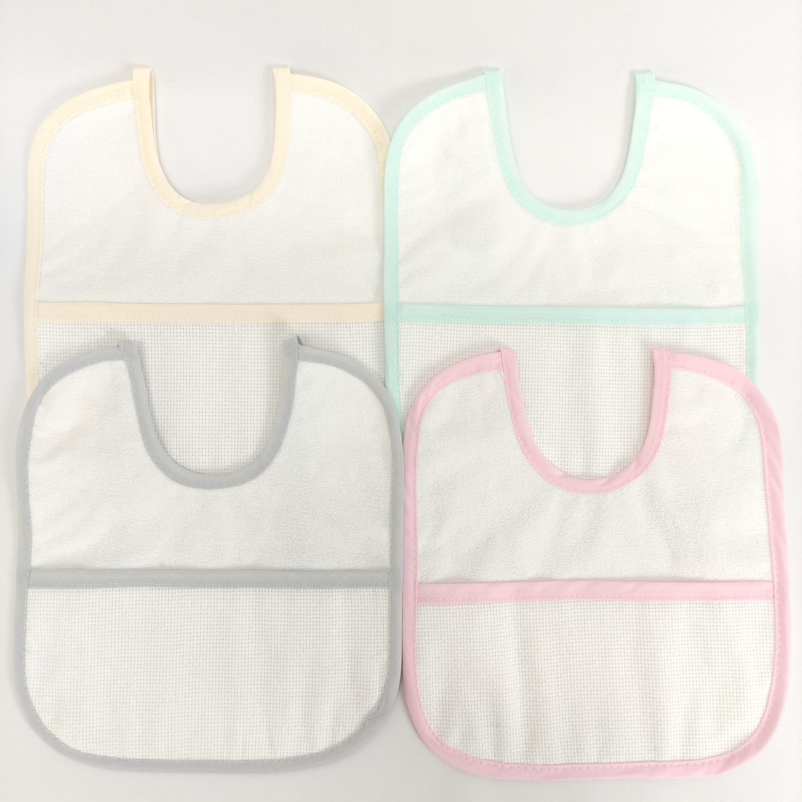 Babete com bolso para bordar e forro com plástico adaptado ao corpo do bebé.