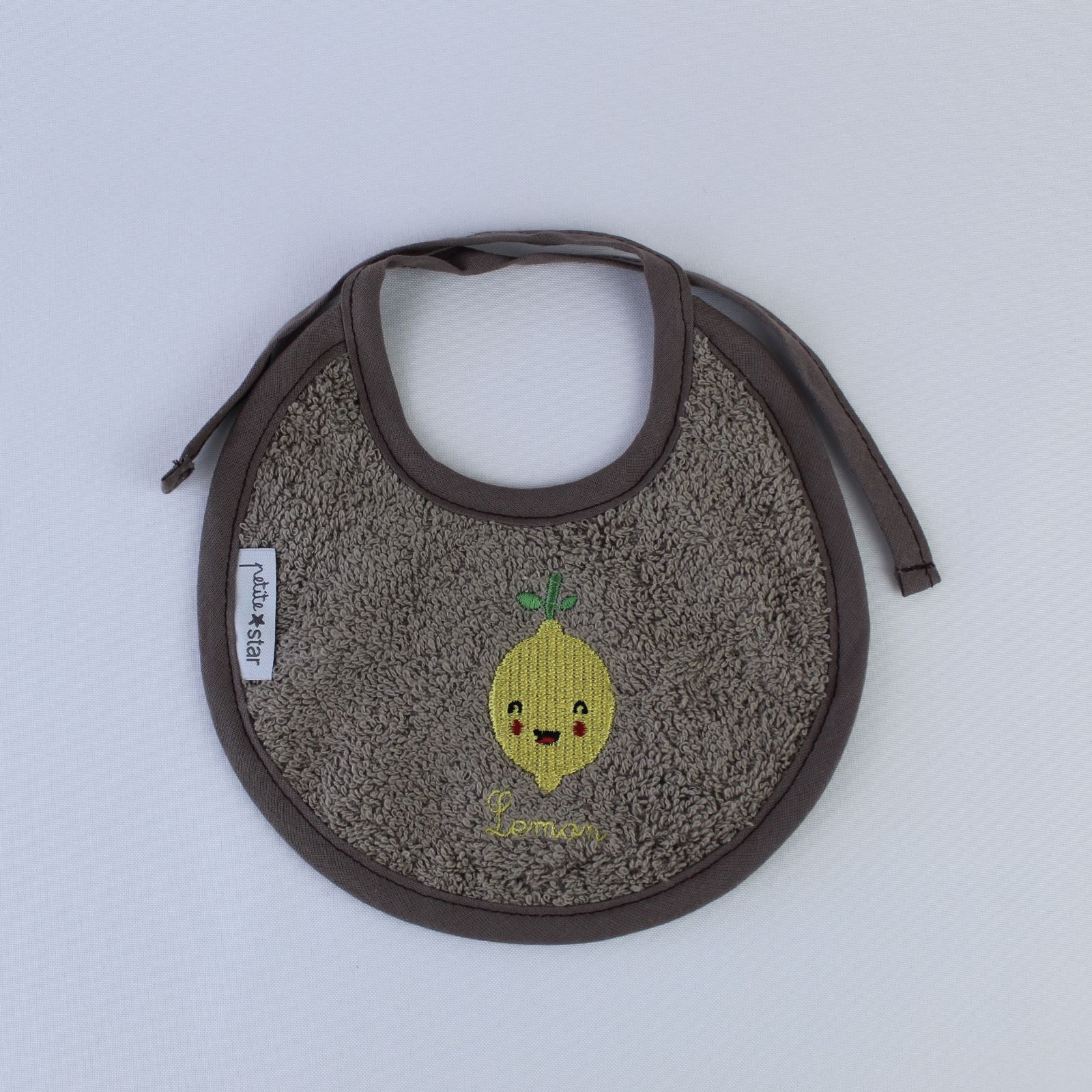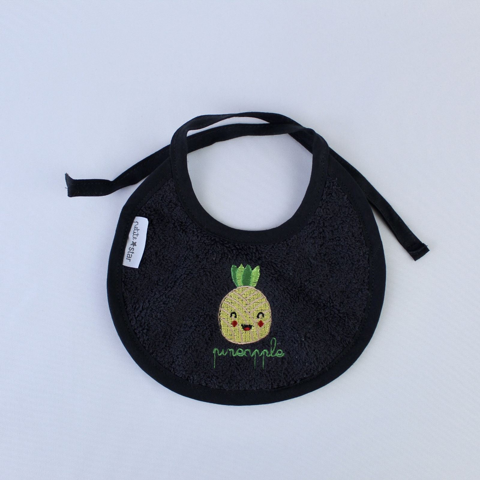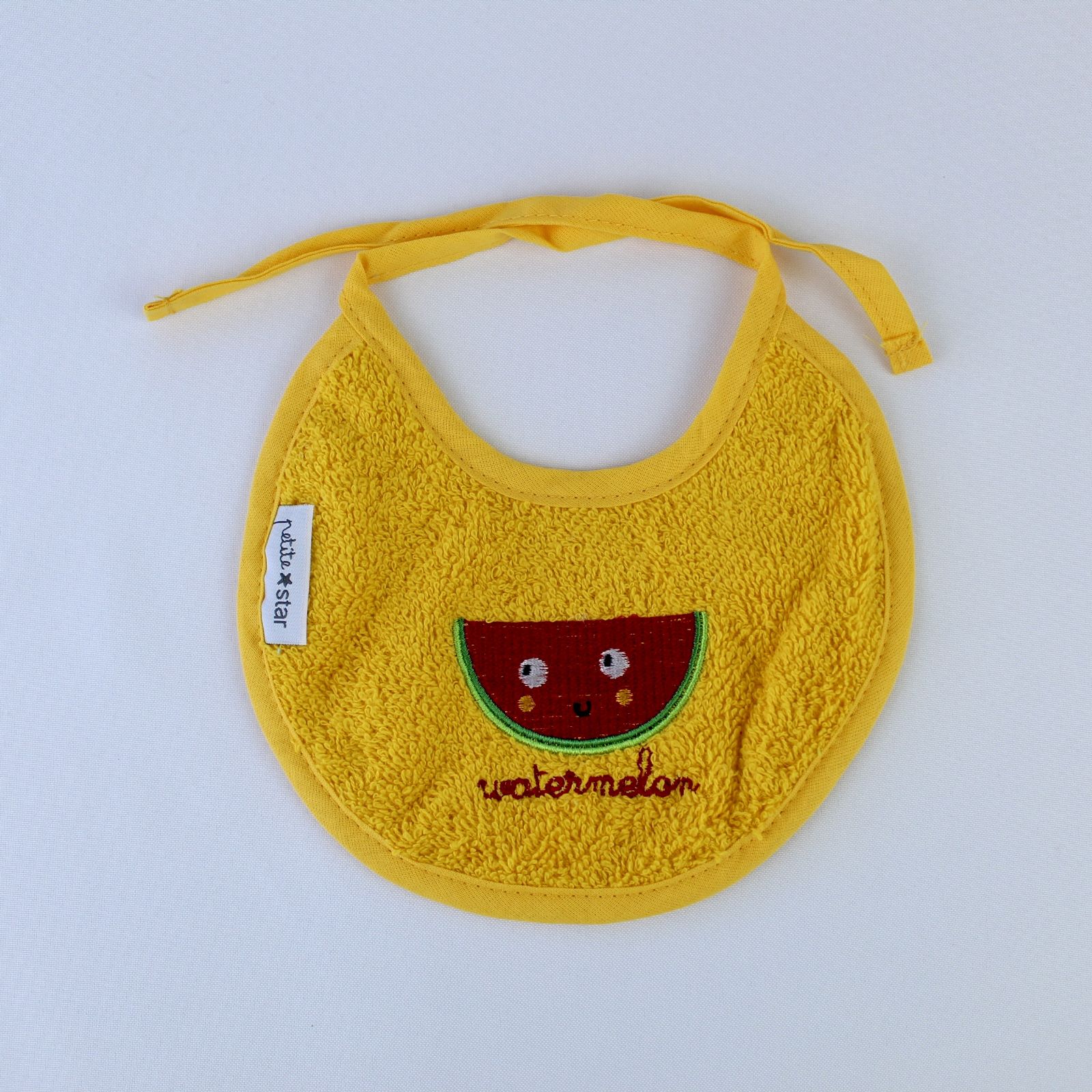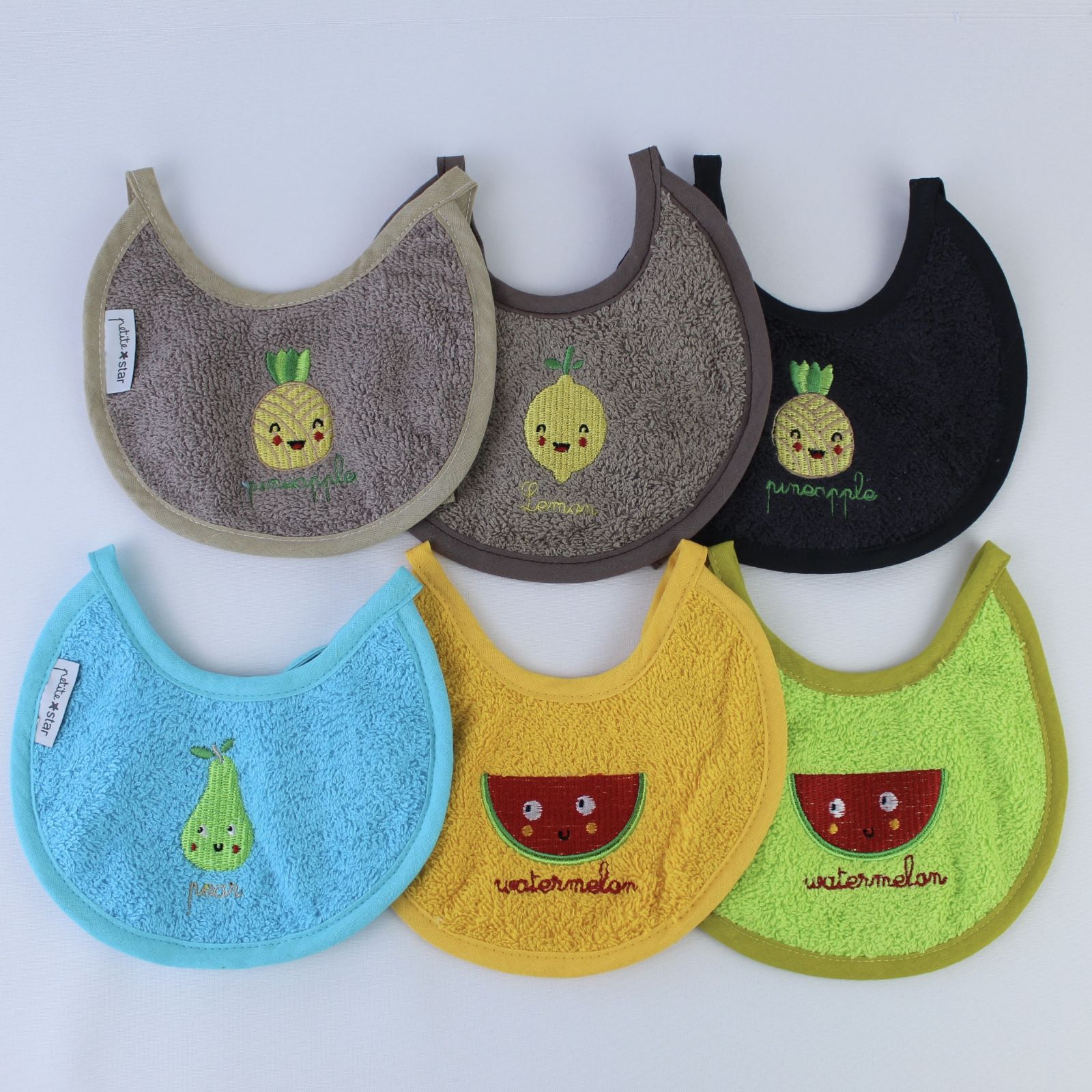 Babete Redonda com bordado de fruta e respetivo nome em inglês. Forro impermeável.