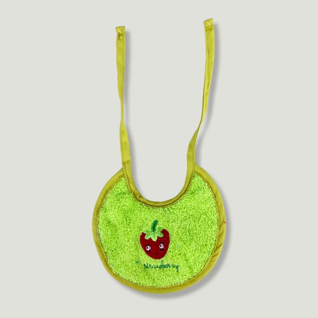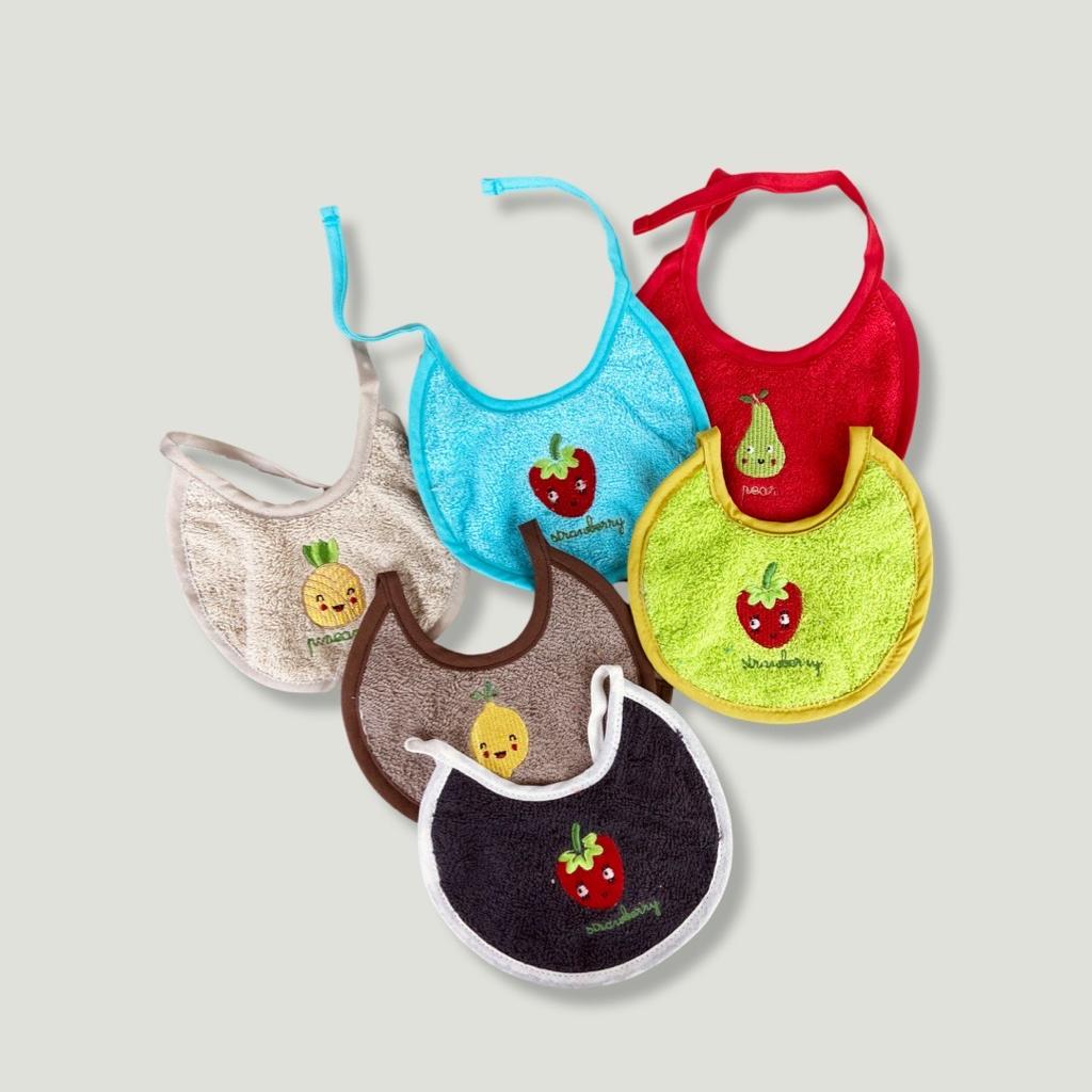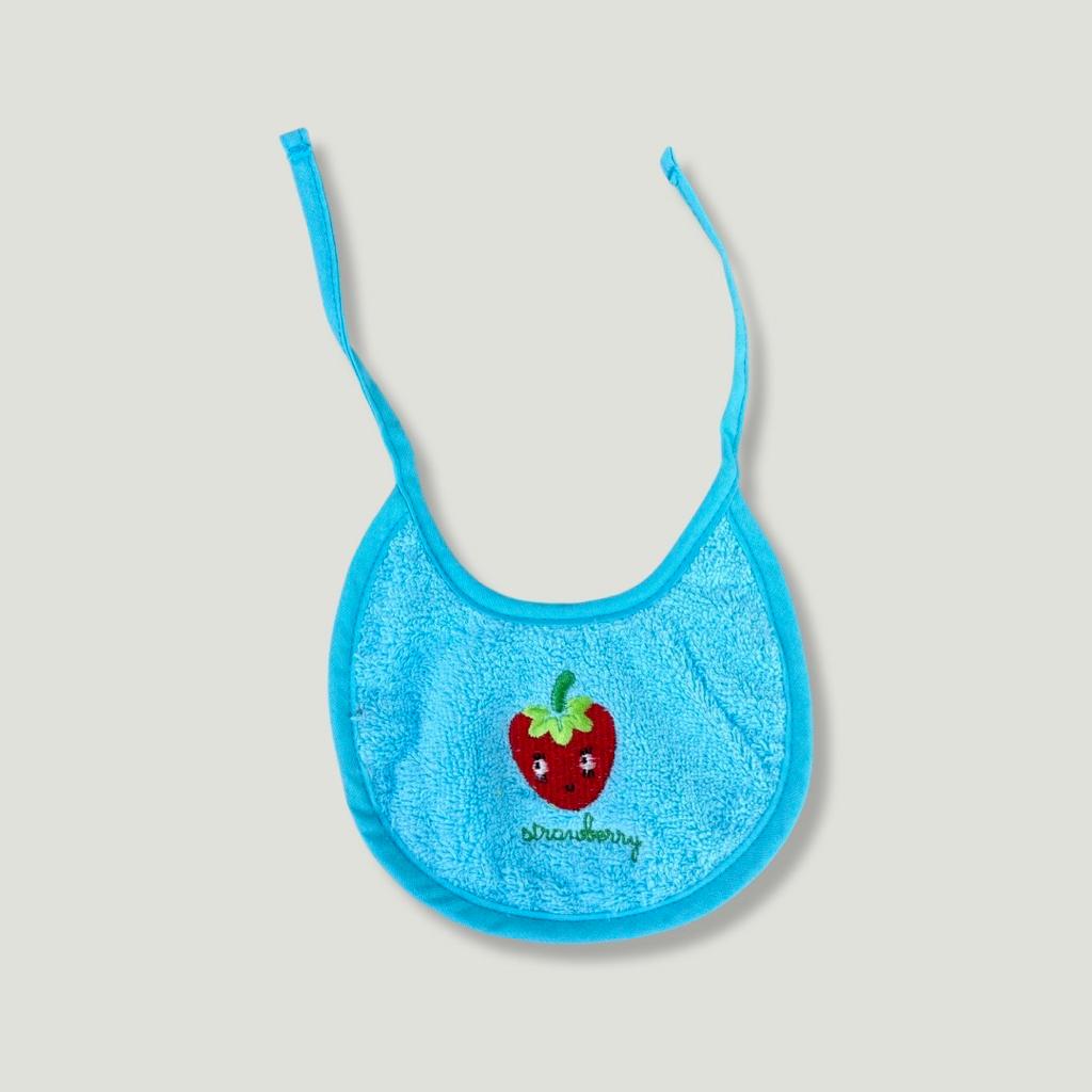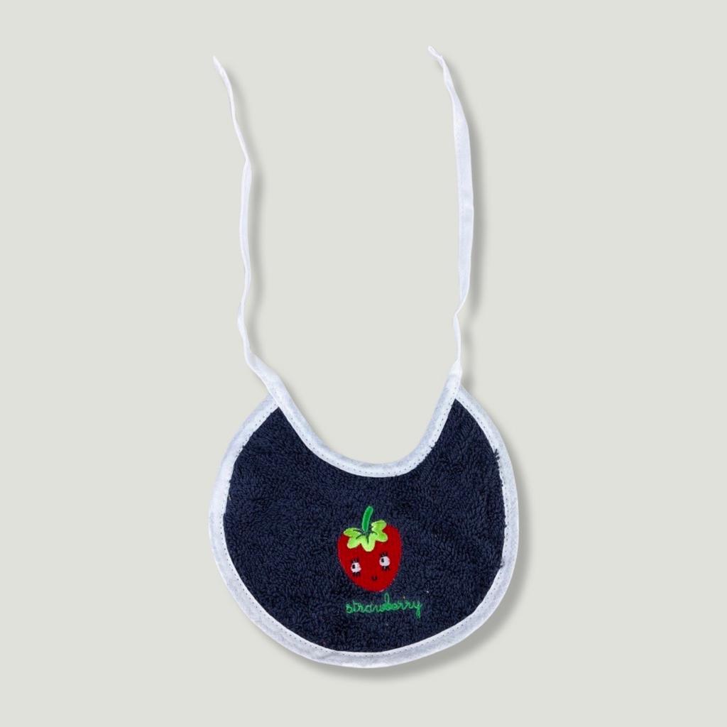 Babete Redonda com bordado de fruta e respetivo nome em inglês. Forro impermeável.