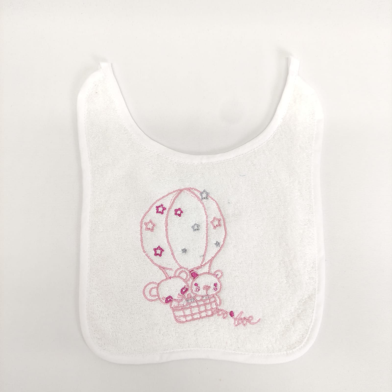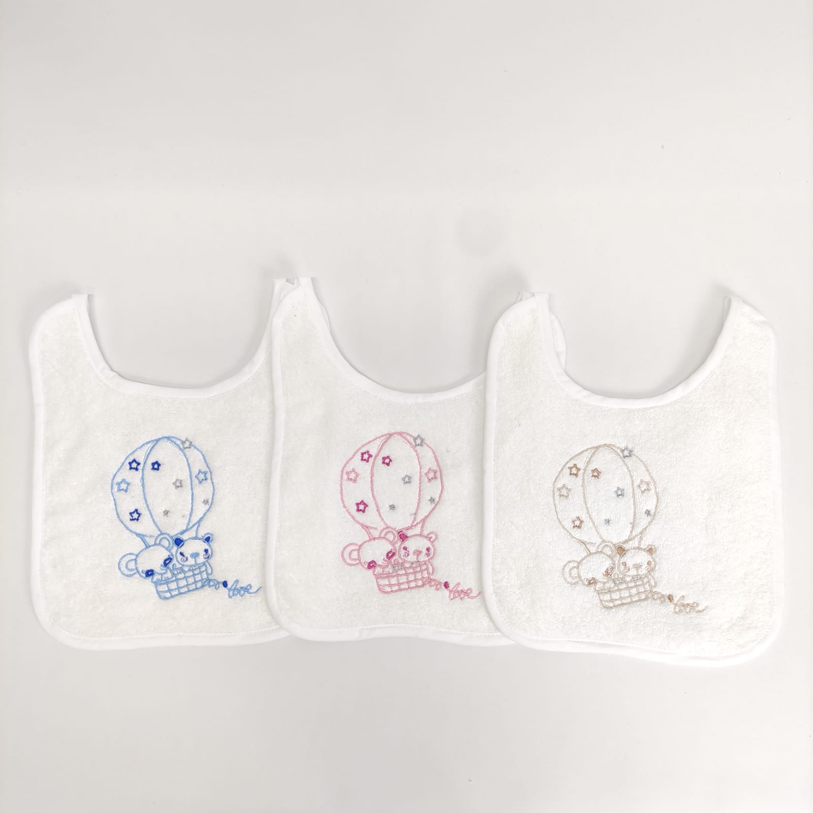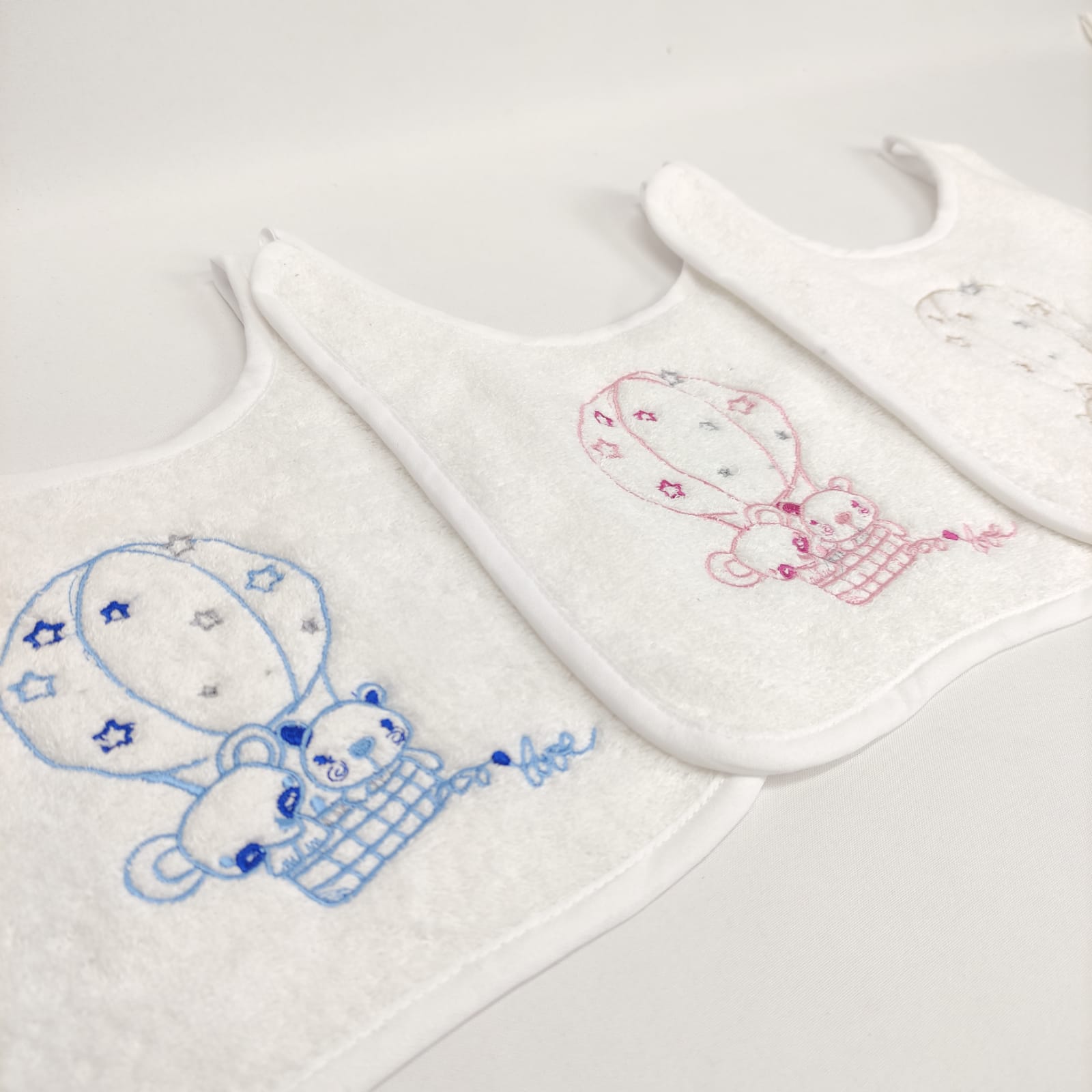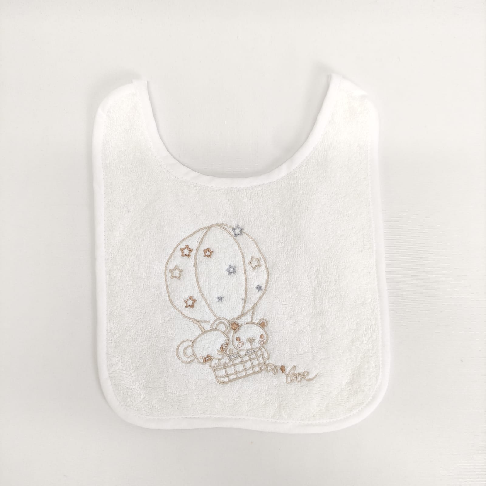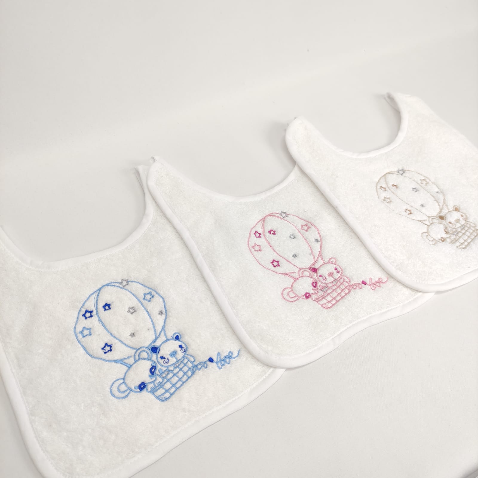 Babete em felpo suave e confortável, com bordado infantil "balões". Disponível em azul, bege, rosa ou verde