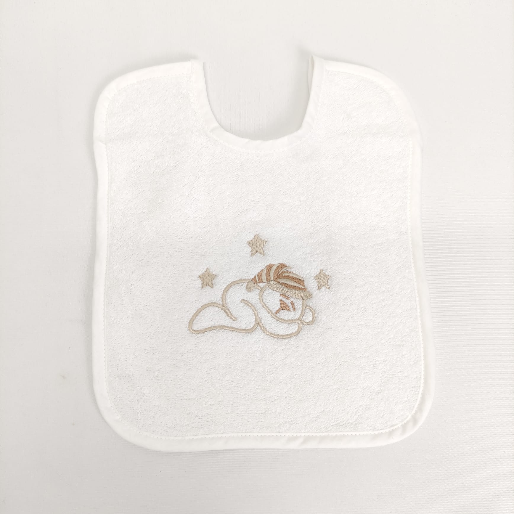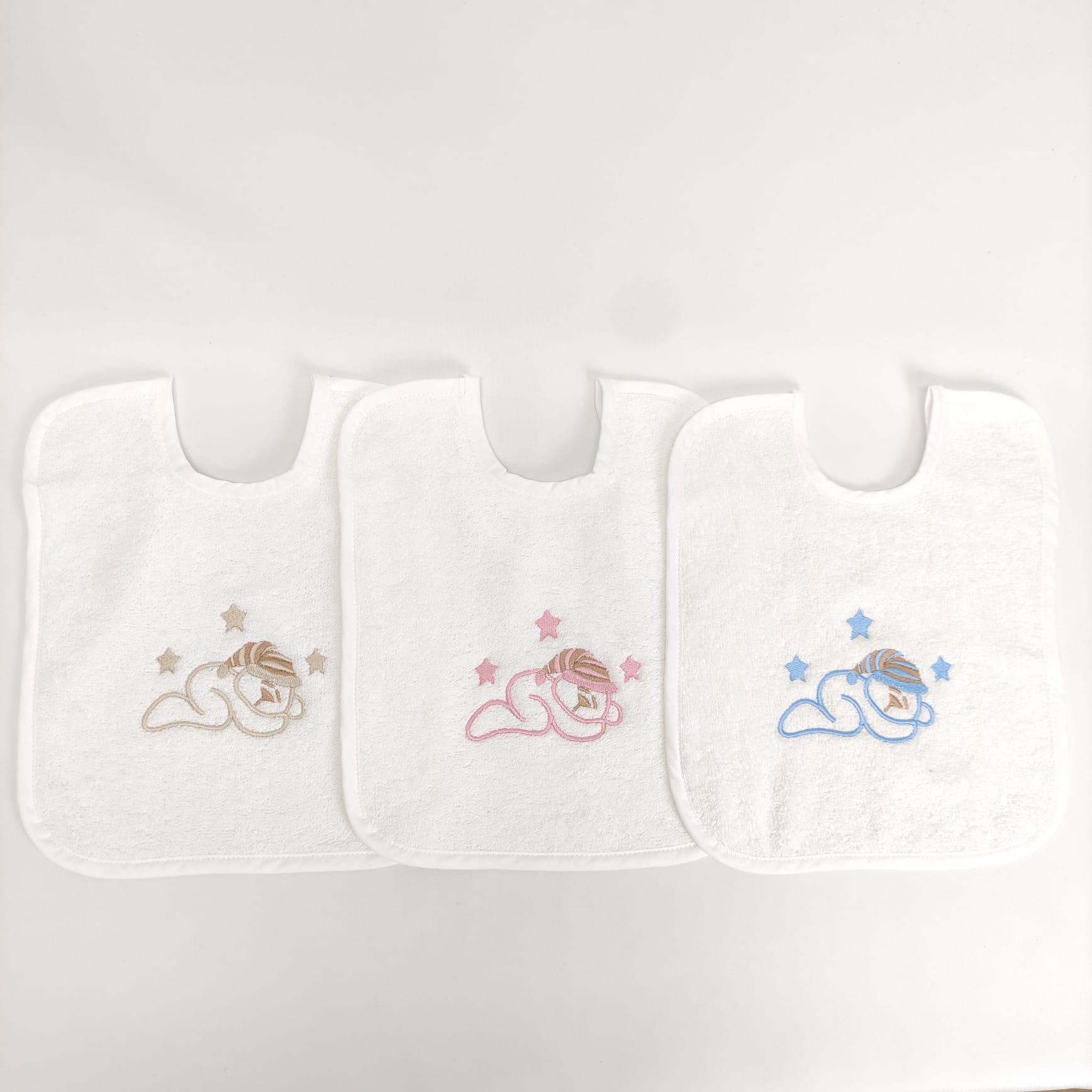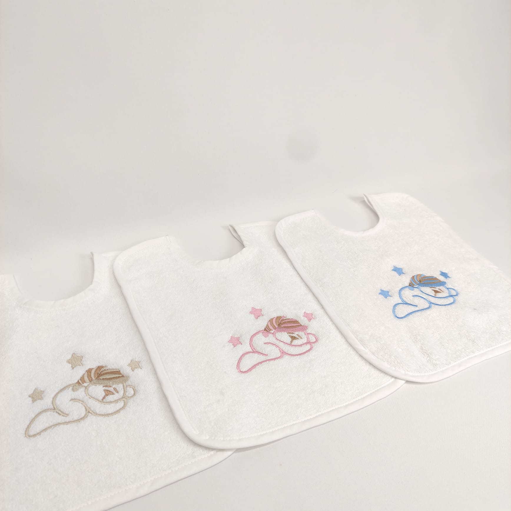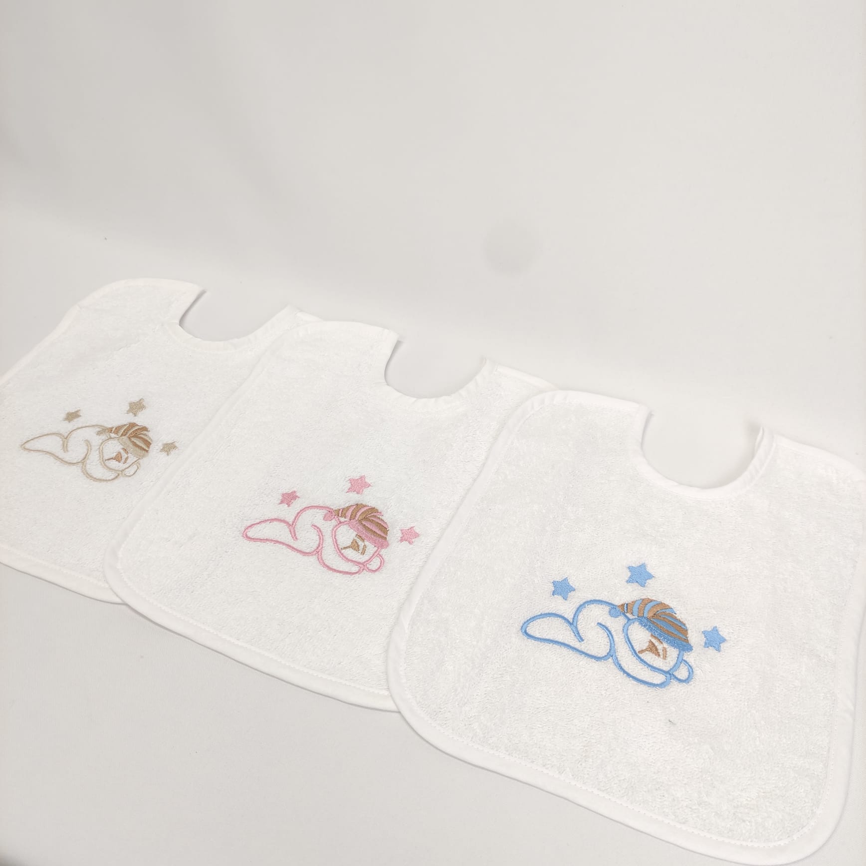 Babete em felpo suave e confortável, com bordado infantil. Disponível em azul, bege, rosa ou verde