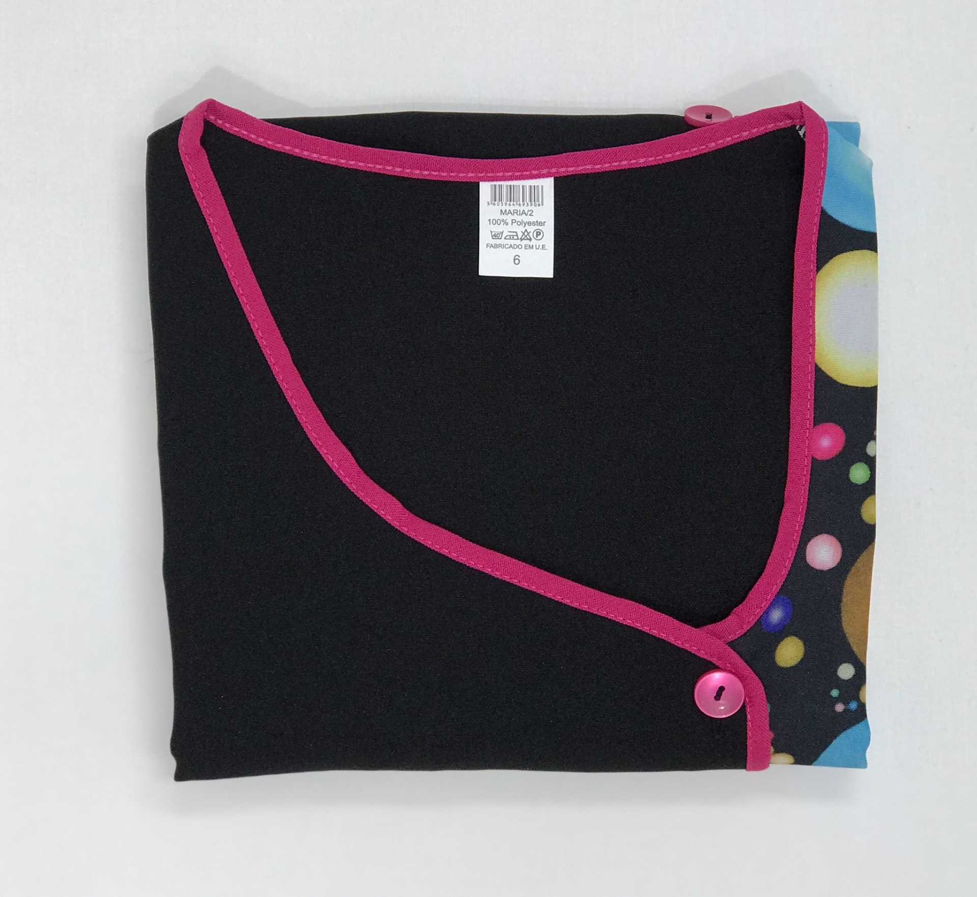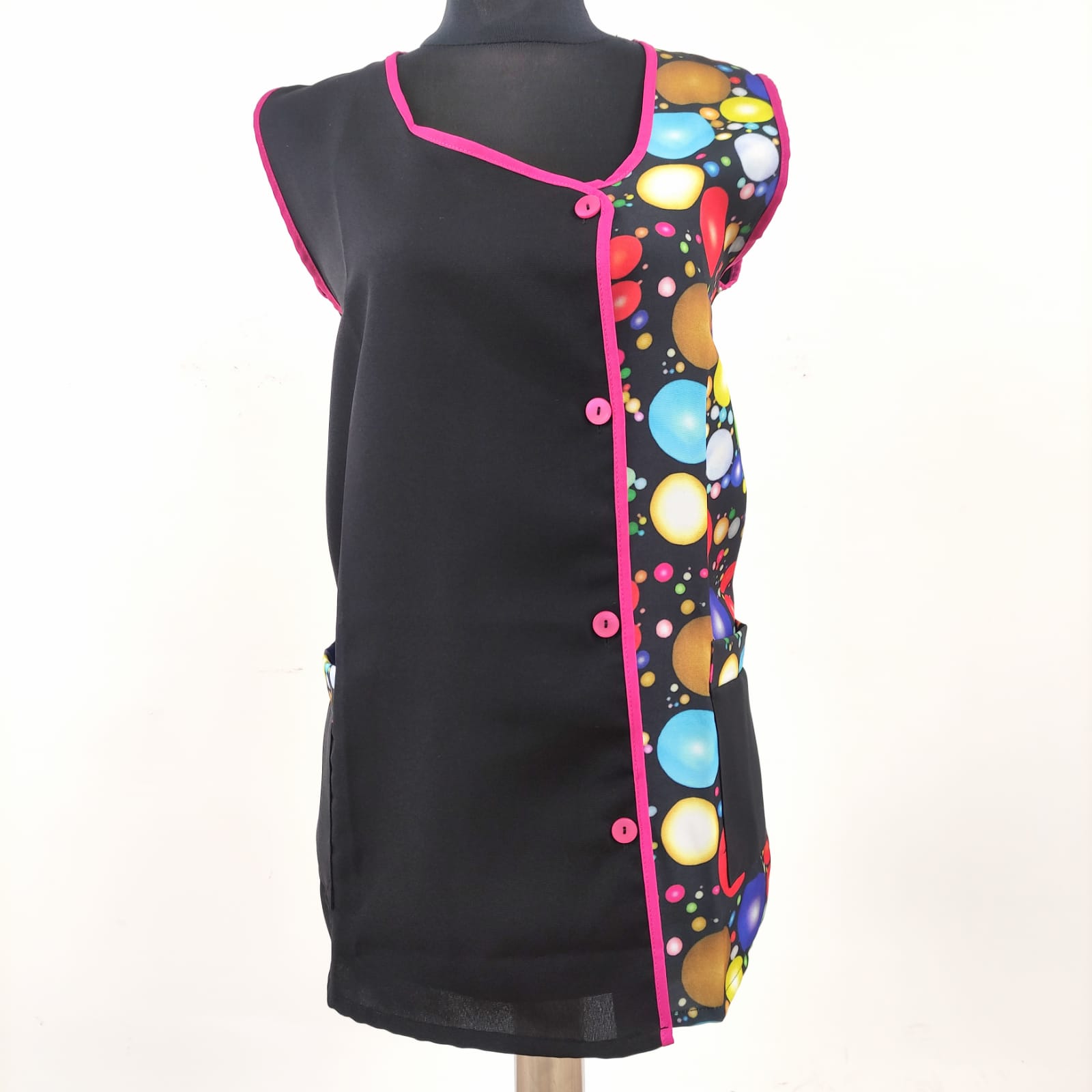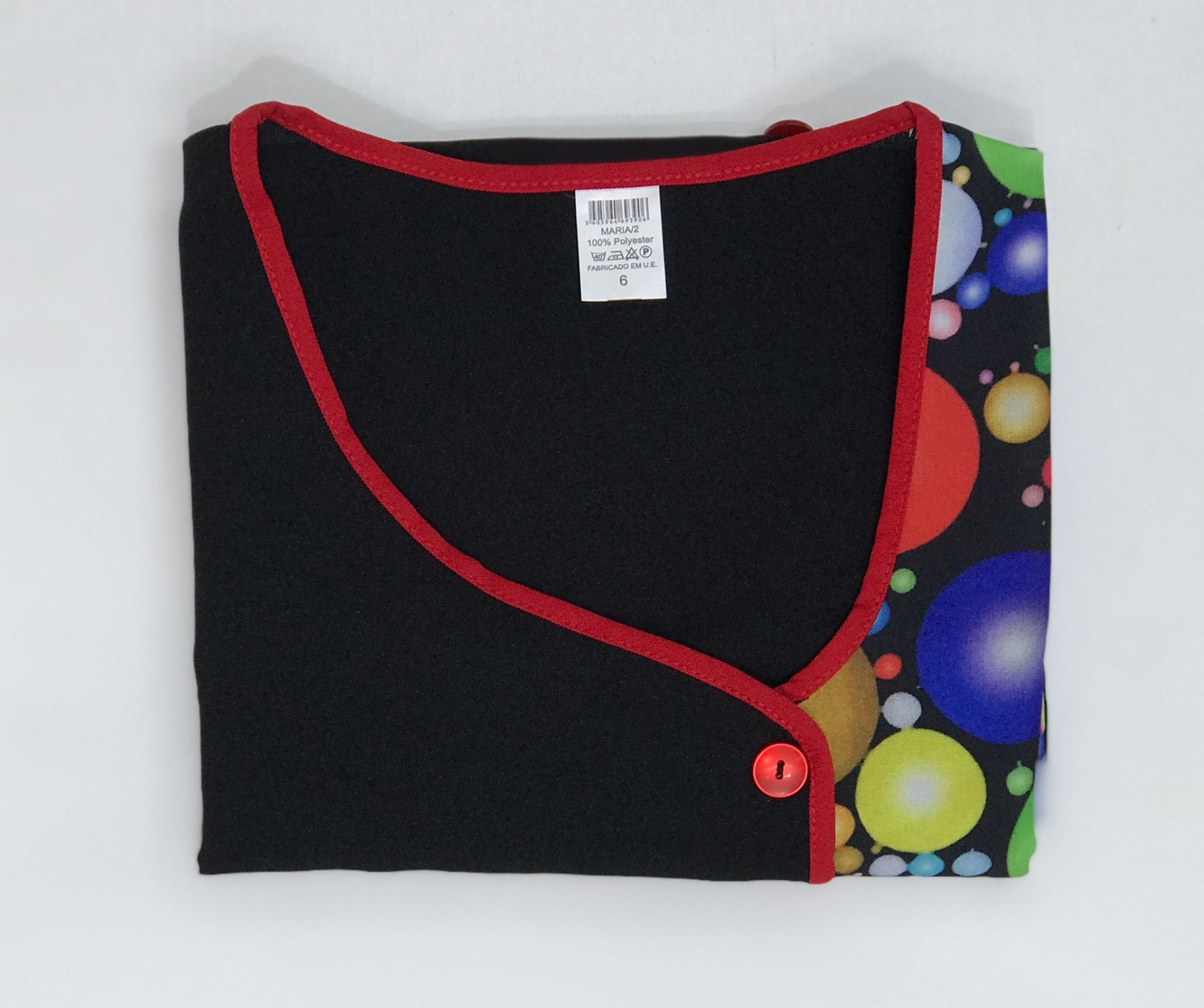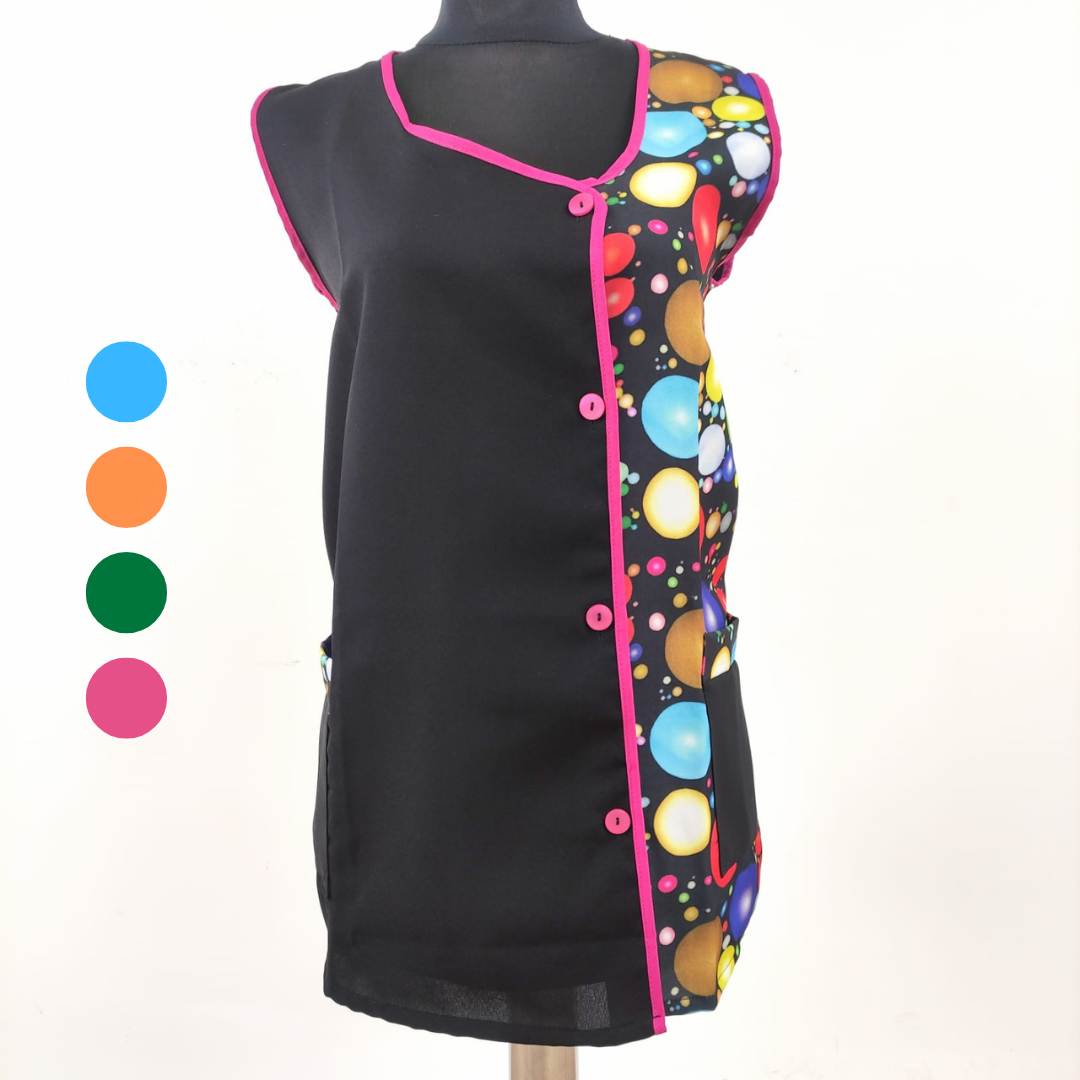 Bata com padrão em poliéster. Com botões na frente e bolsos nas laterais,  este é um modelo prático e de fácil lavagem.