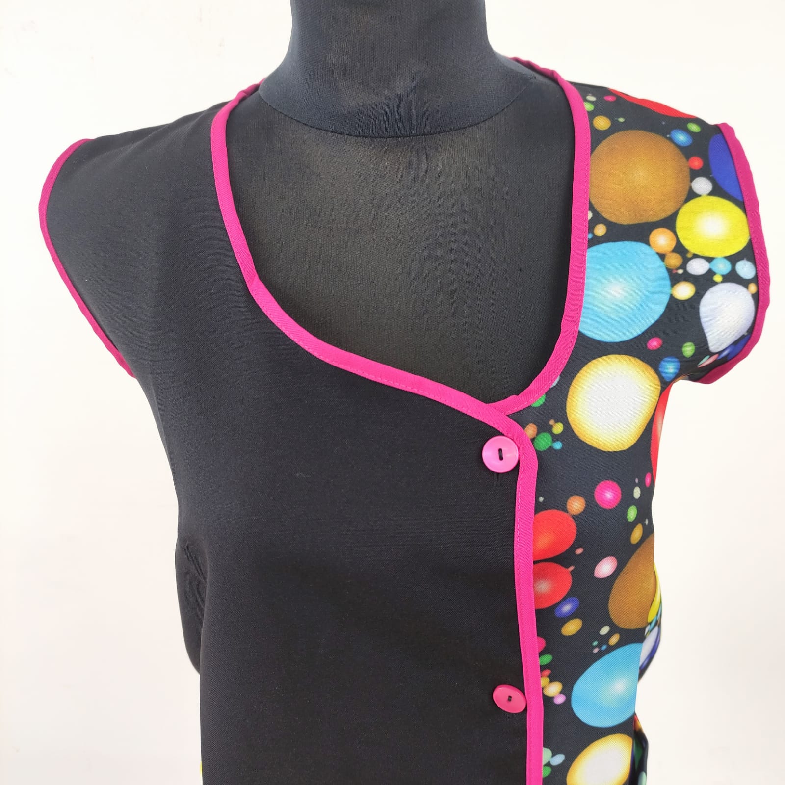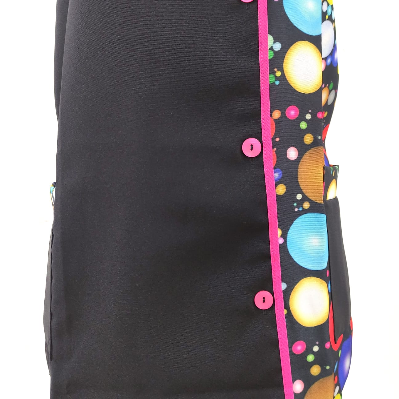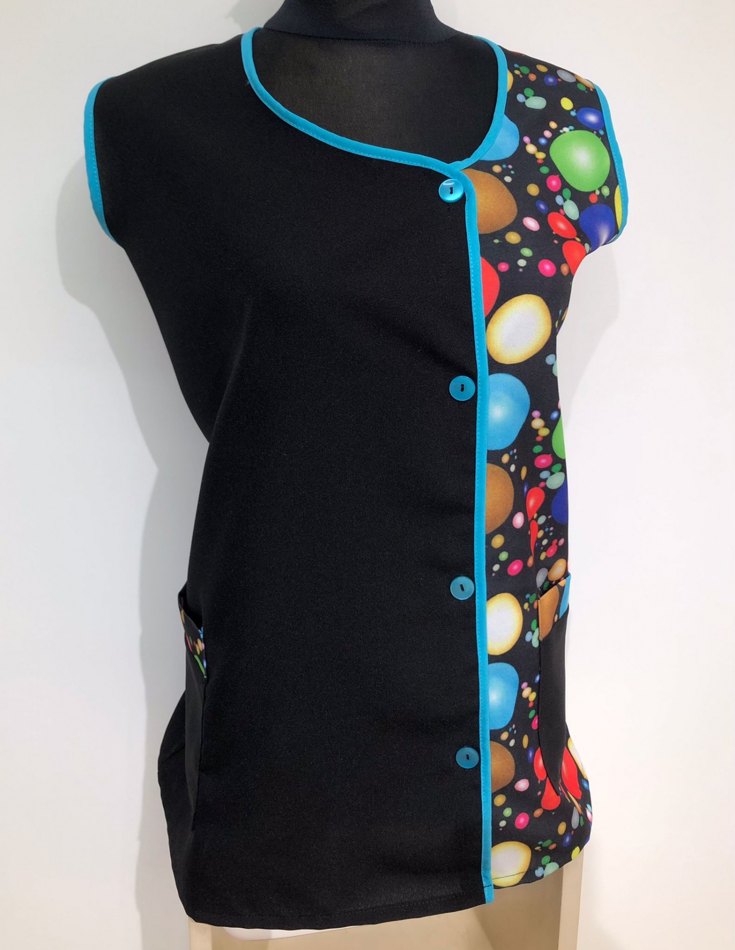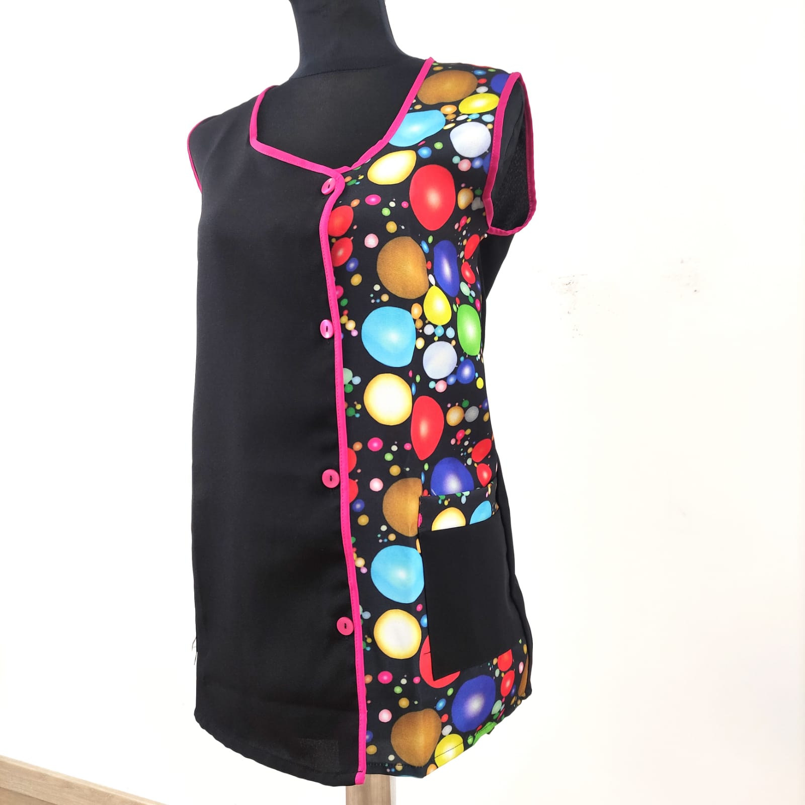 Bata com padrão em poliéster. Com botões na frente e bolsos nas laterais,  este é um modelo prático e de fácil lavagem.