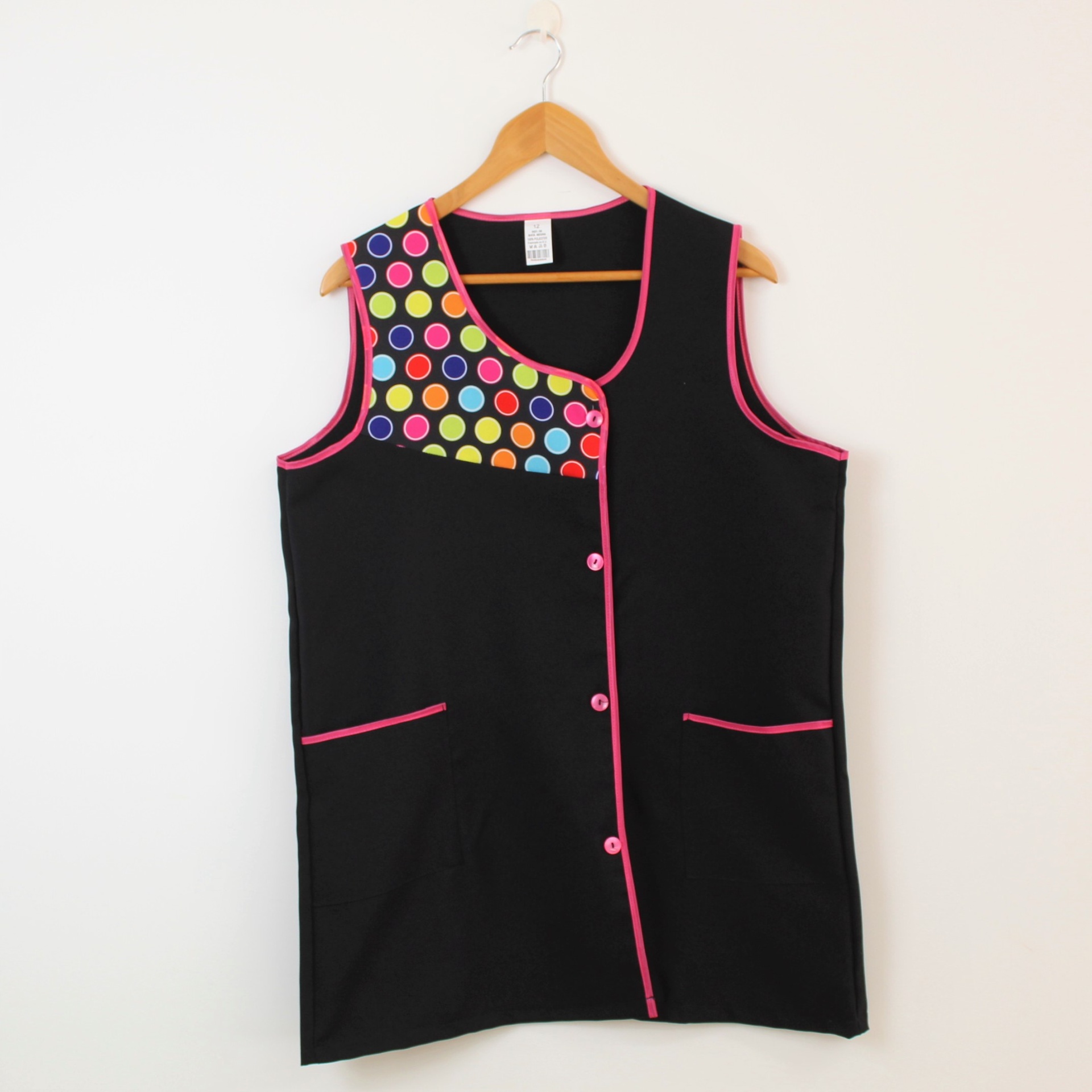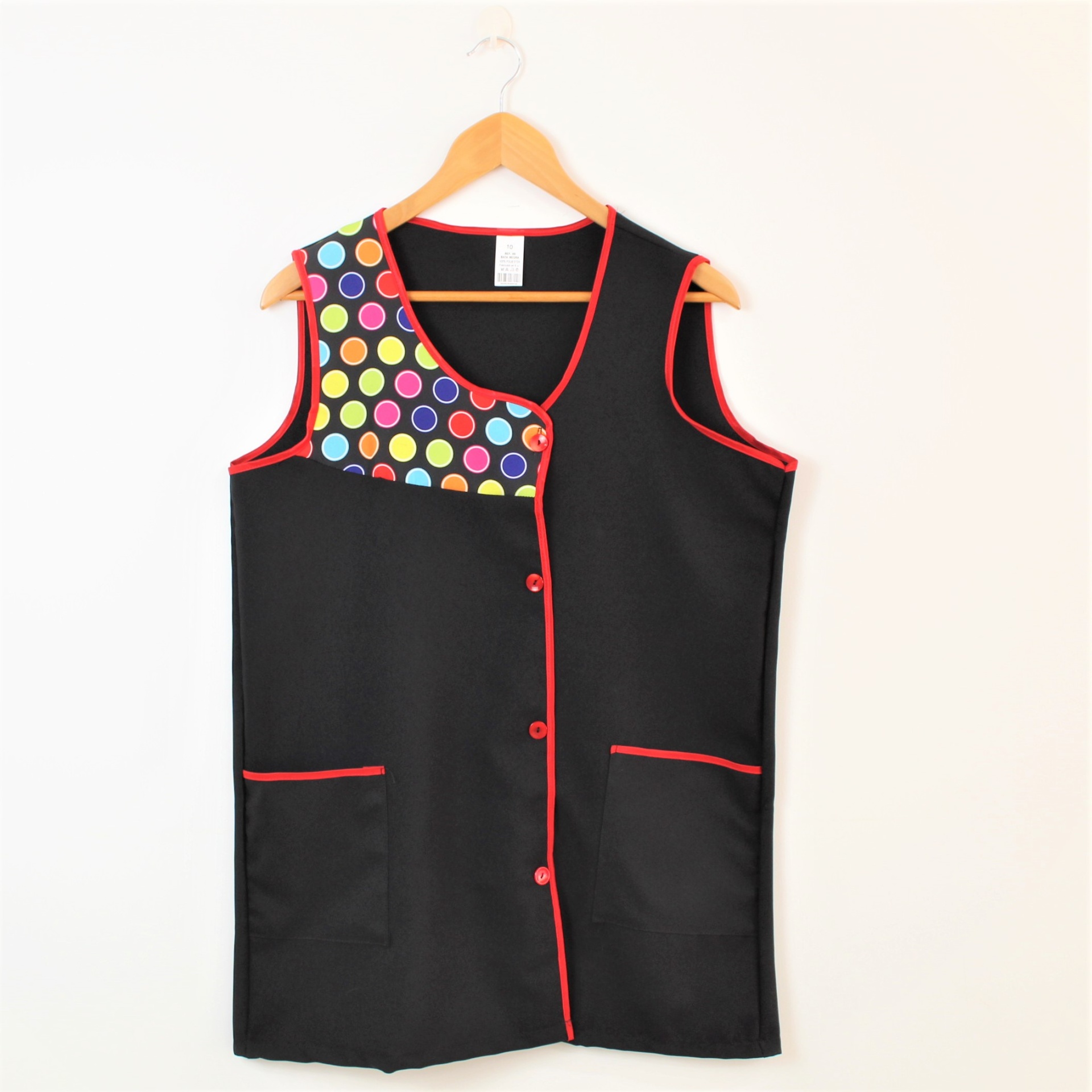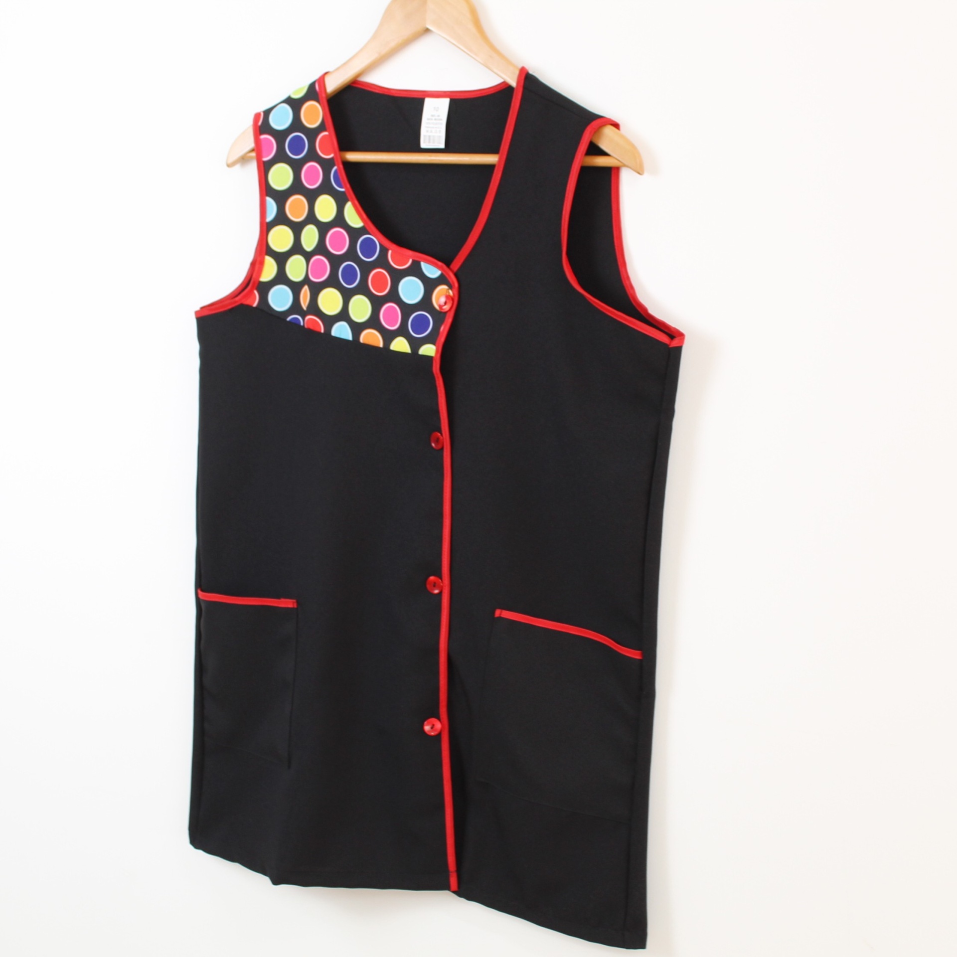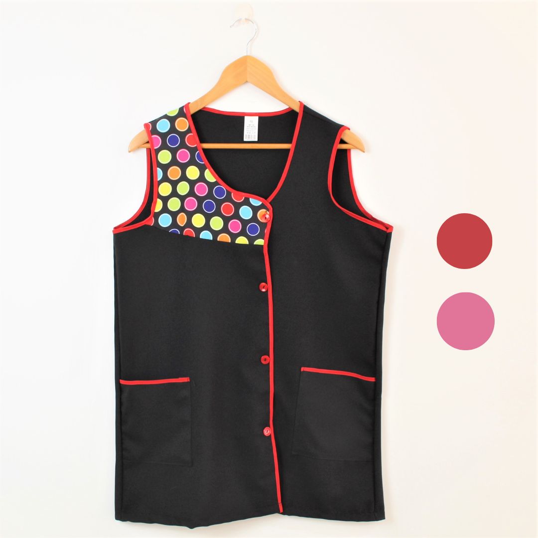 Bata com padrão geométrico e colorido. Com botões na frente e bolsos nas laterais,  este é um modelo prático e de fácil lavagem.
