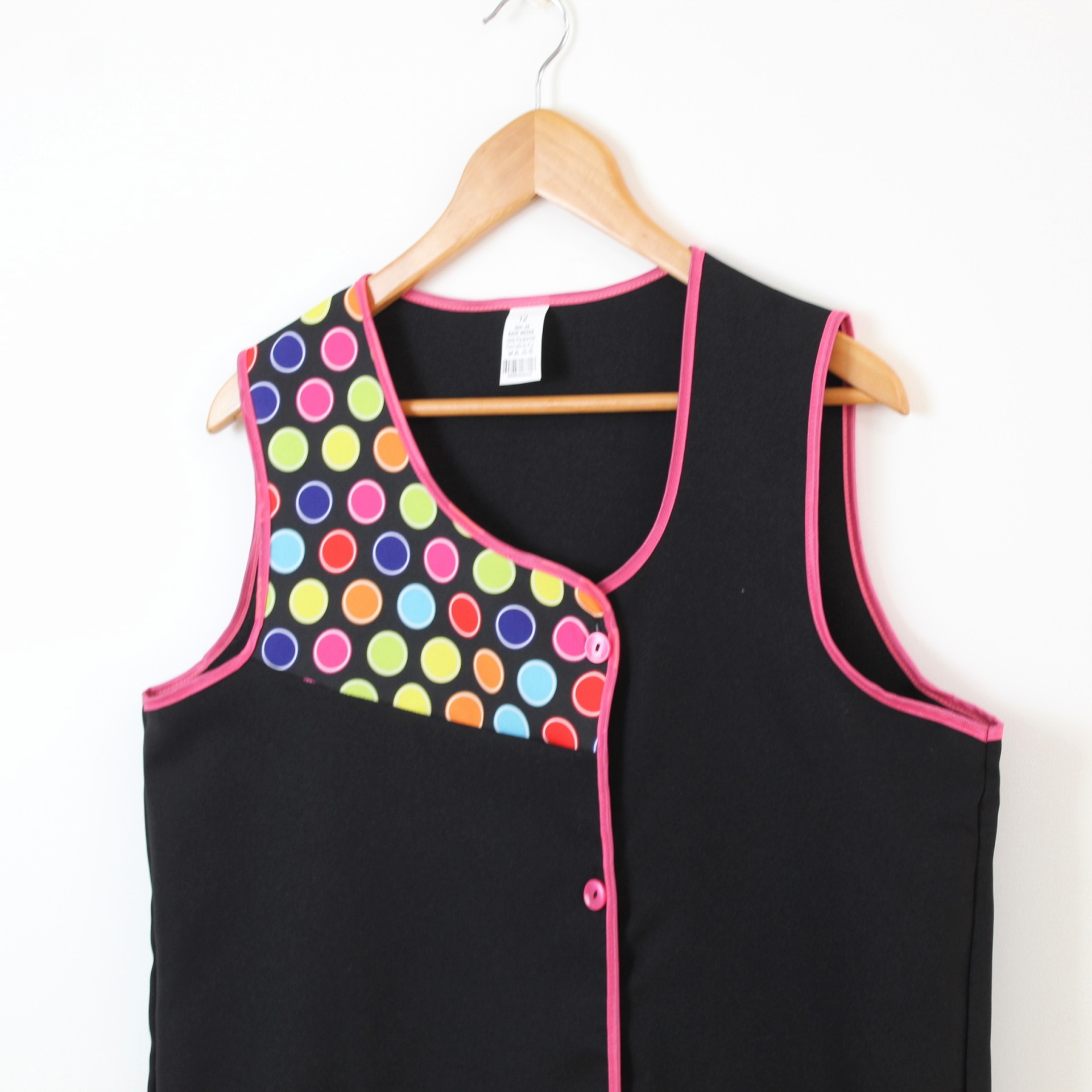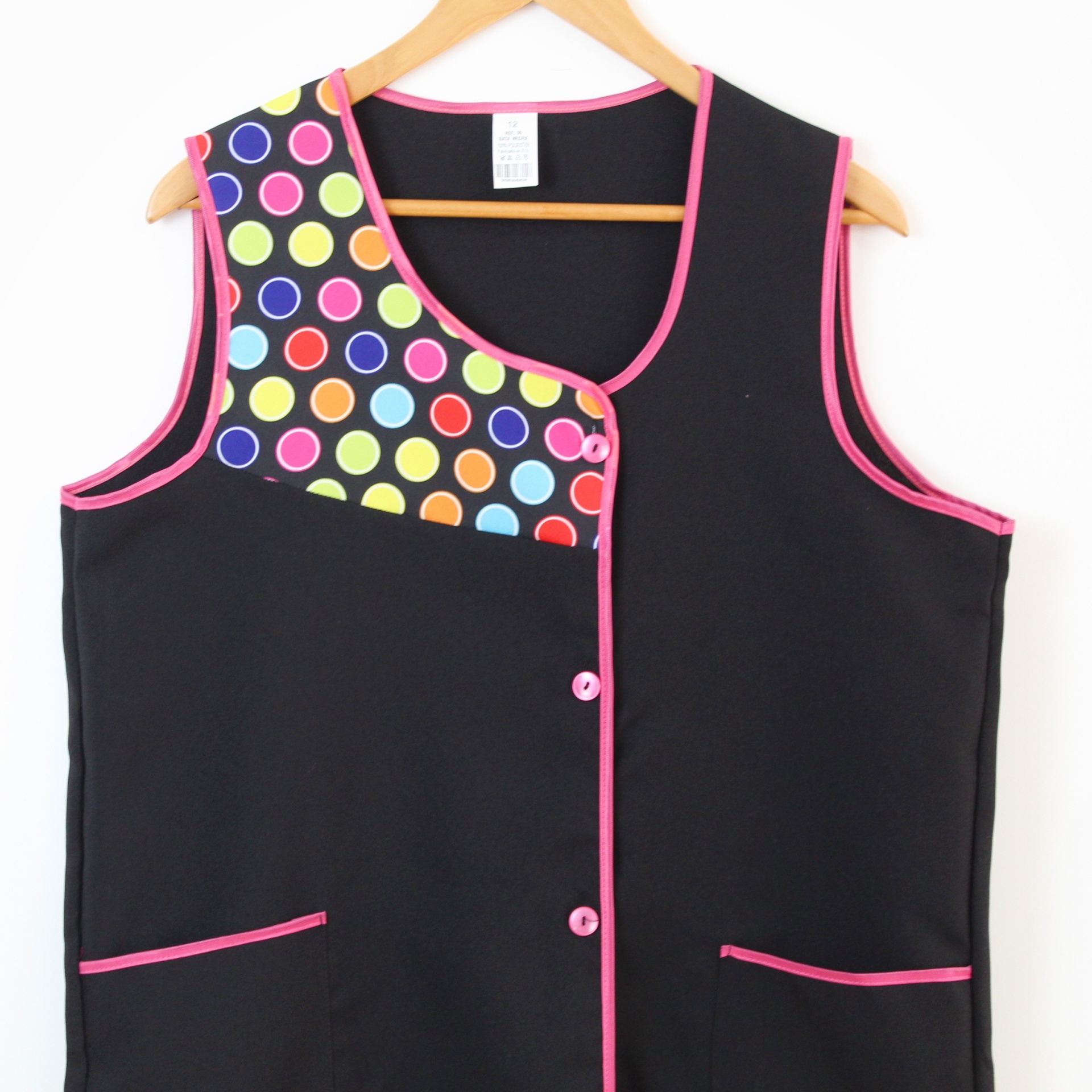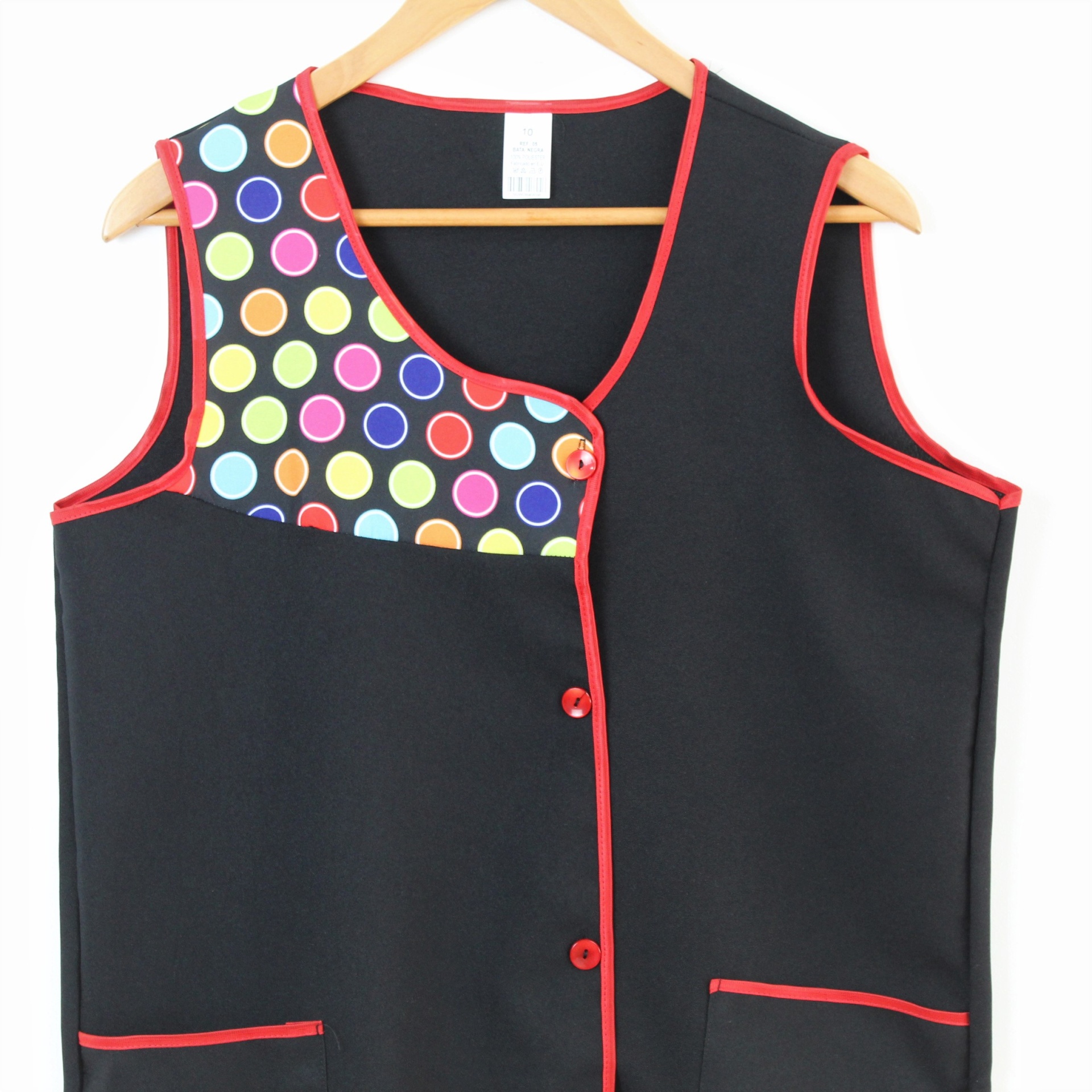 Bata com padrão geométrico e colorido. Com botões na frente e bolsos nas laterais,  este é um modelo prático e de fácil lavagem.