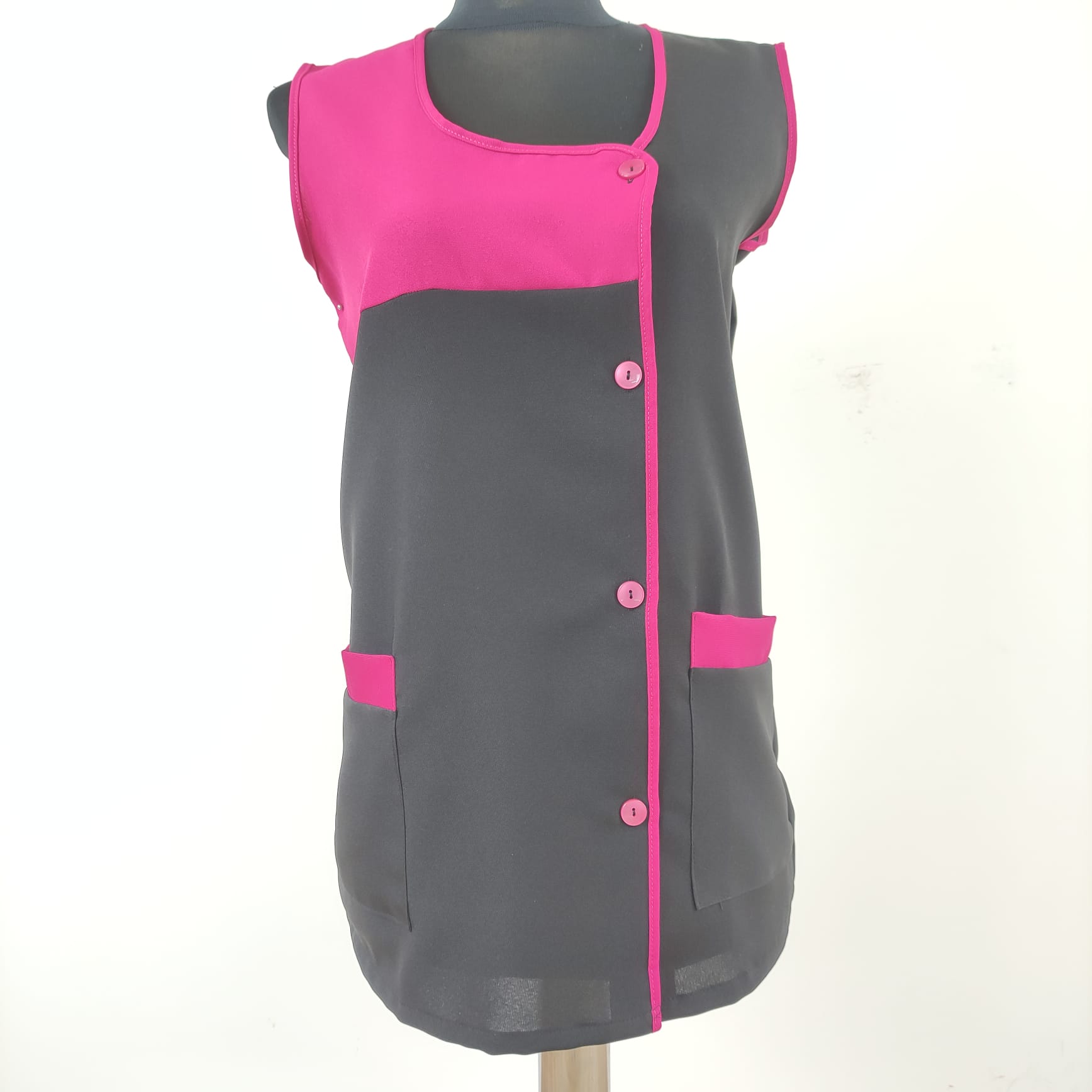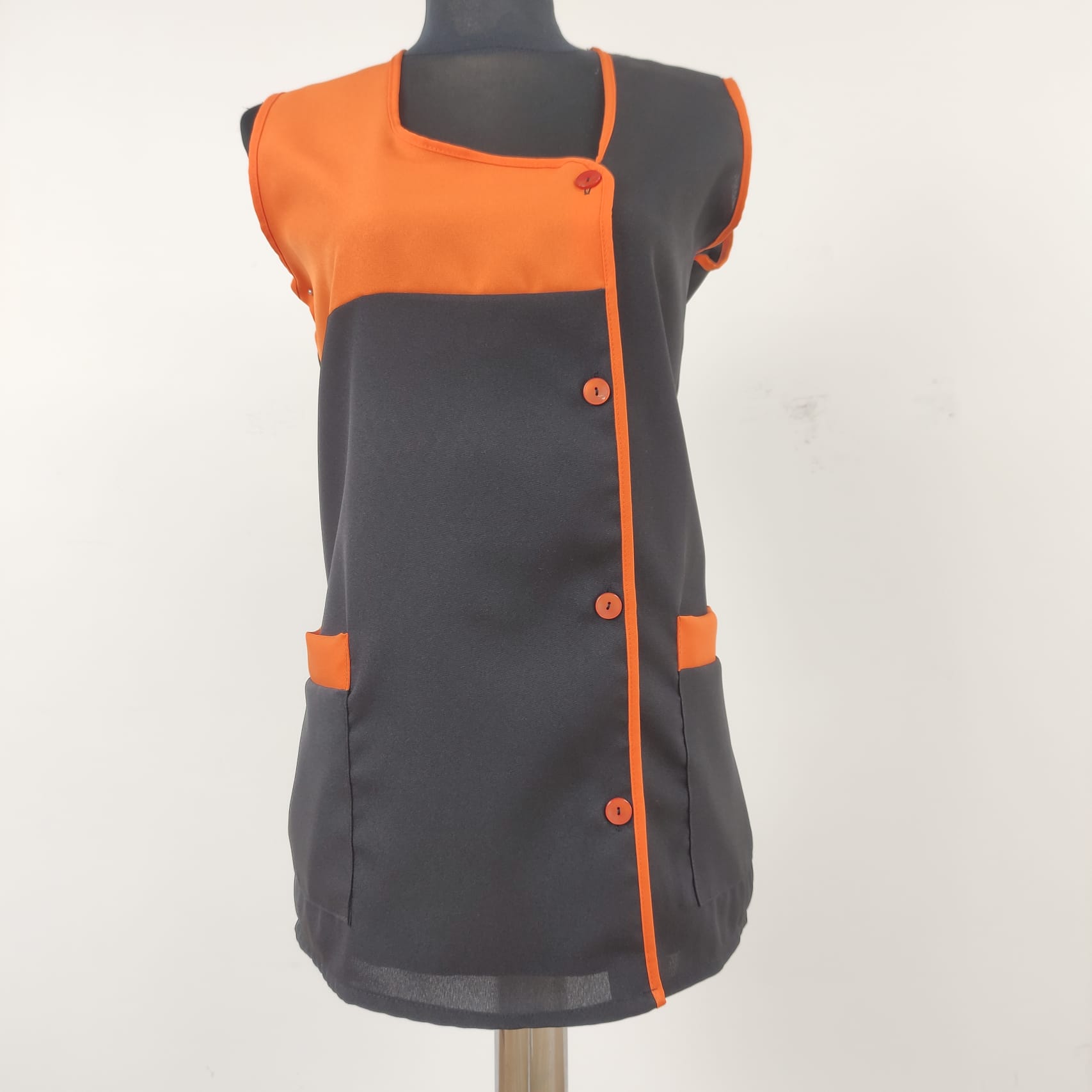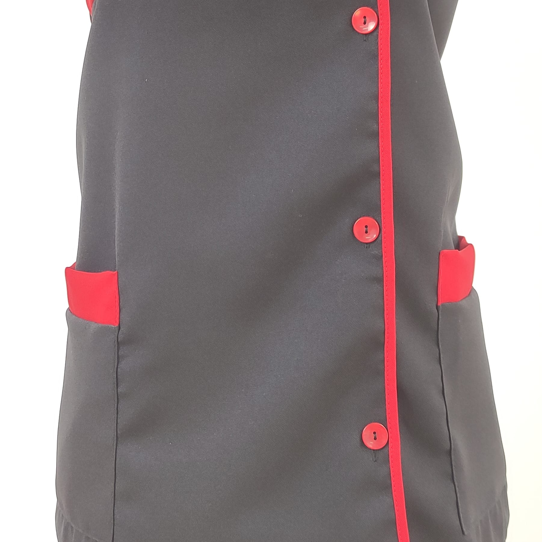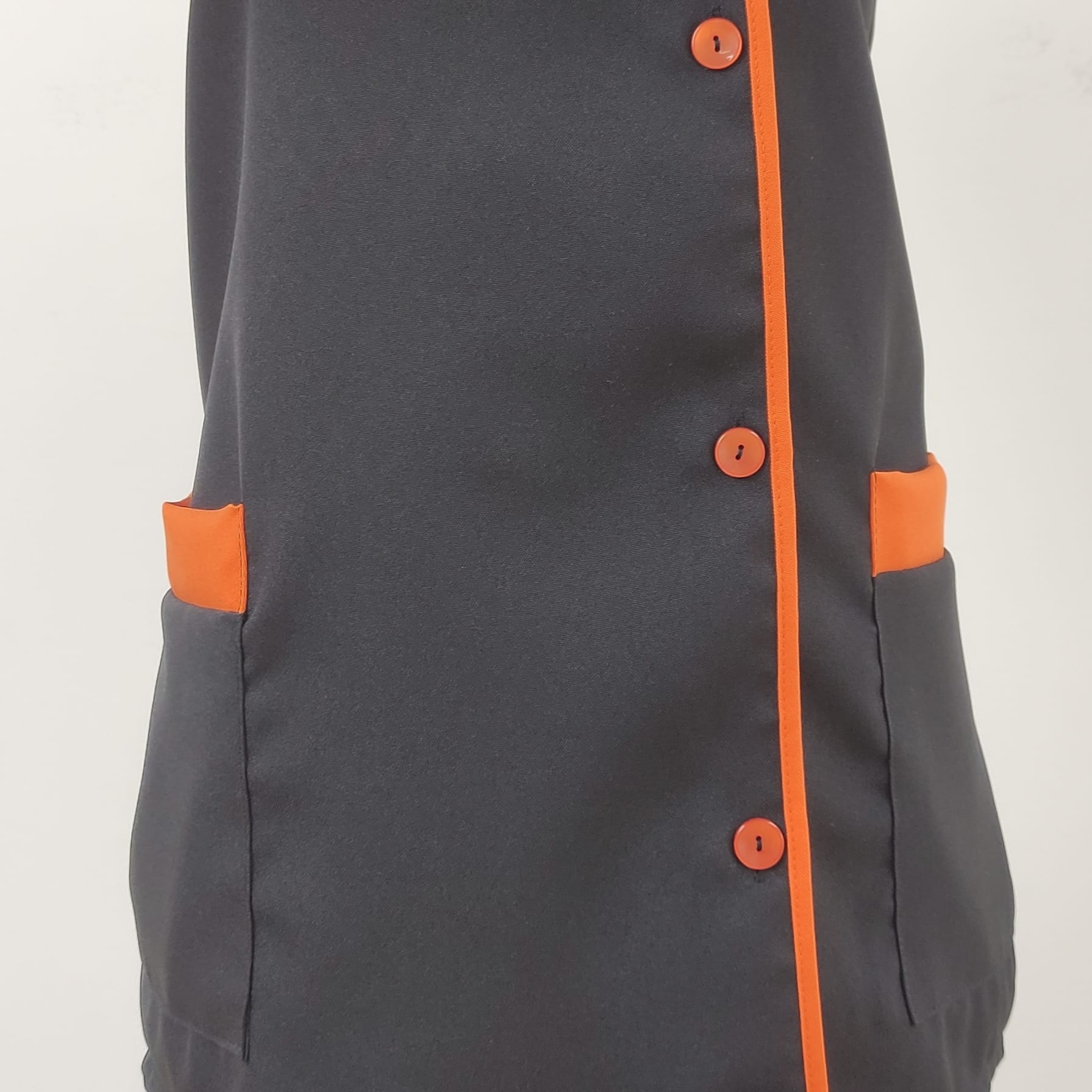 Bata lisa com detalhe de cor. Com botões na frente e bolsos nas laterais,  este é um modelo prático e de fácil lavagem.