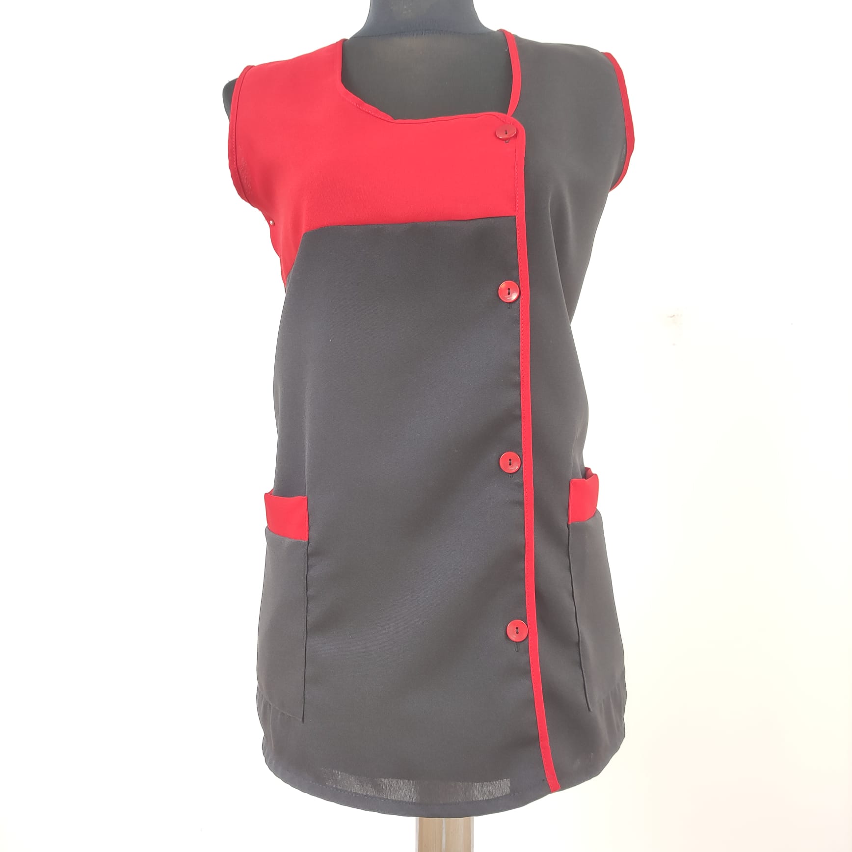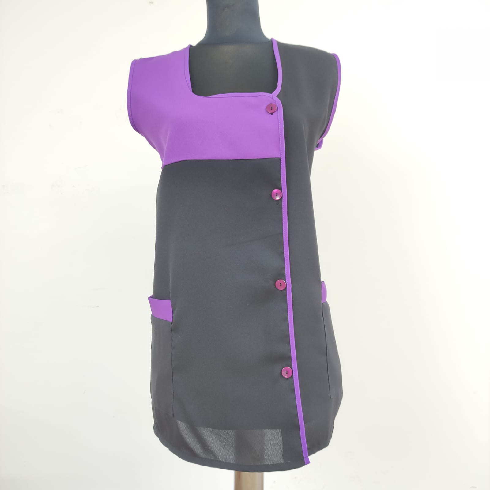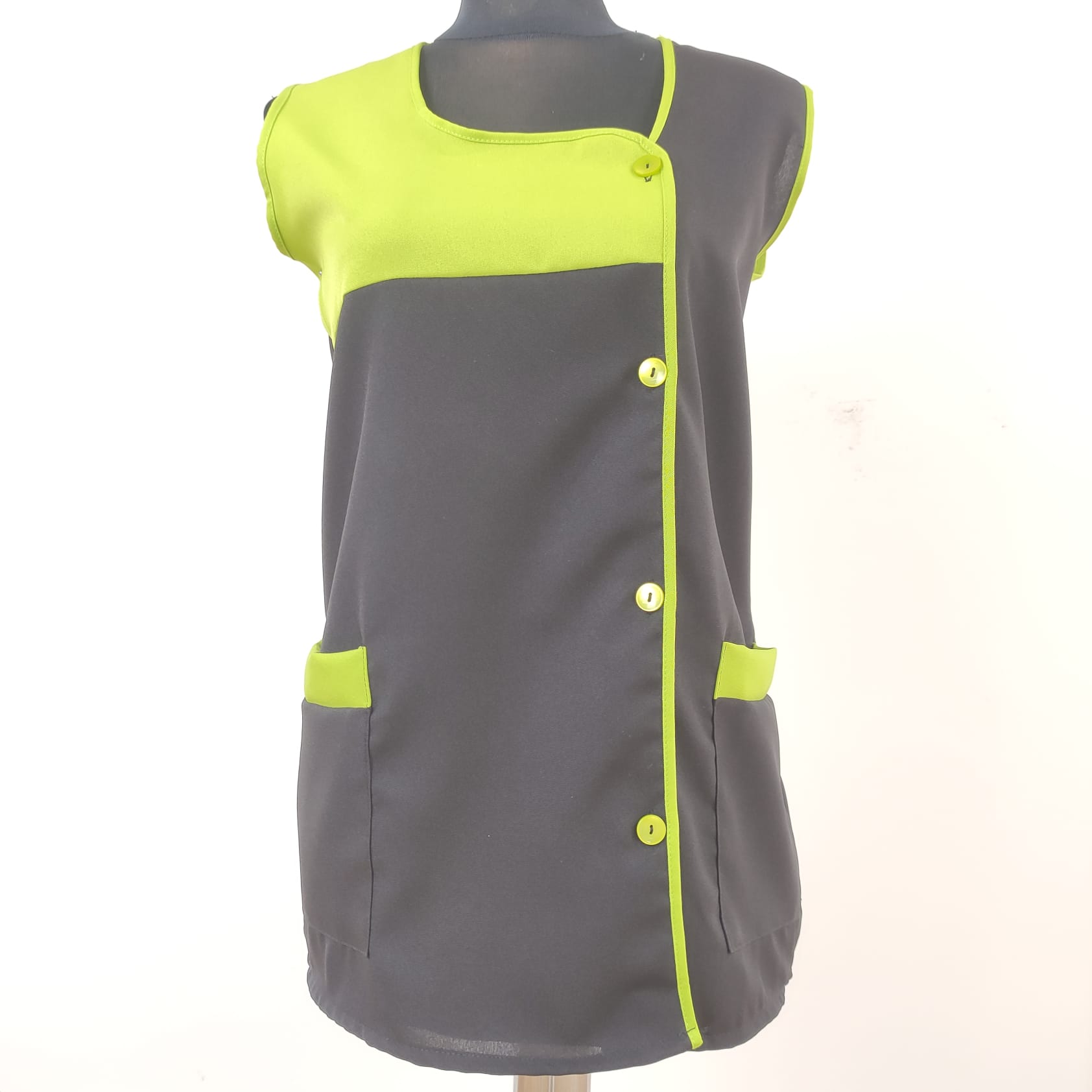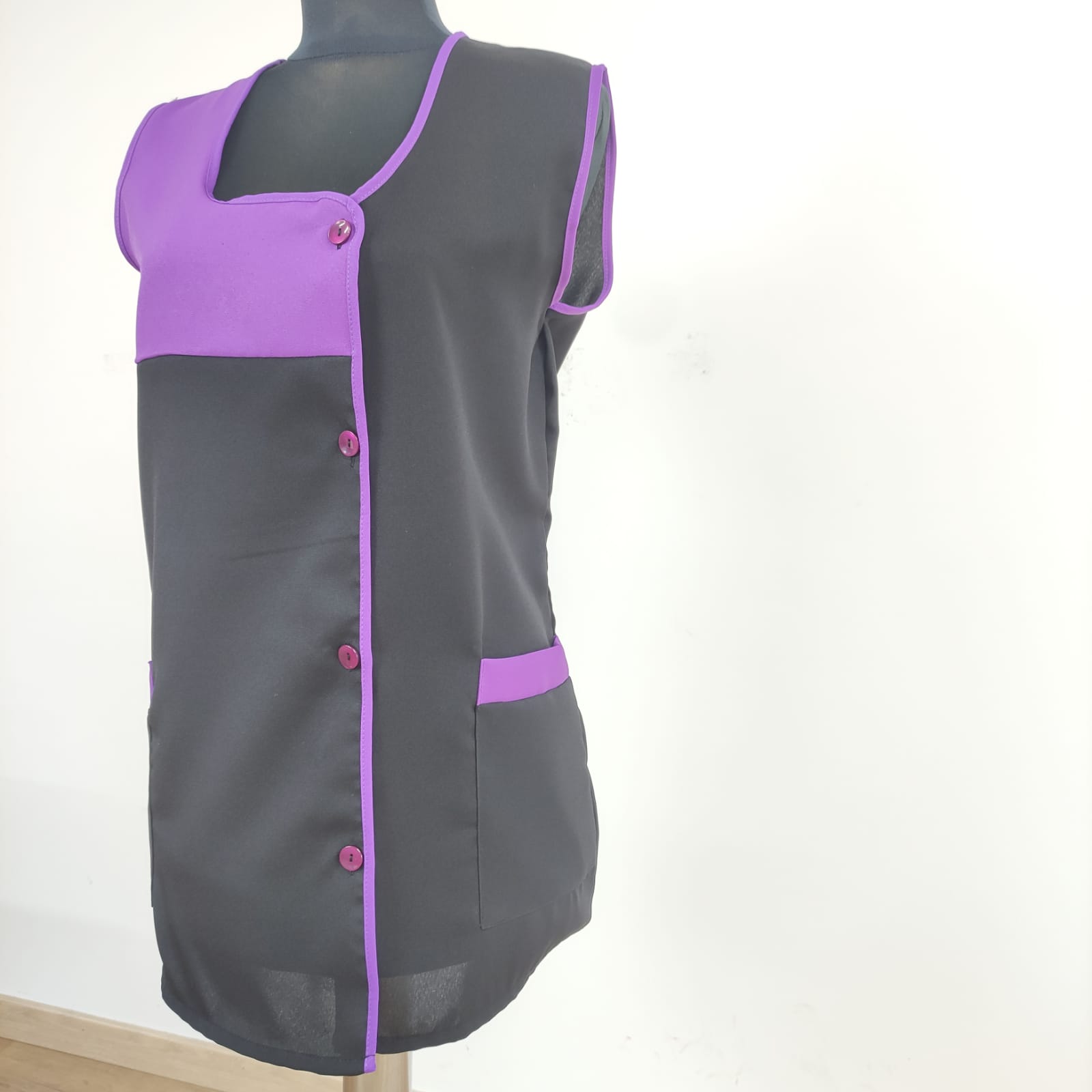 Bata lisa com detalhe de cor. Com botões na frente e bolsos nas laterais,  este é um modelo prático e de fácil lavagem.