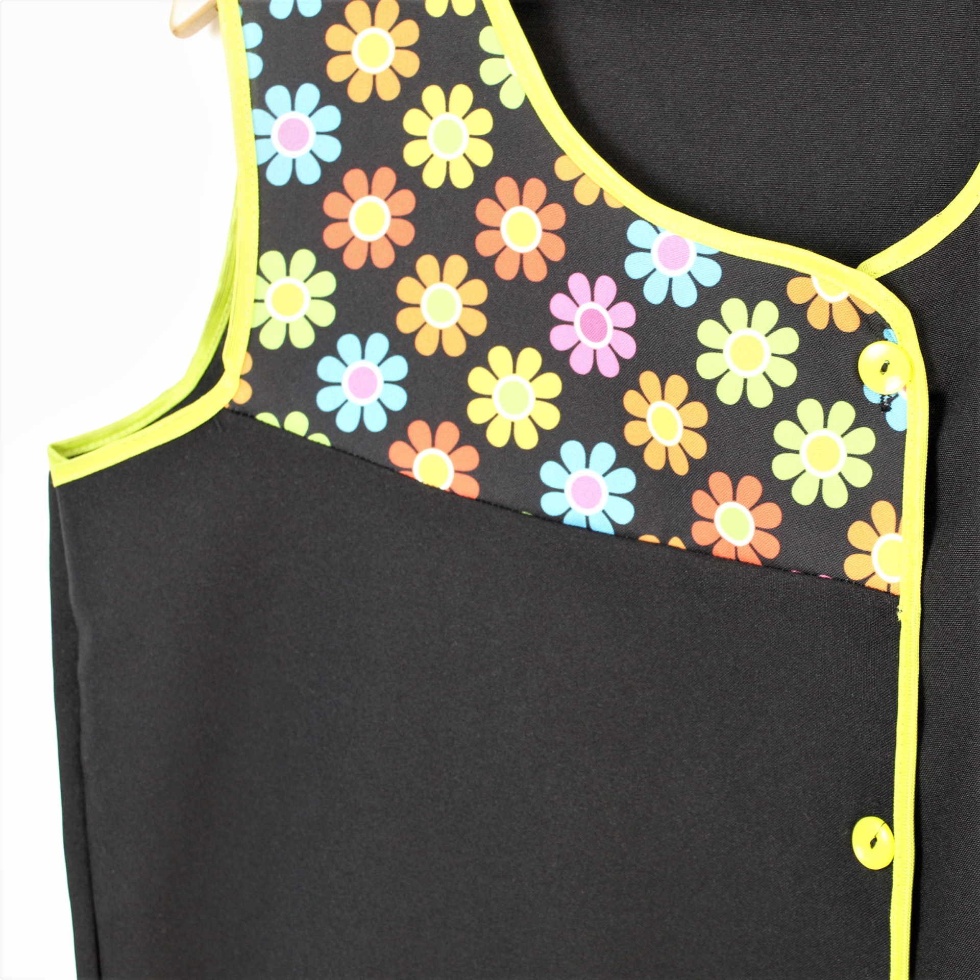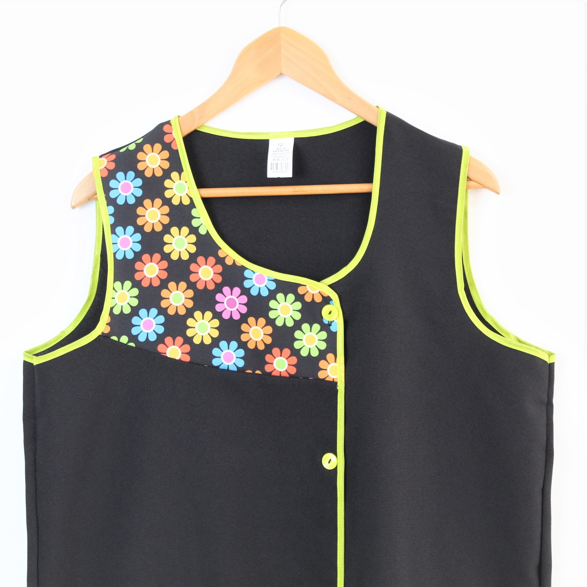 Bata com imagens de flores coloridas no lado direto.