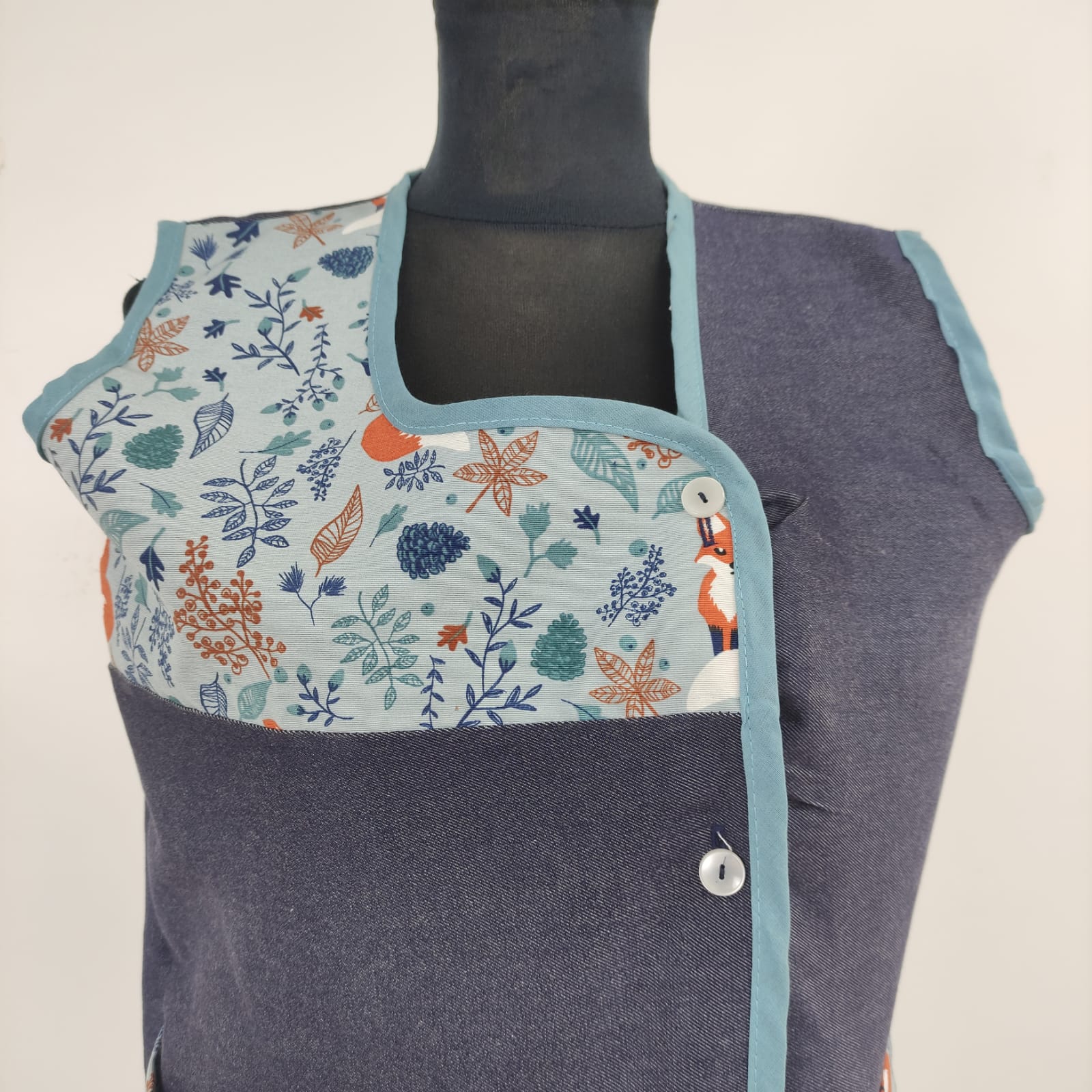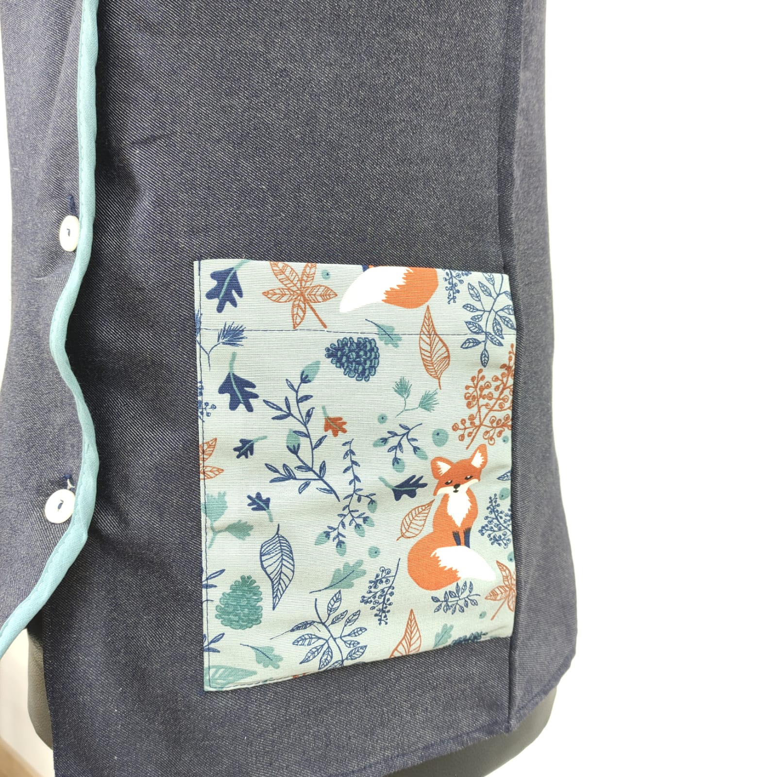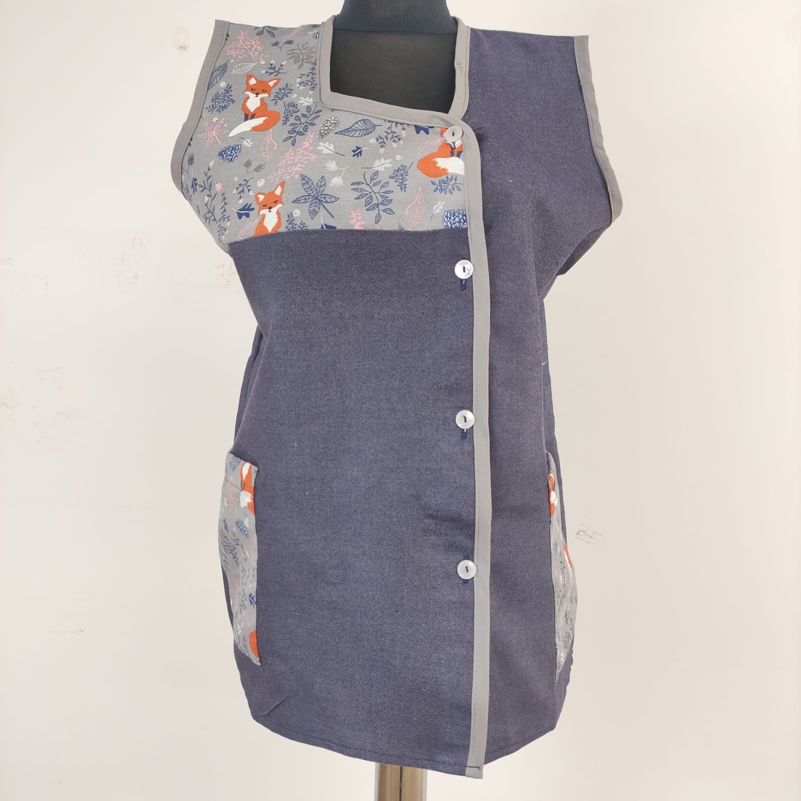 Bata em ganga, com botões na frente e bolsos nas laterais. Modelo disponivel em três tons de padrão Raposa , em azul claro, rosa e cinza.