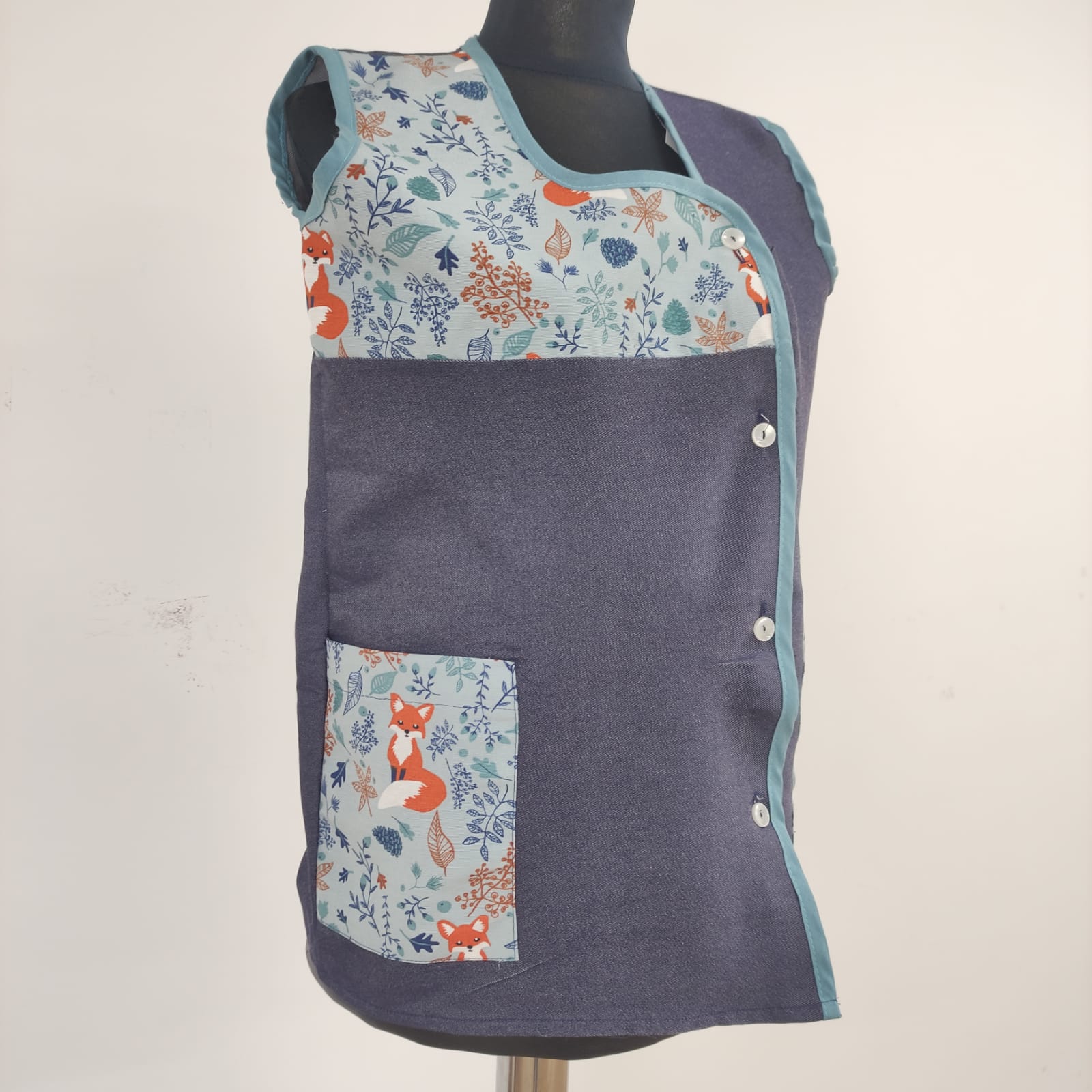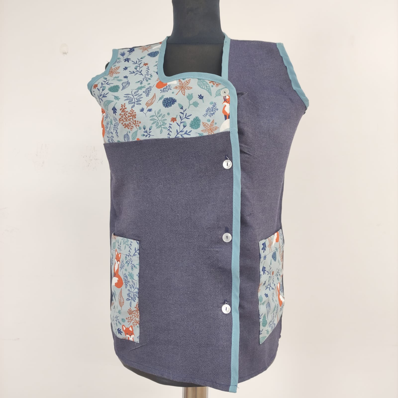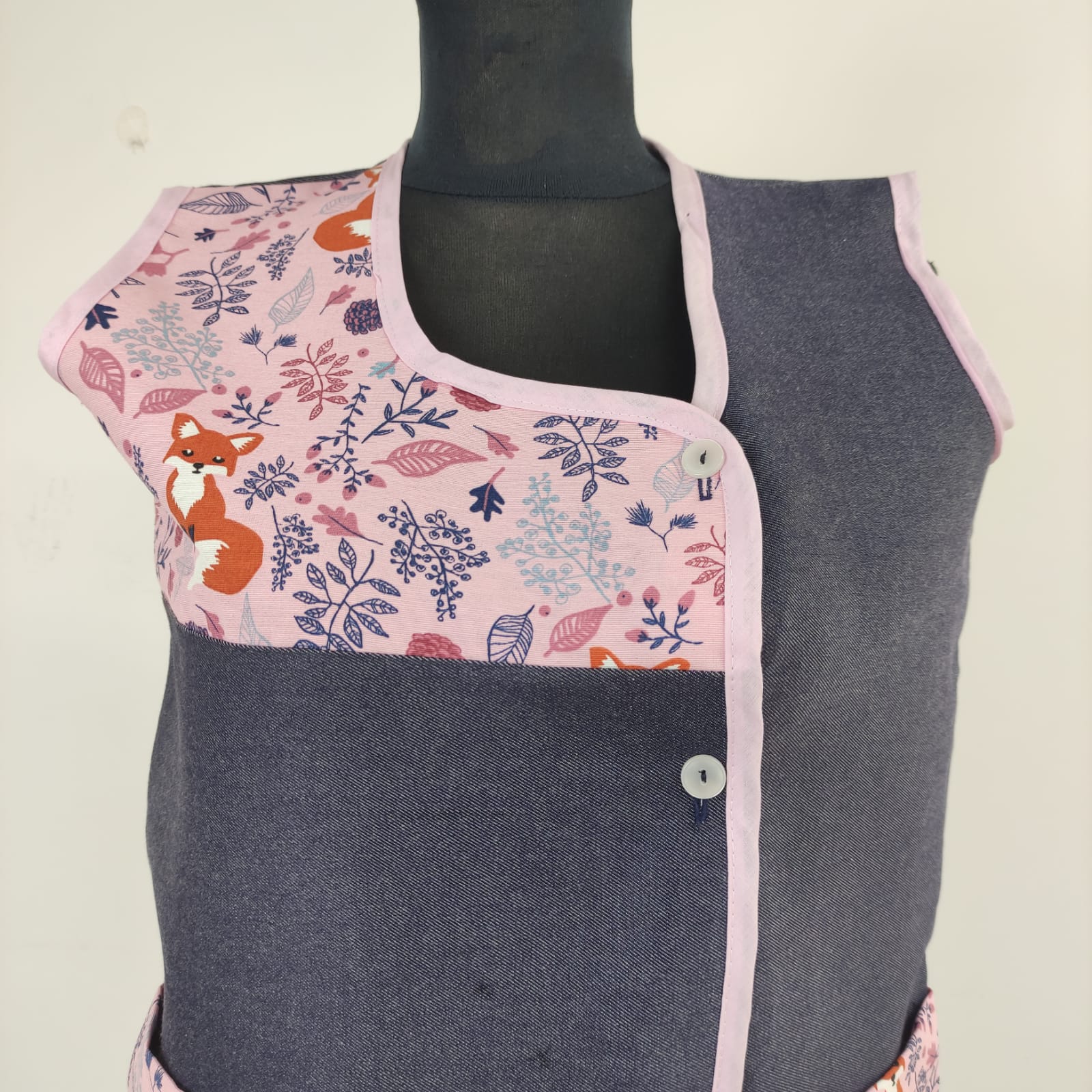 Bata em ganga, com botões na frente e bolsos nas laterais. Modelo disponivel em três tons de padrão Raposa , em azul claro, rosa e cinza.