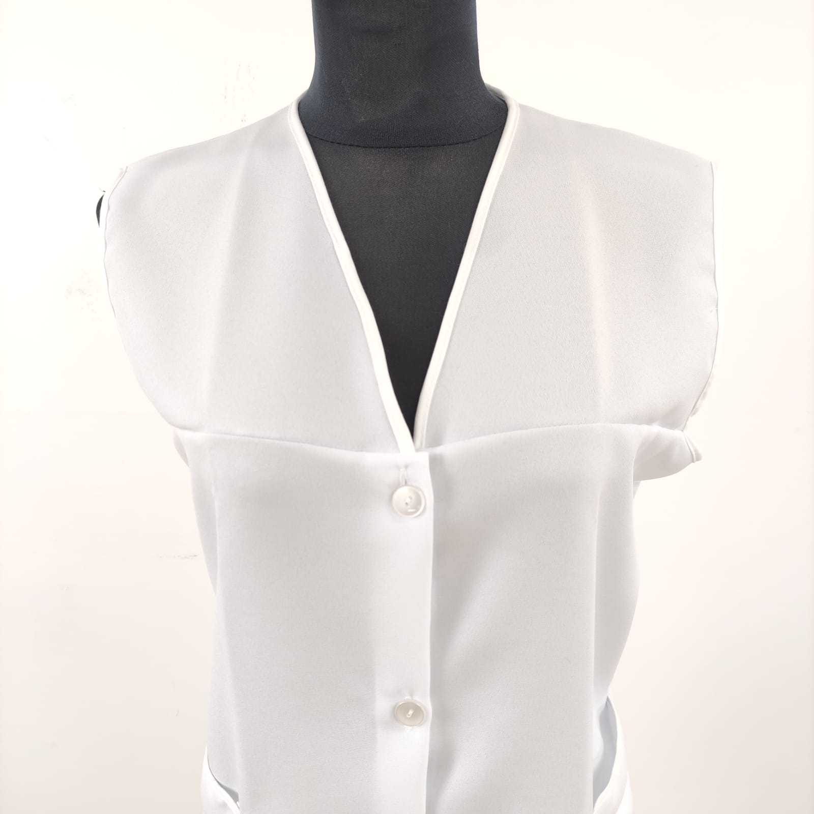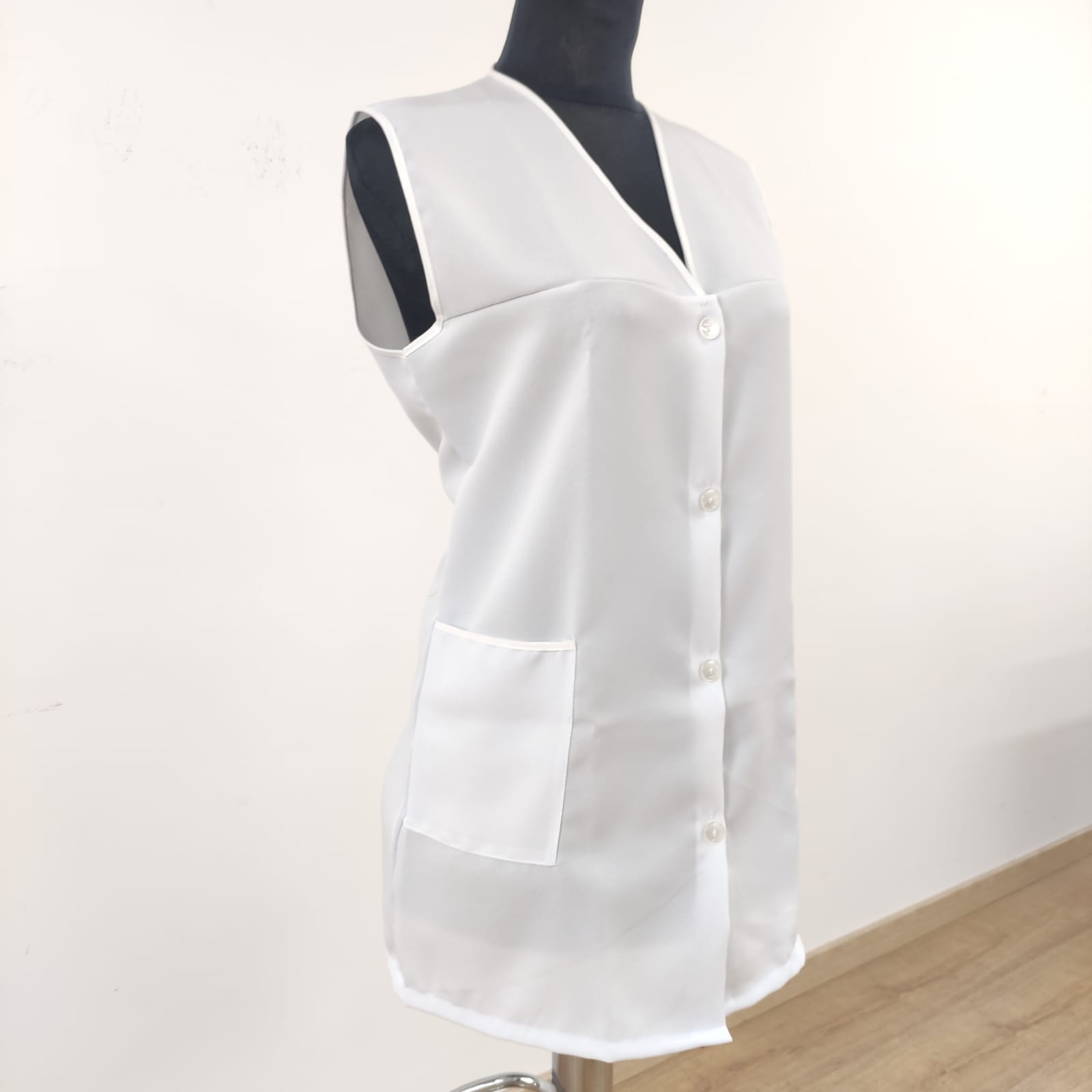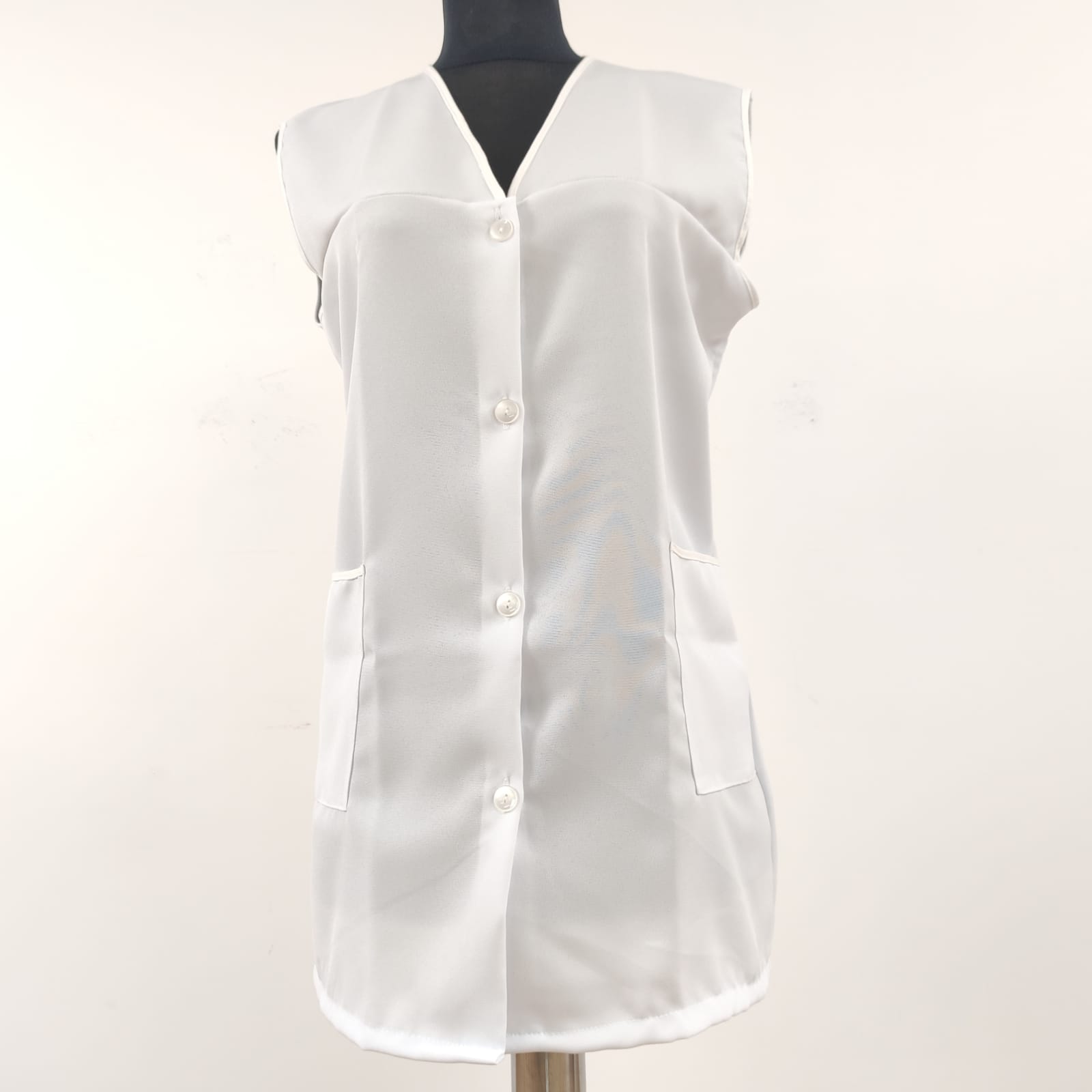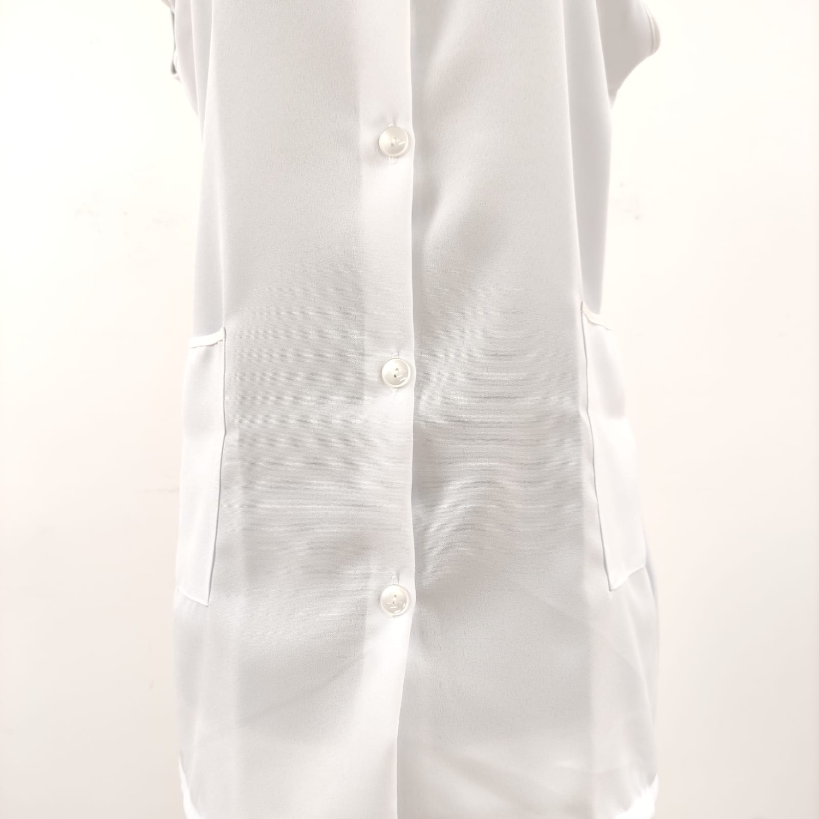 Bata básica, com fecho de botões na frente e bolsos nas laterais.  Modelo prático e de fácil lavagem.