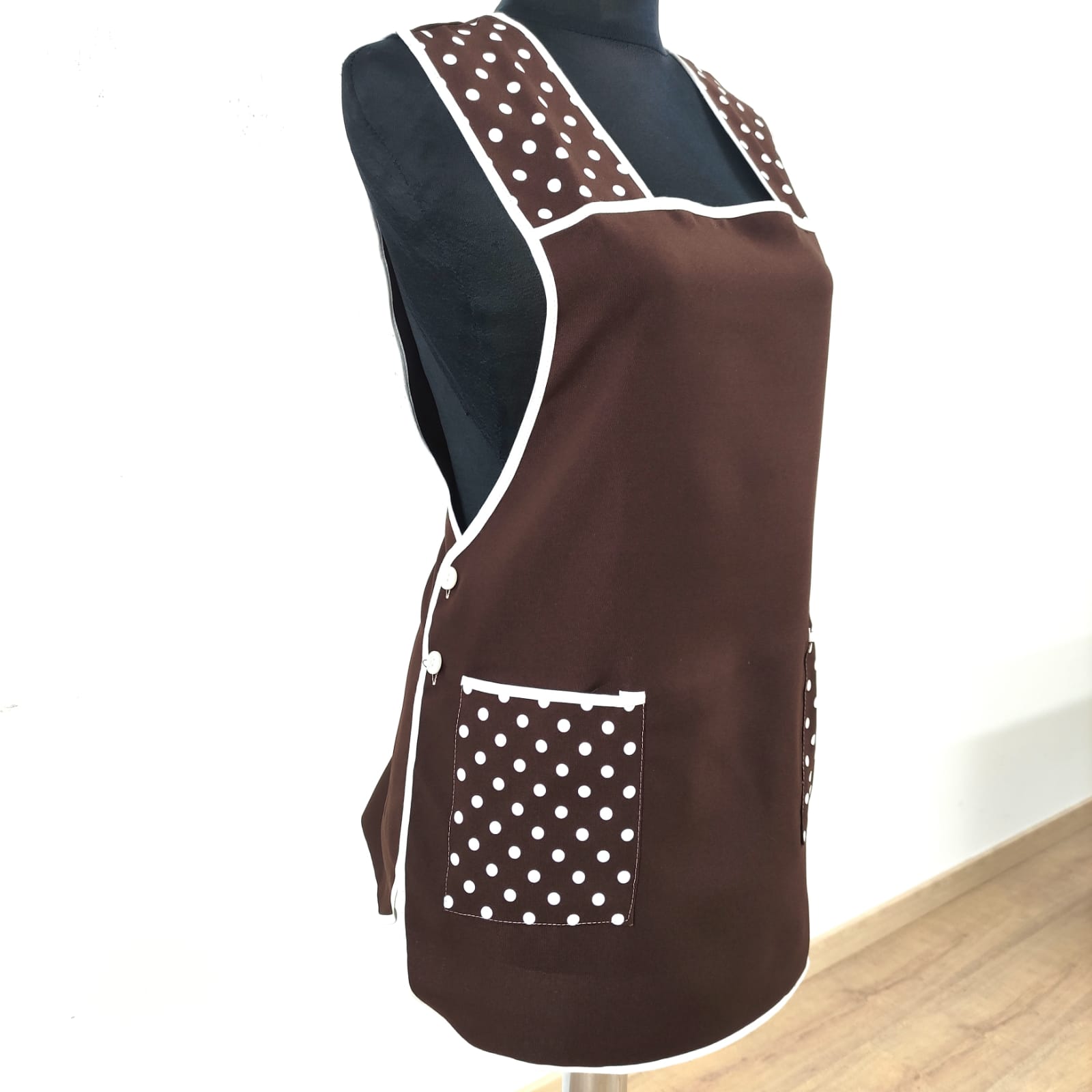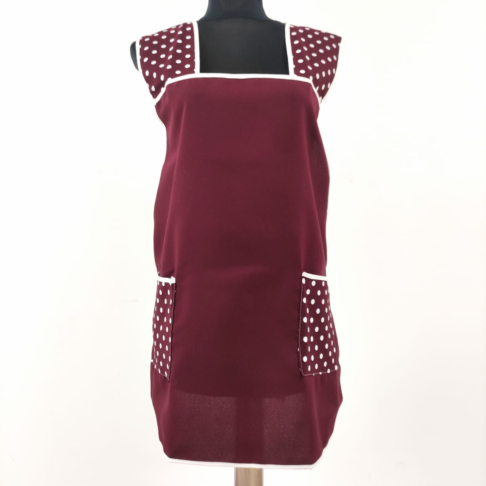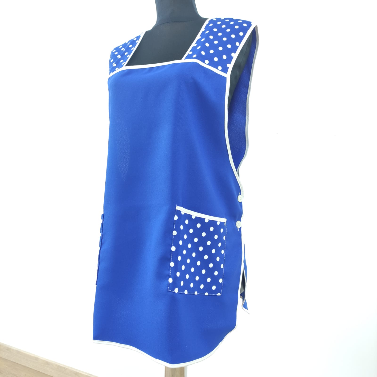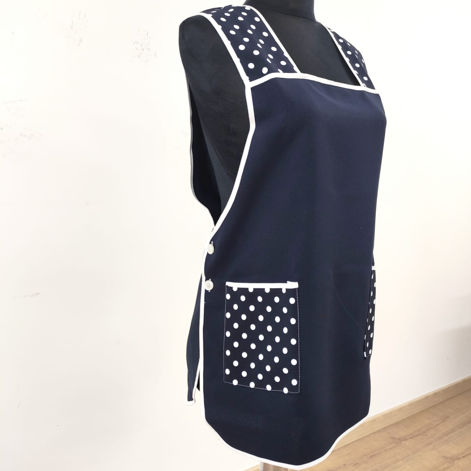 Bata em cor com pintinhas brancas. Bolsos e fecho de botões nas laterais.