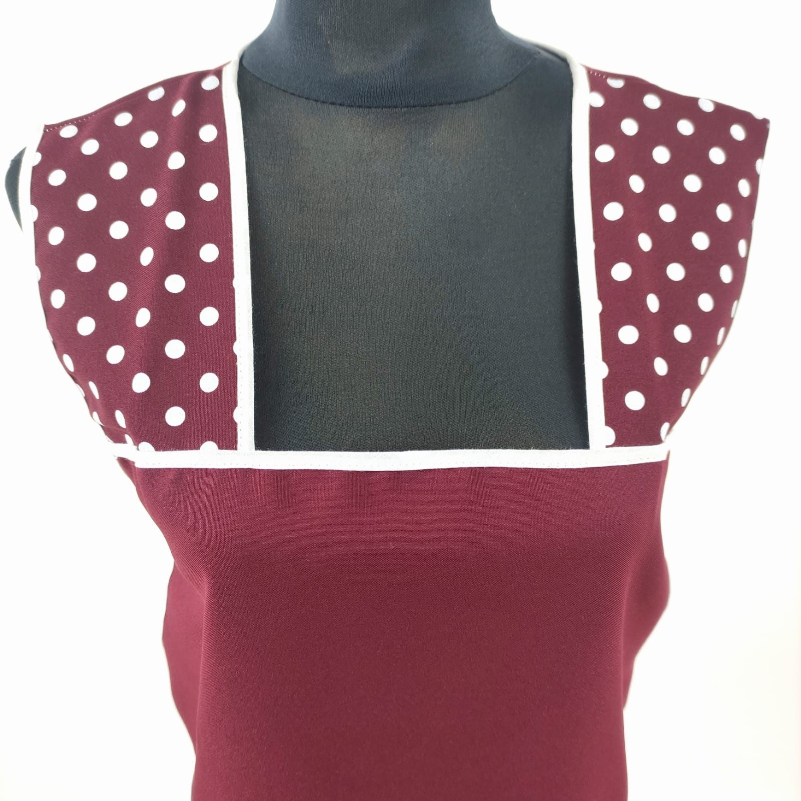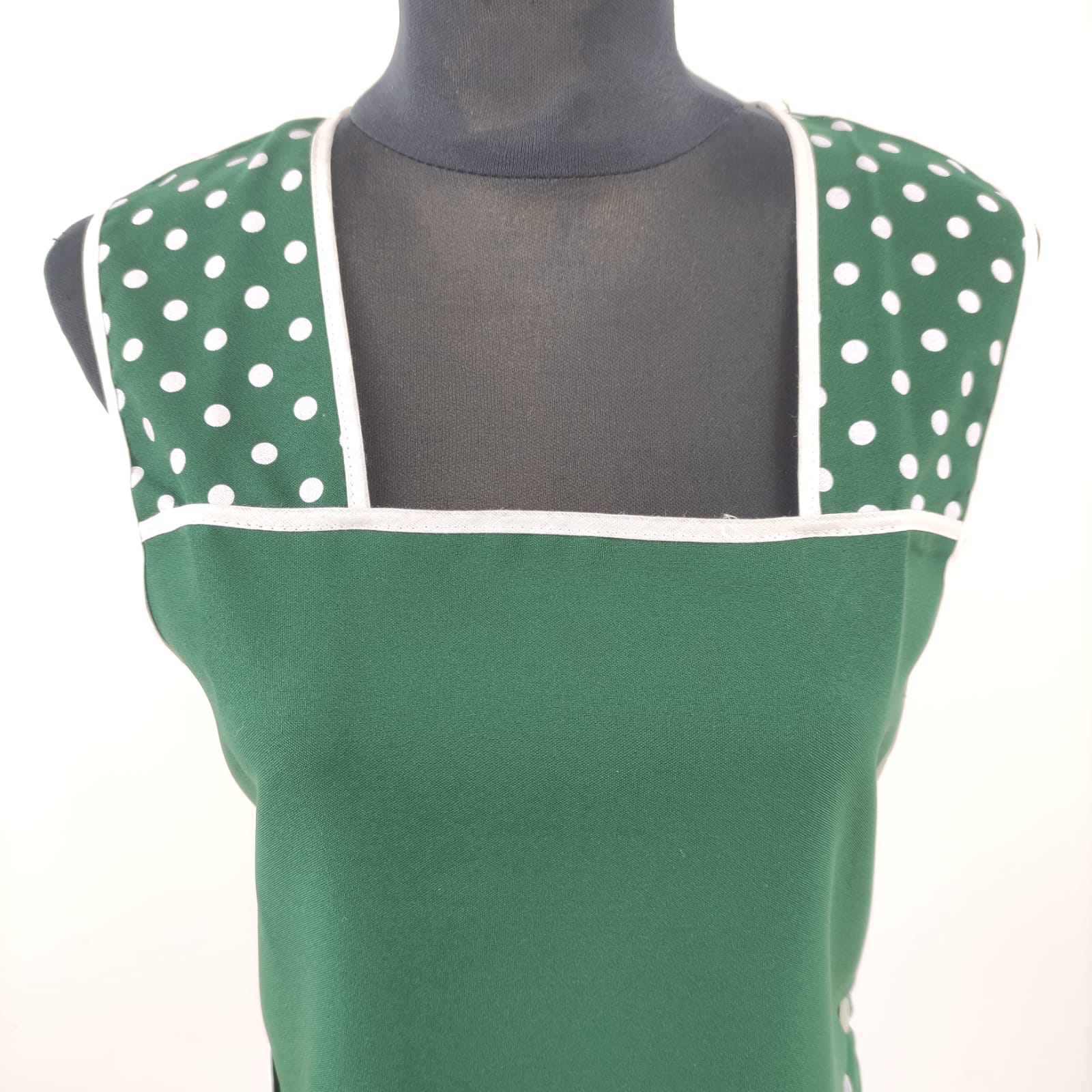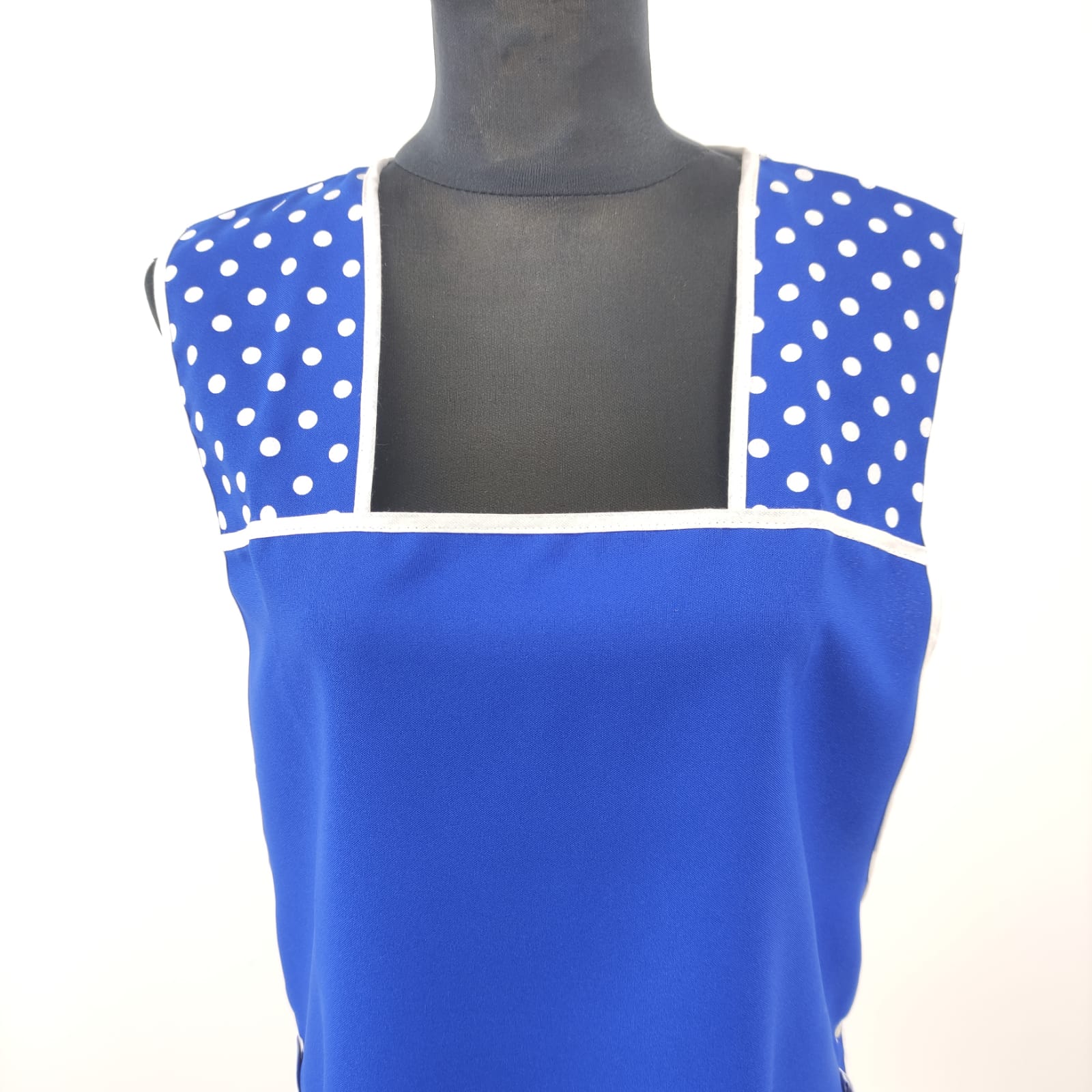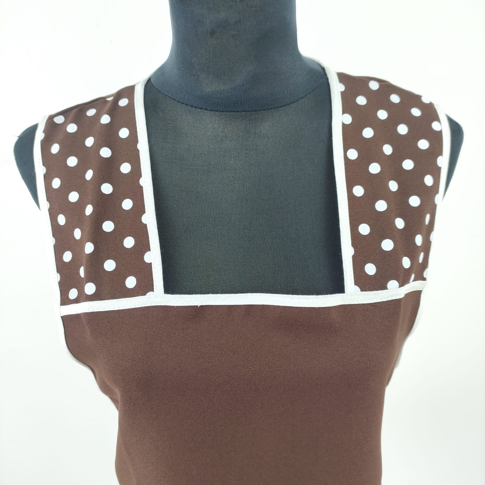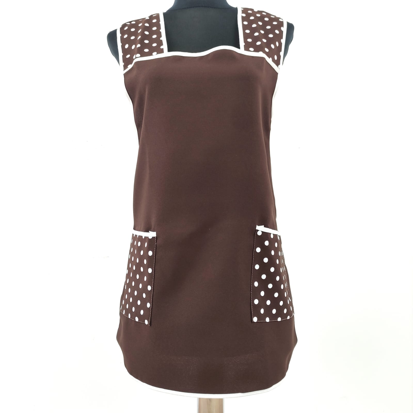 Bata em cor com pintinhas brancas. Bolsos e fecho de botões nas laterais.