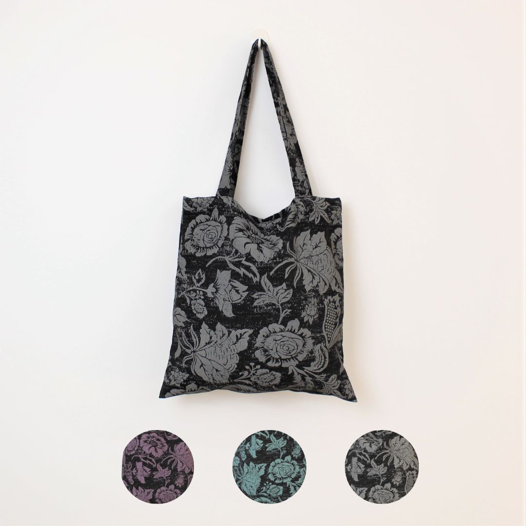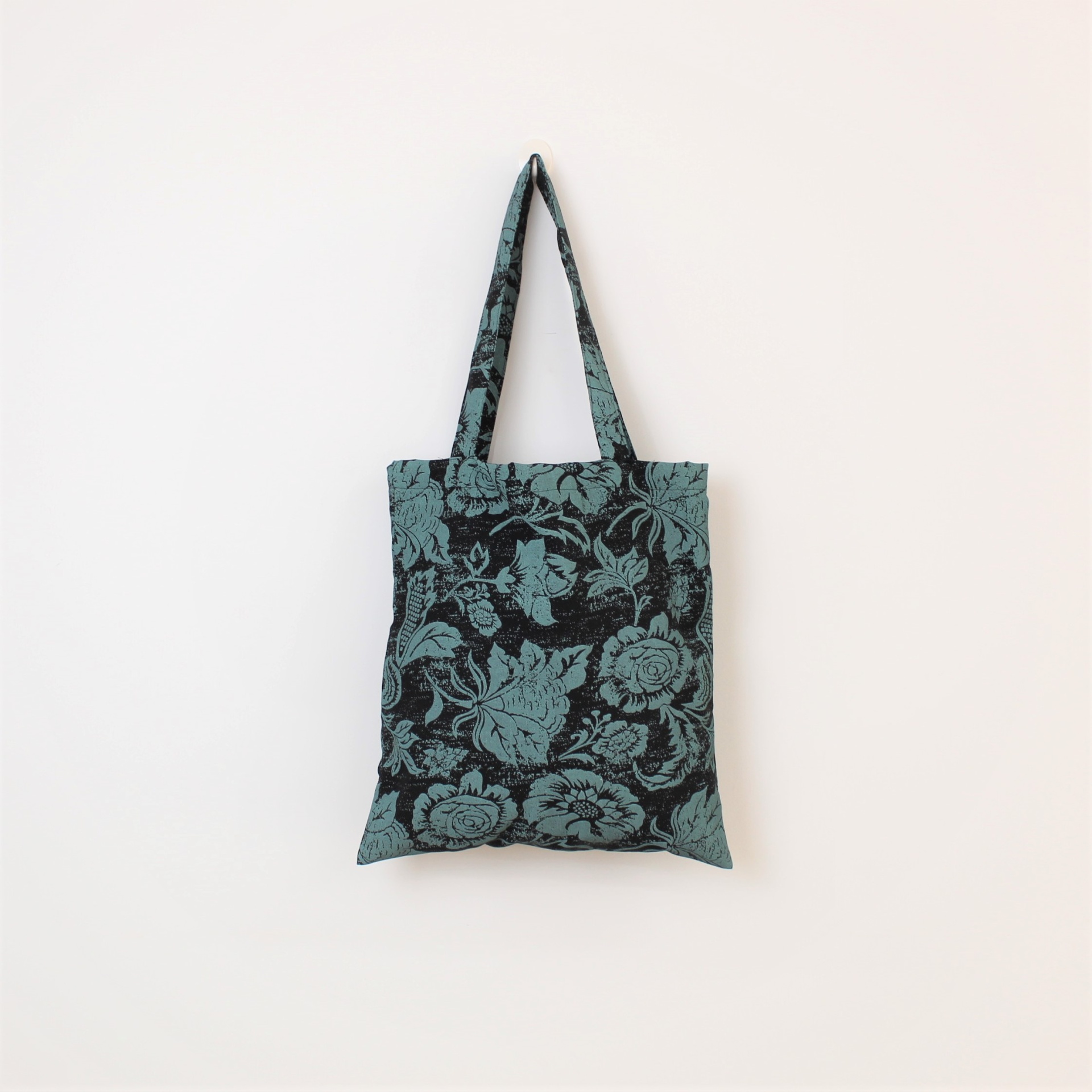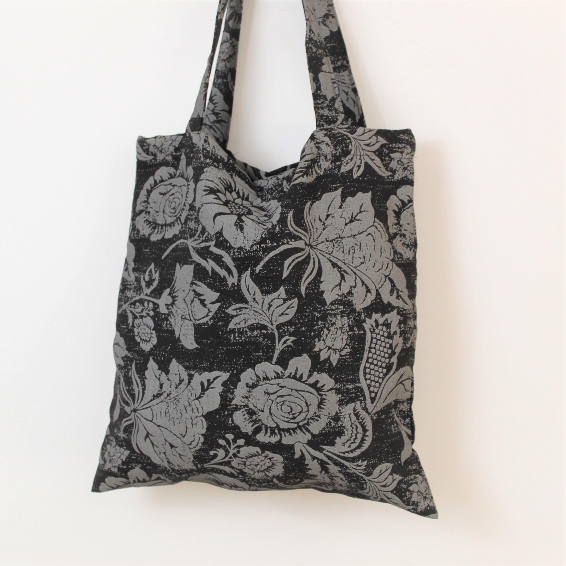 Bolsa de pano em algodão com estampado de fundo preto com alças para ombro, ideal para compras ou armazenamento de pertences. Dobrável e ecológico.