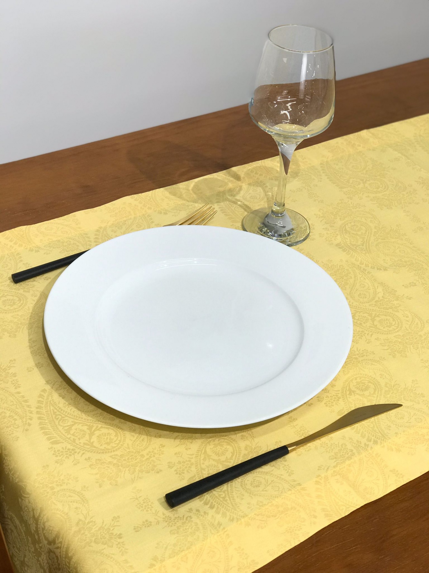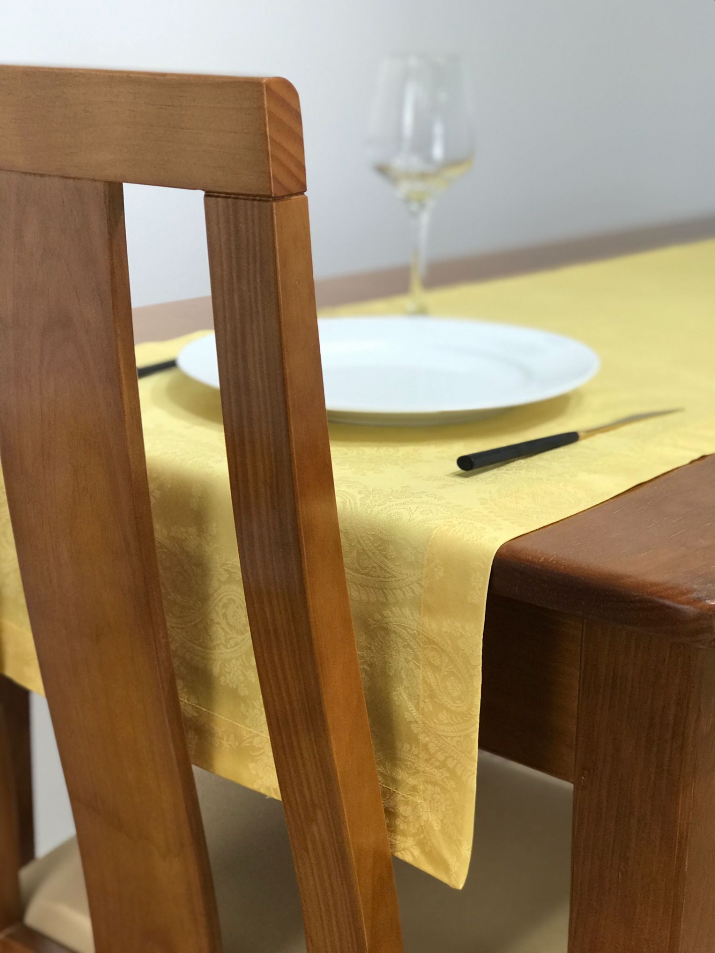 Caminho de mesa em Algodão Amarelo e detalhes ao fundo.
