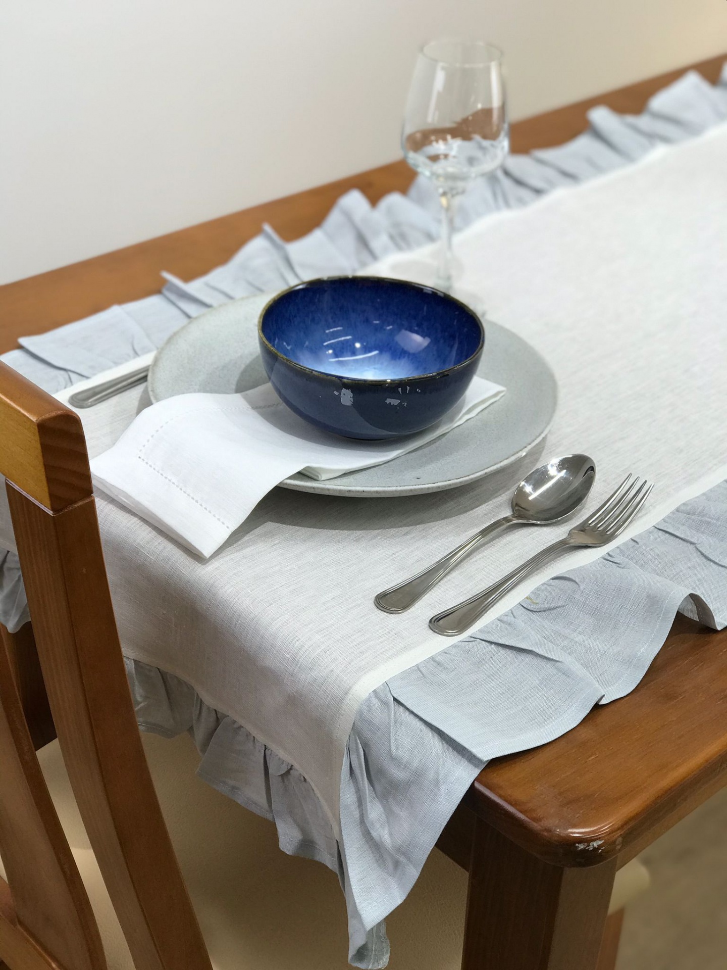 Caminho de mesa em linho com aplicação de folho a toda a volta.