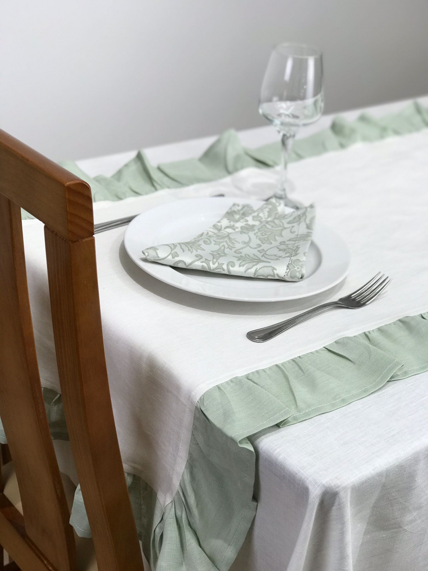 Caminho de mesa em linho com aplicação de folho a toda a volta.