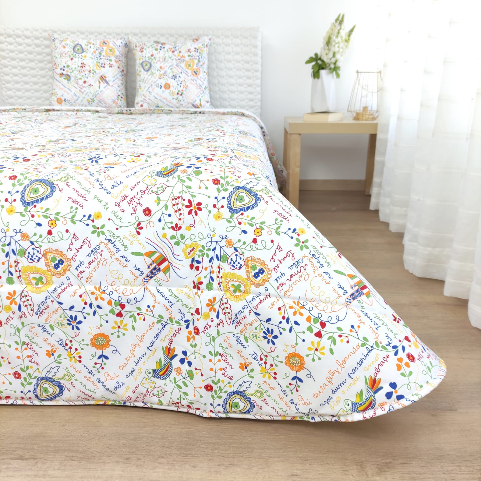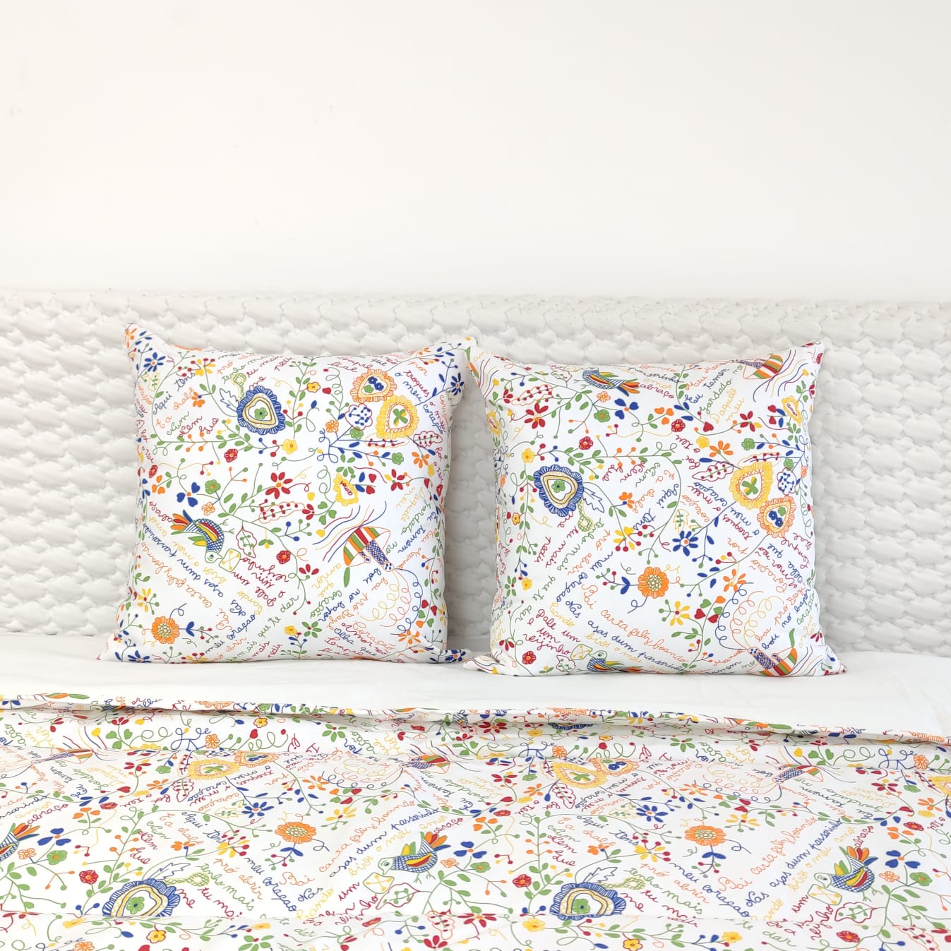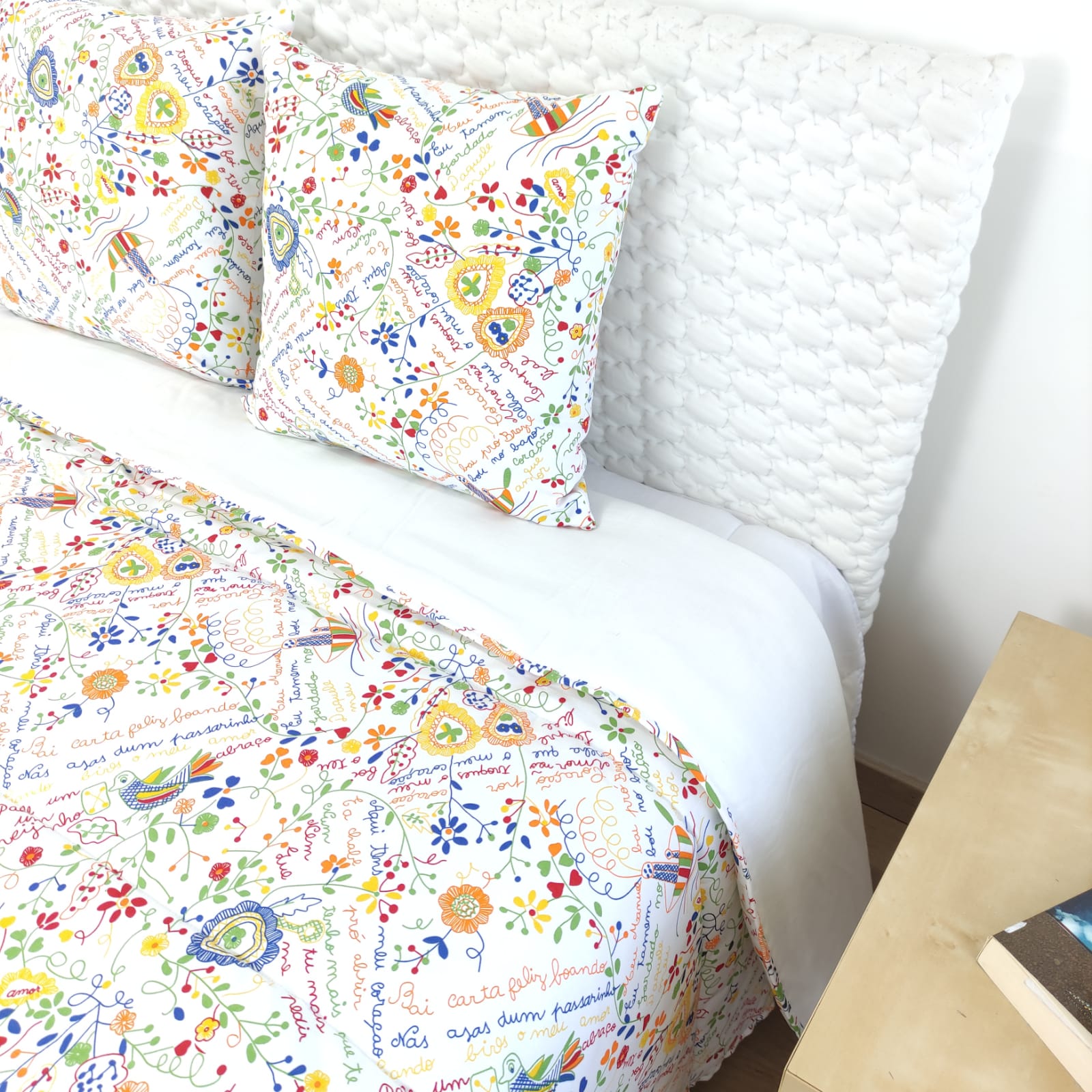 Capa de edredão estampada com frases e desenhos típicos dos naorados.