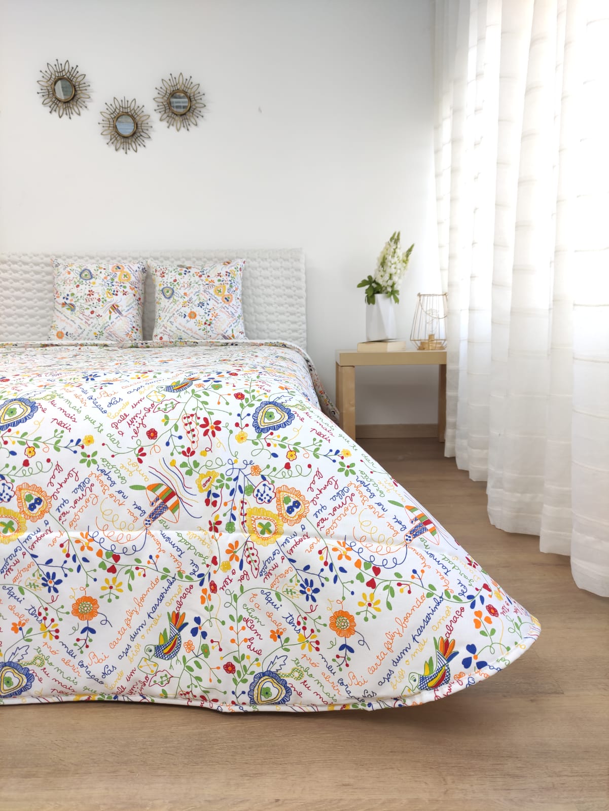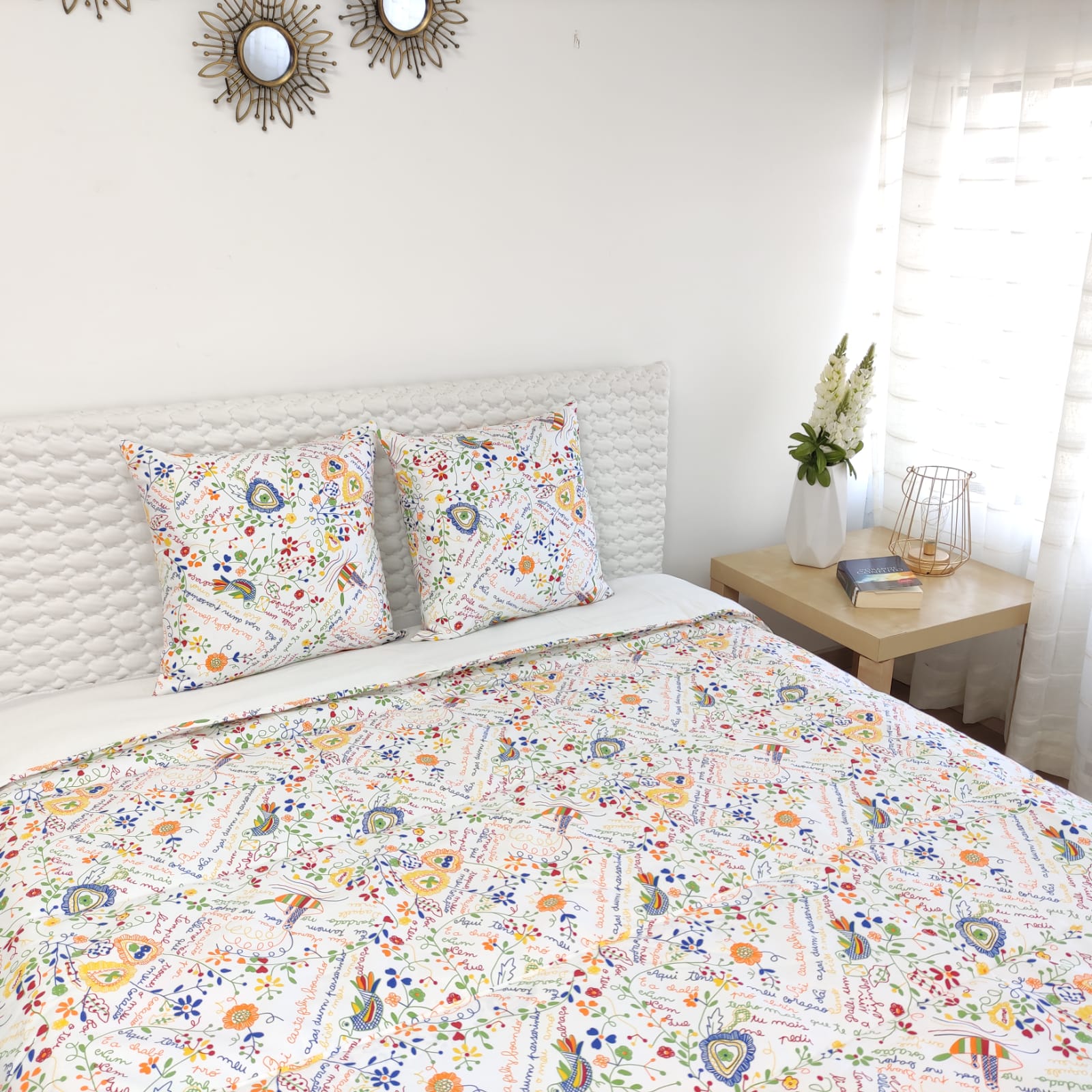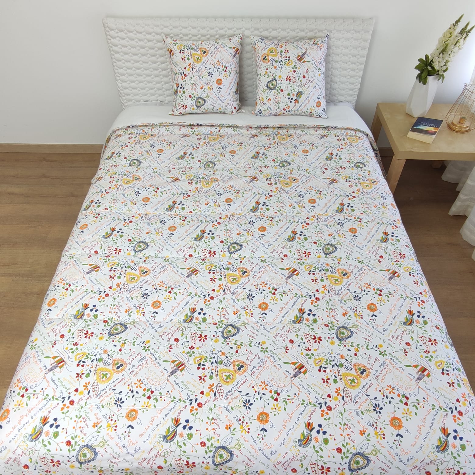 Capa de edredão estampada com frases e desenhos típicos dos naorados.