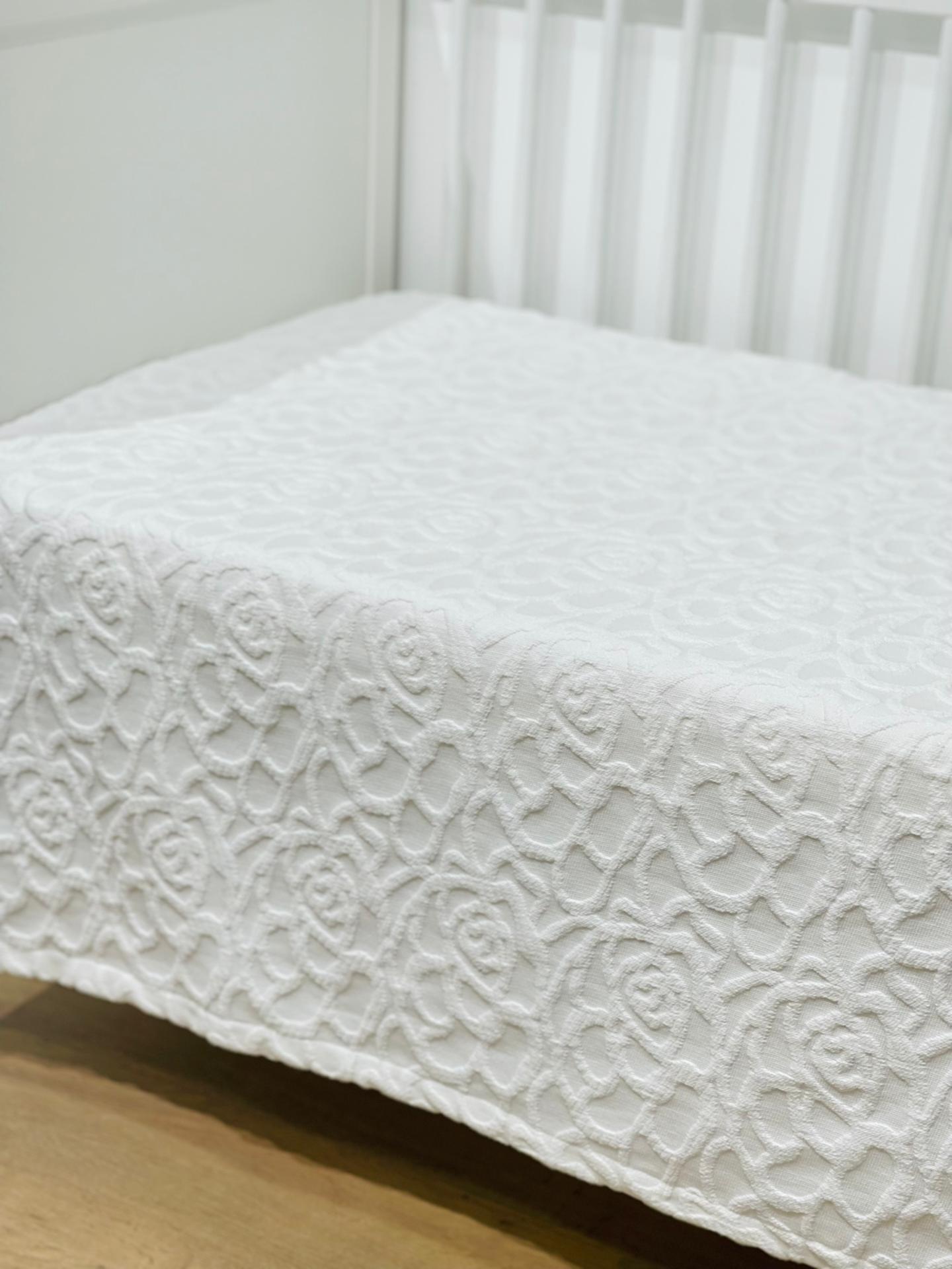 Colcha de algodão para berço com estilo tradicional, elegante e delicado evidenciado pela qualidade das matérias-primas escolhidas.