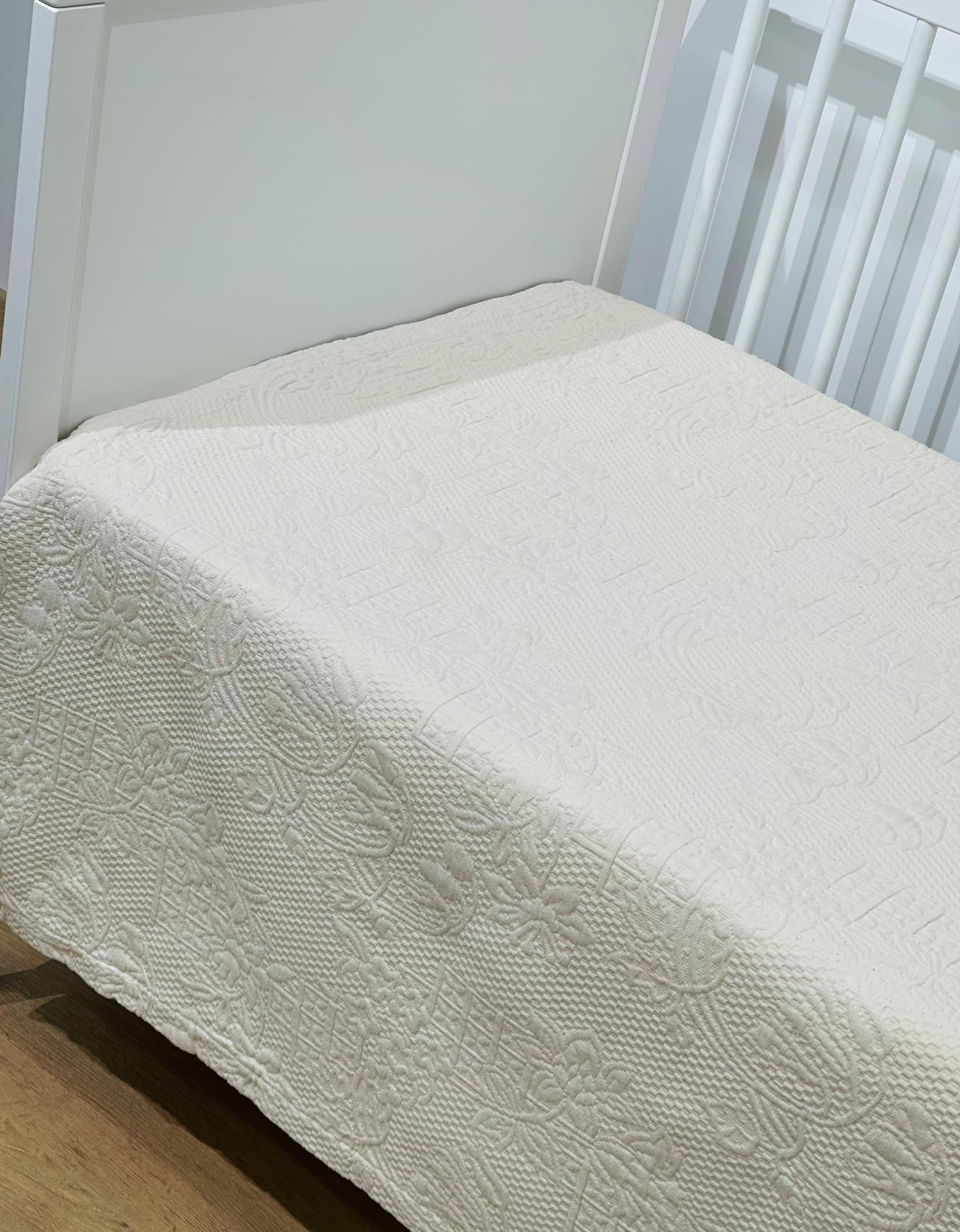 Colcha de algodão para berço com estilo tradicional, elegante e delicado evidenciado pela qualidade das matérias-primas escolhidas.