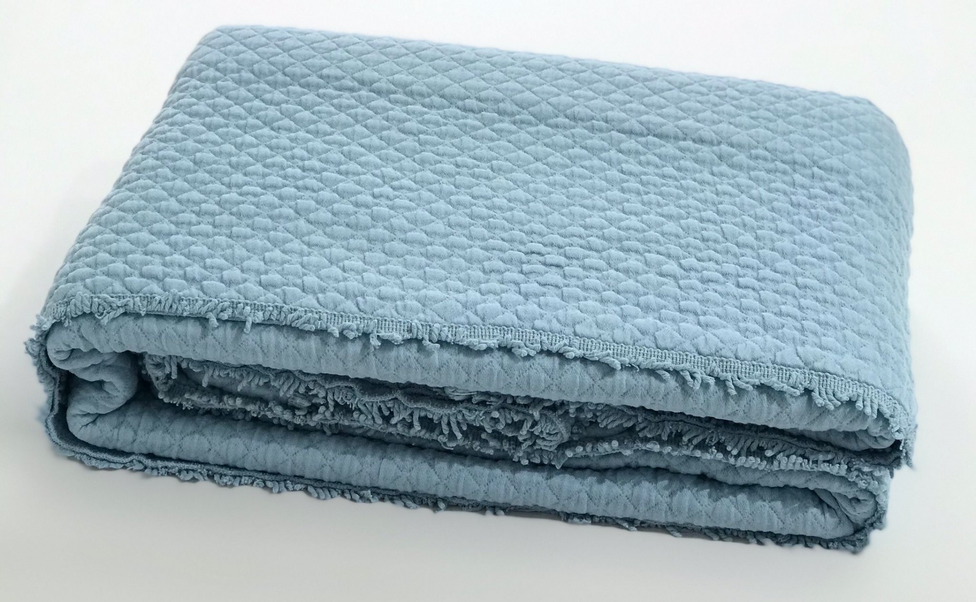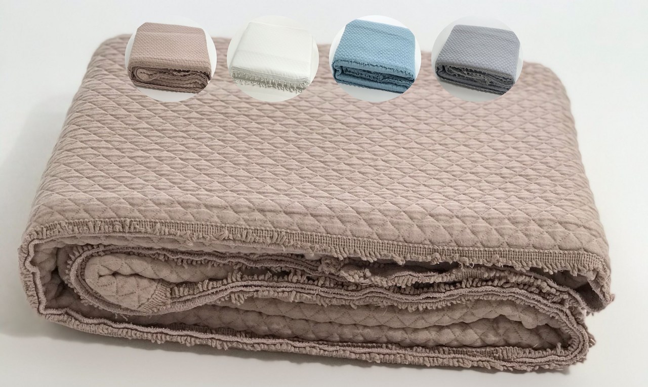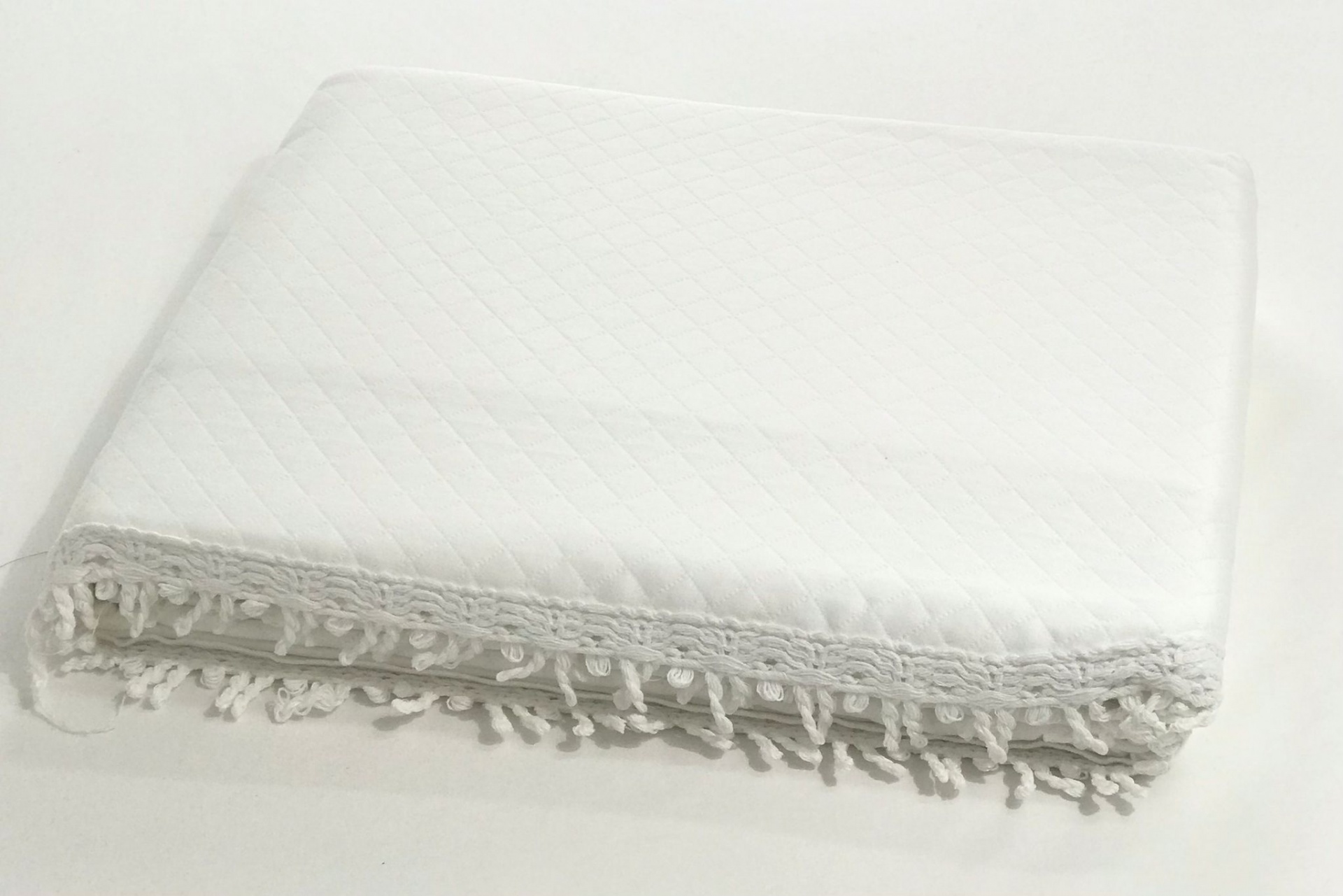 Colcha em algodão com detalhe de franja a toda a volta da colcha.