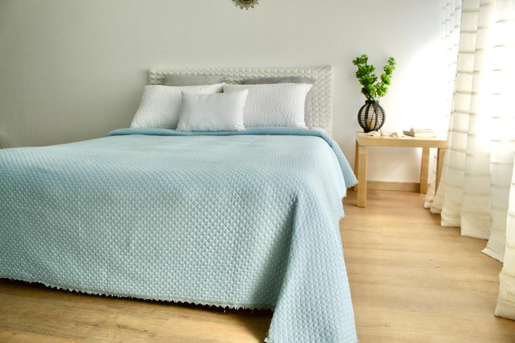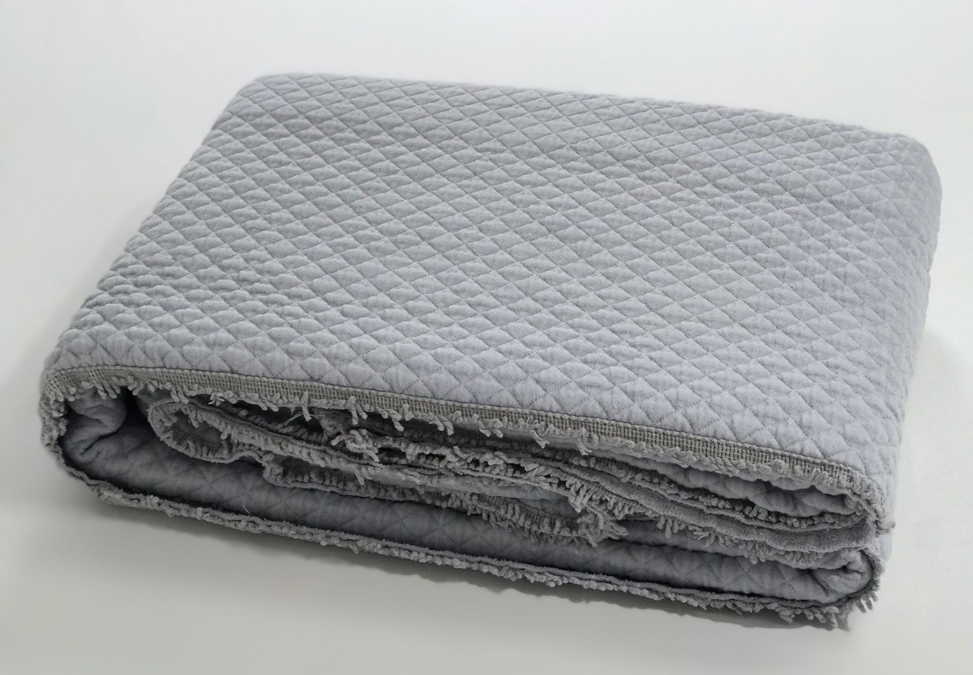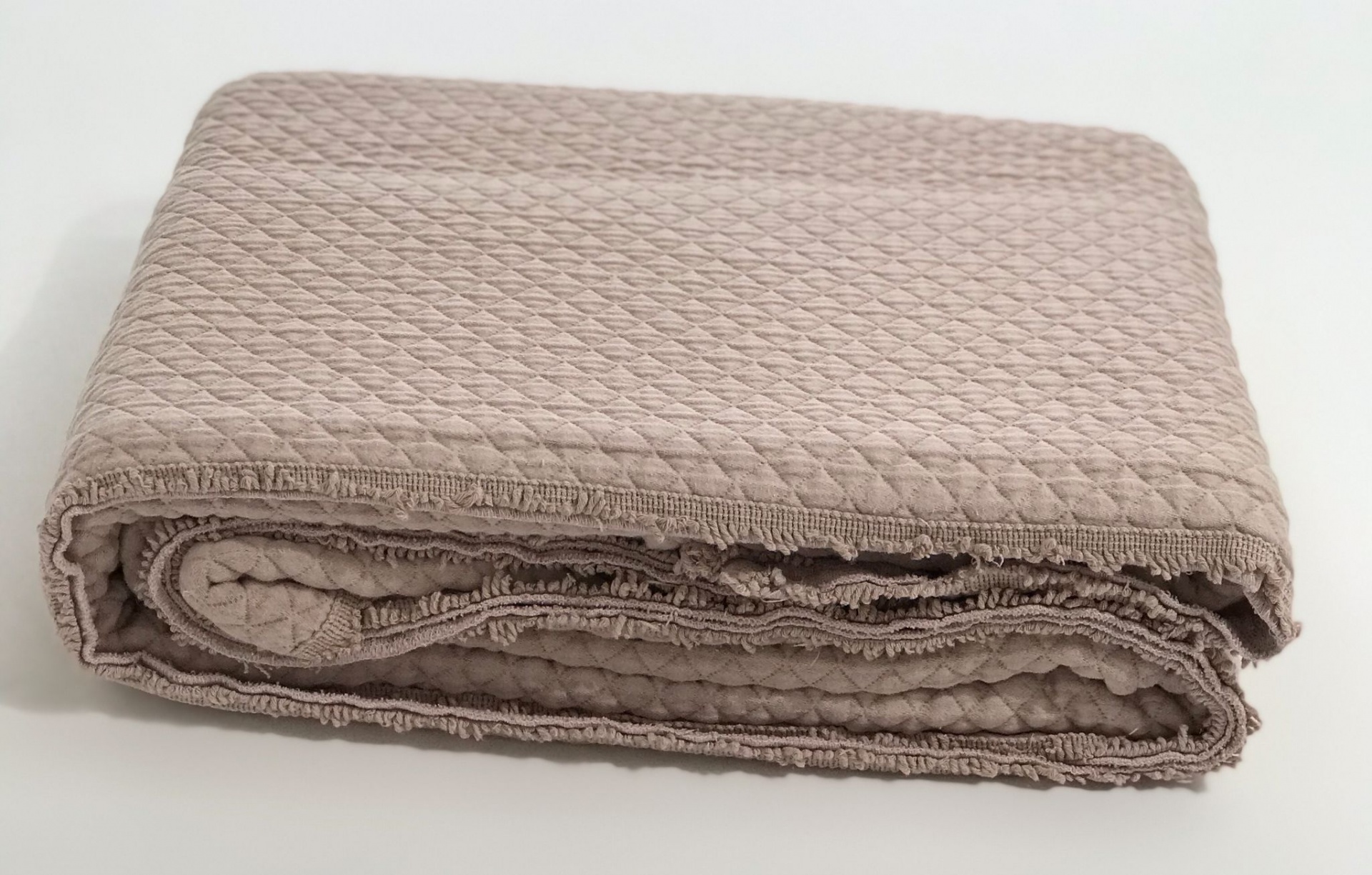 Colcha em algodão com detalhe de franja a toda a volta da colcha.
