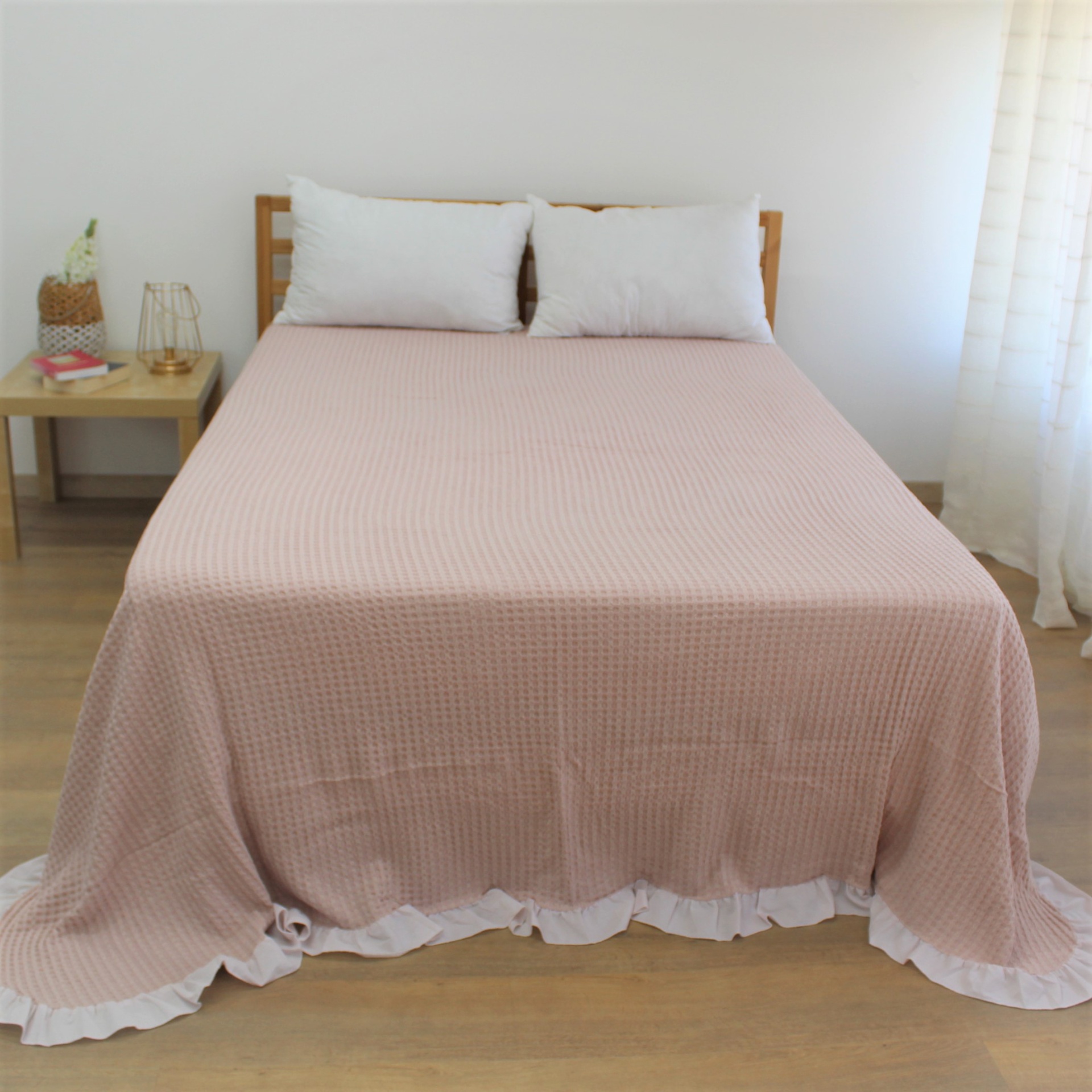 Colcha em algodão com detalhe de folho a toda a volta da colcha.