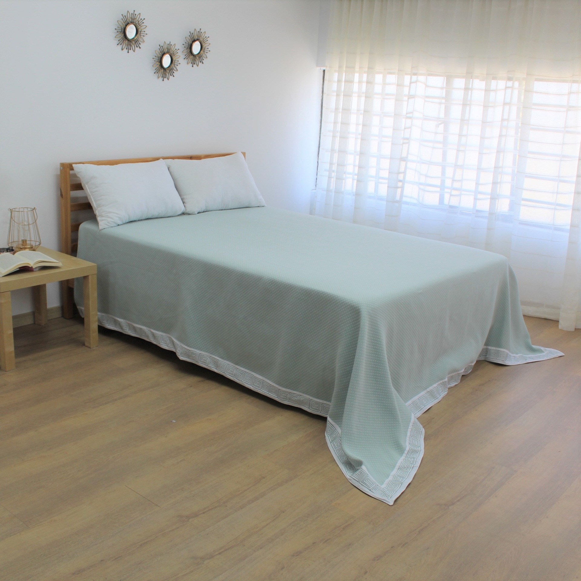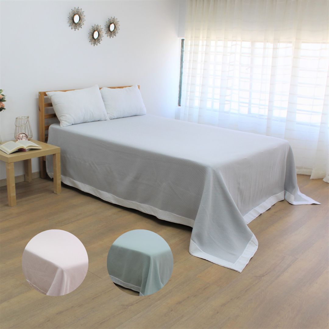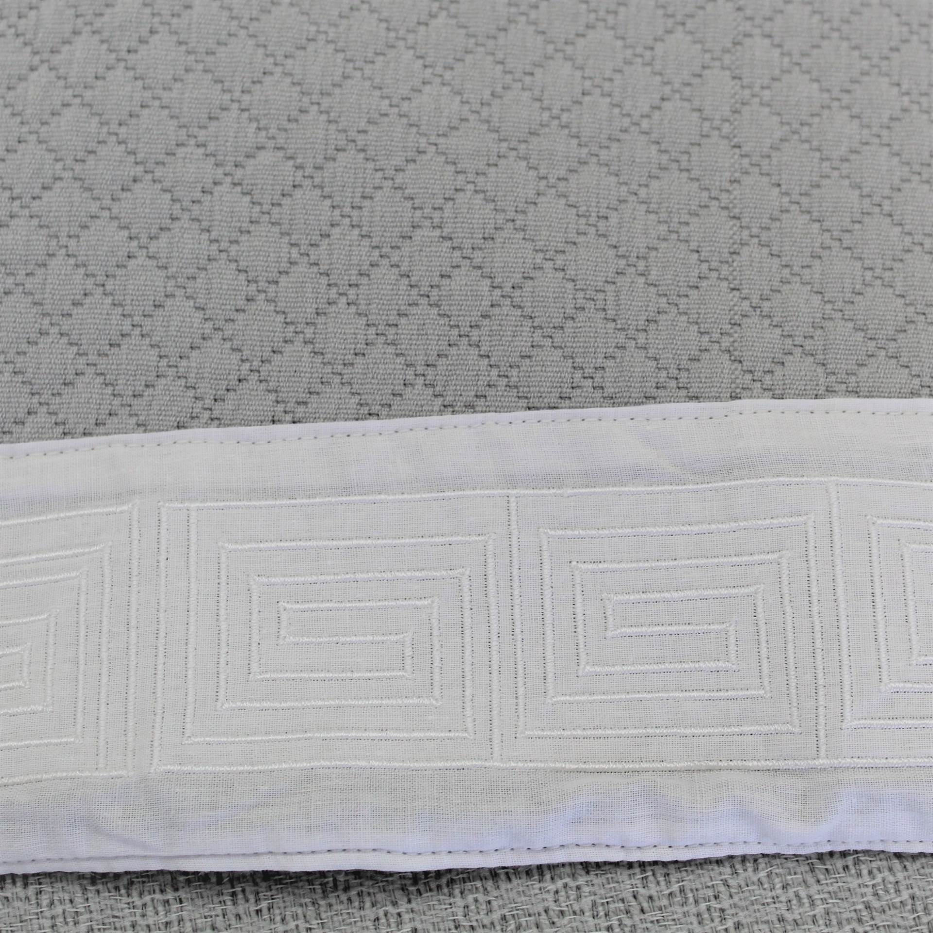 Colcha modelo Grécia em diferentes tons , com um design discreto e com um estampado todo a volta.