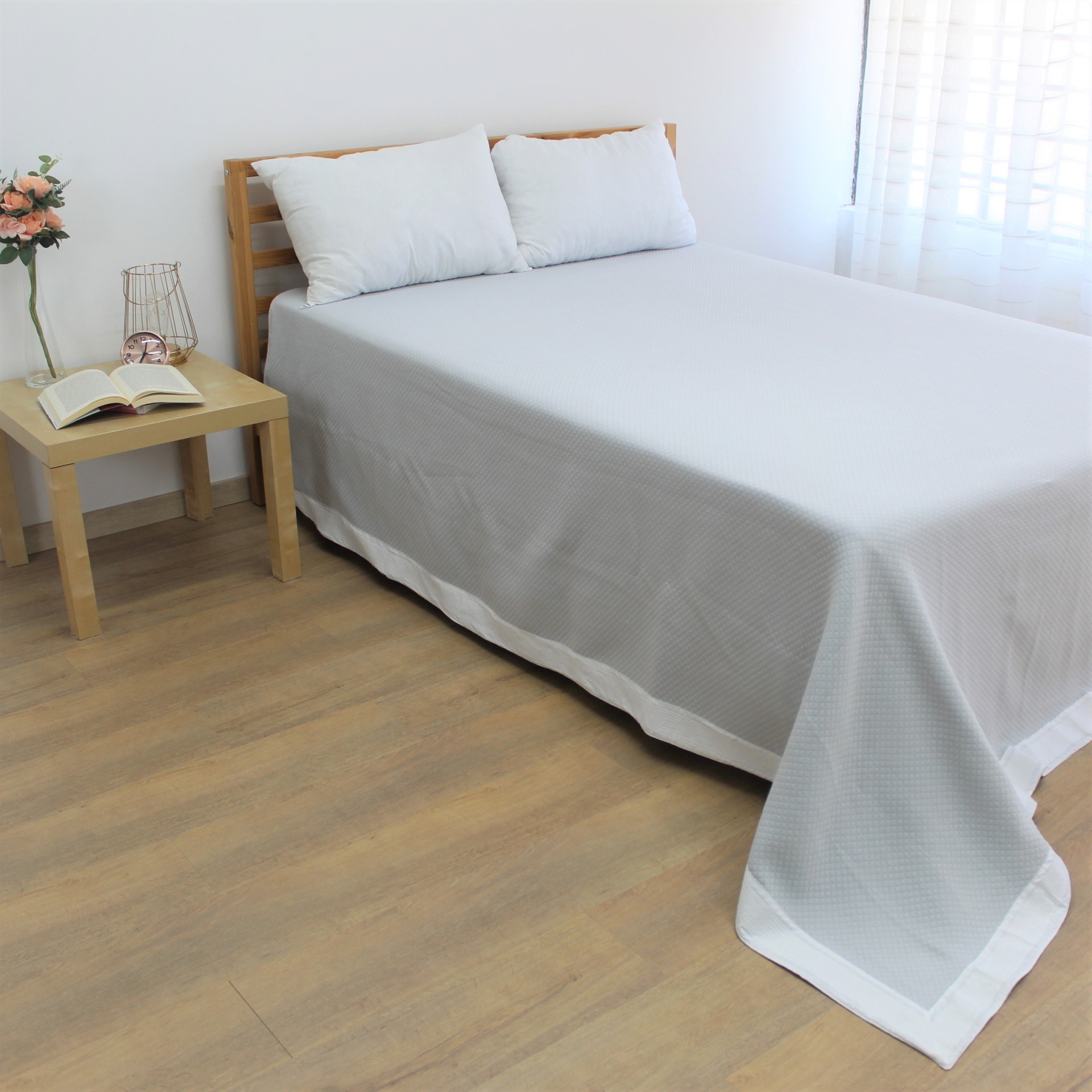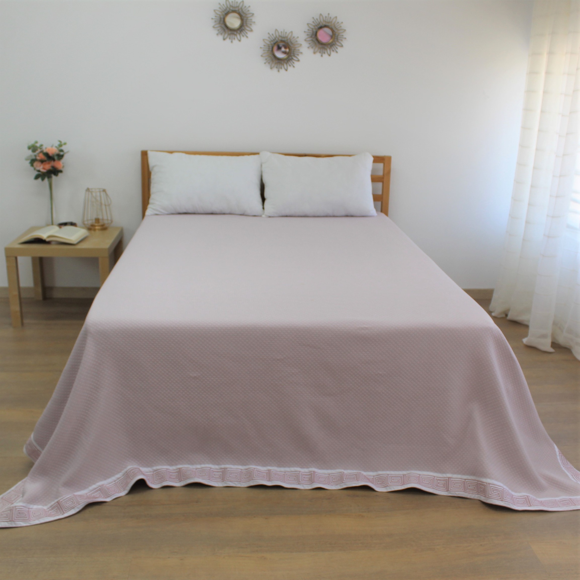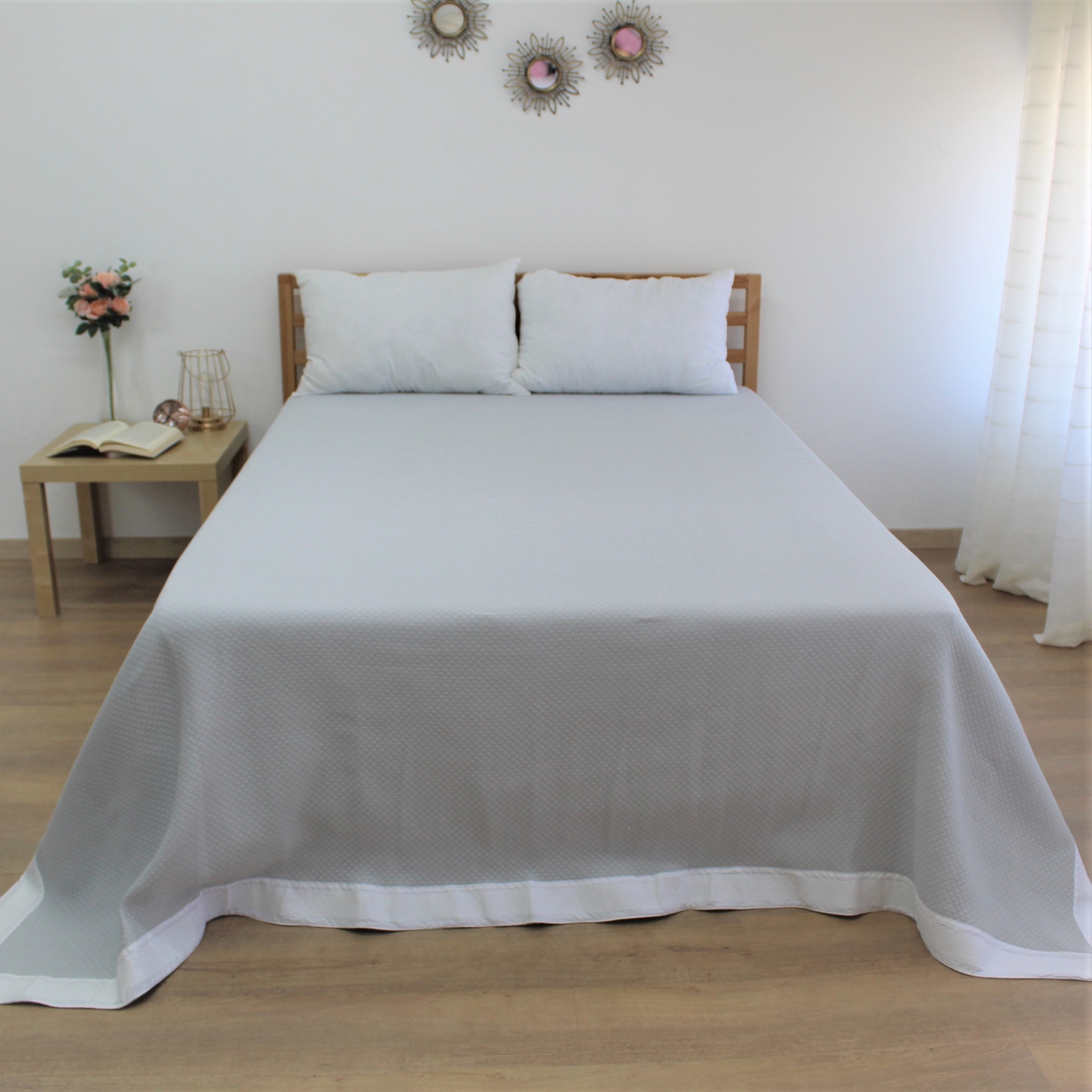Colcha modelo Grécia em diferentes tons , com um design discreto e com um estampado todo a volta.