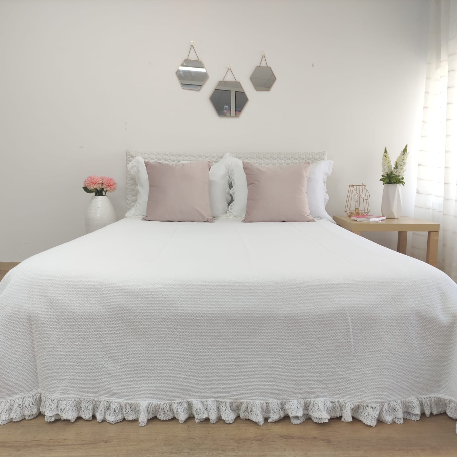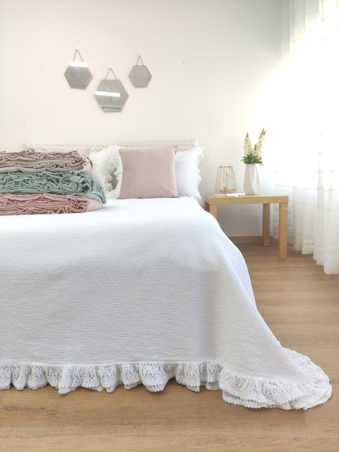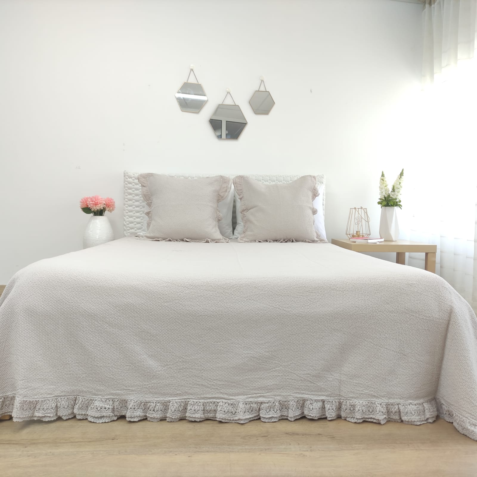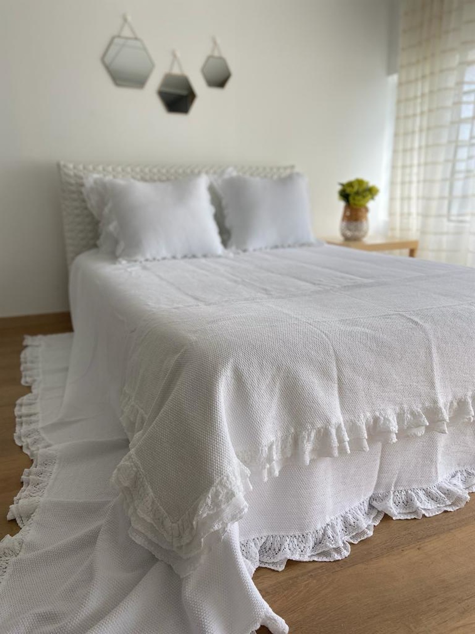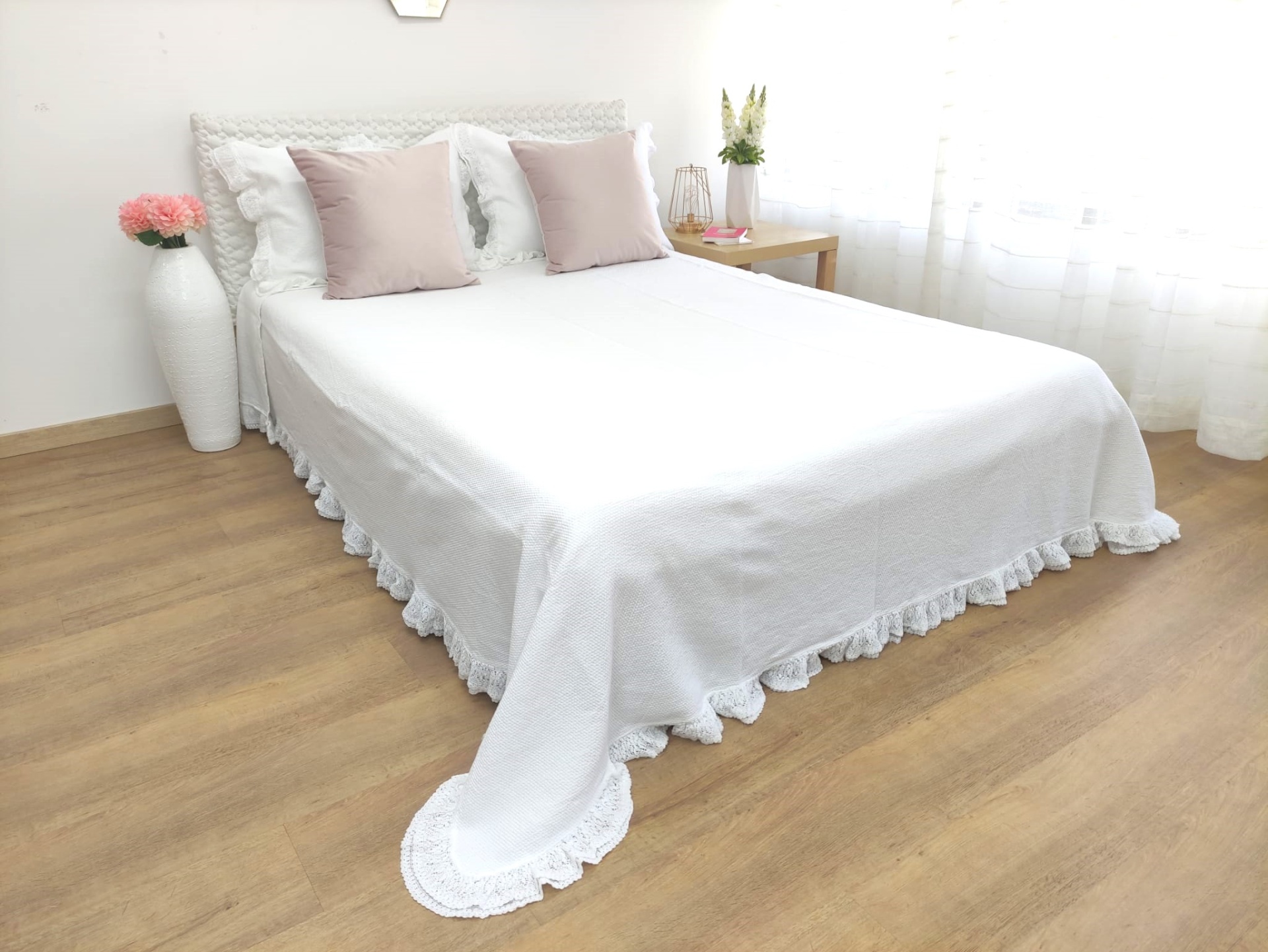 Colcha premium, 100% algodão, efeito trabalhado discreto e elegante. Detalhe de acabamento de folho a toda a volta.