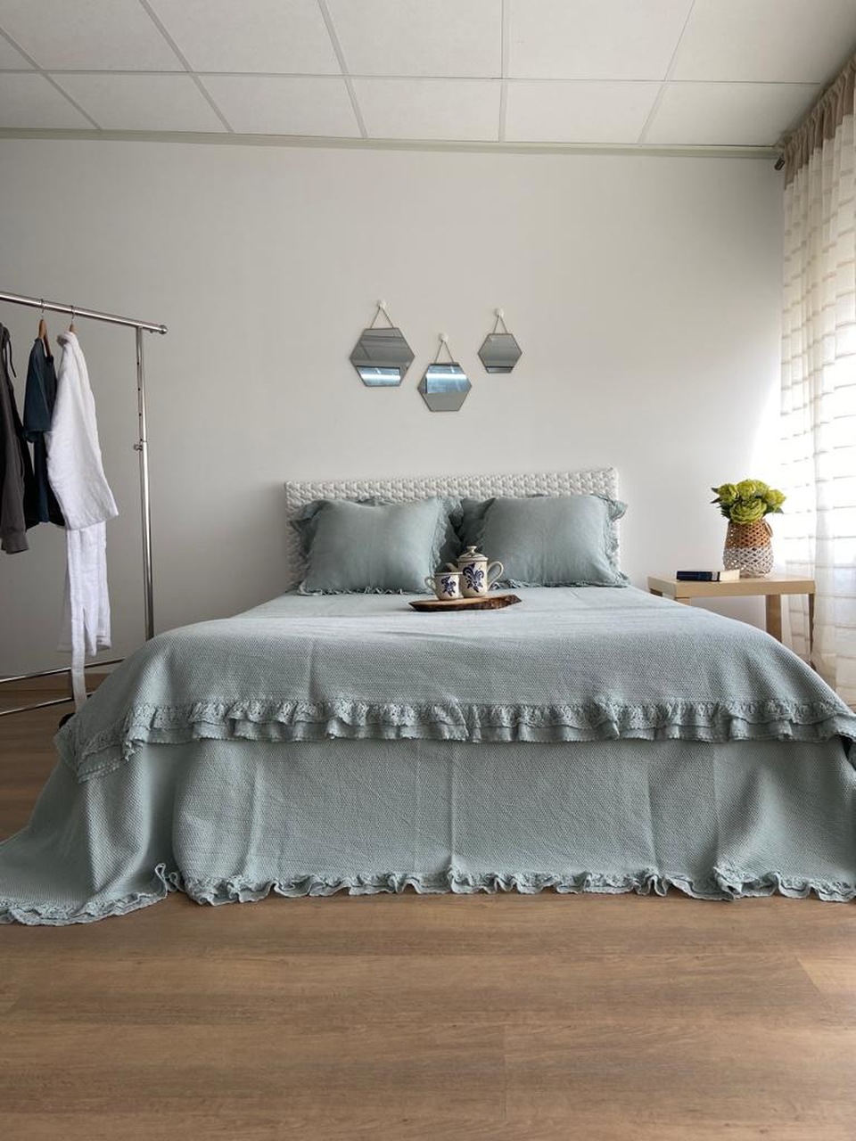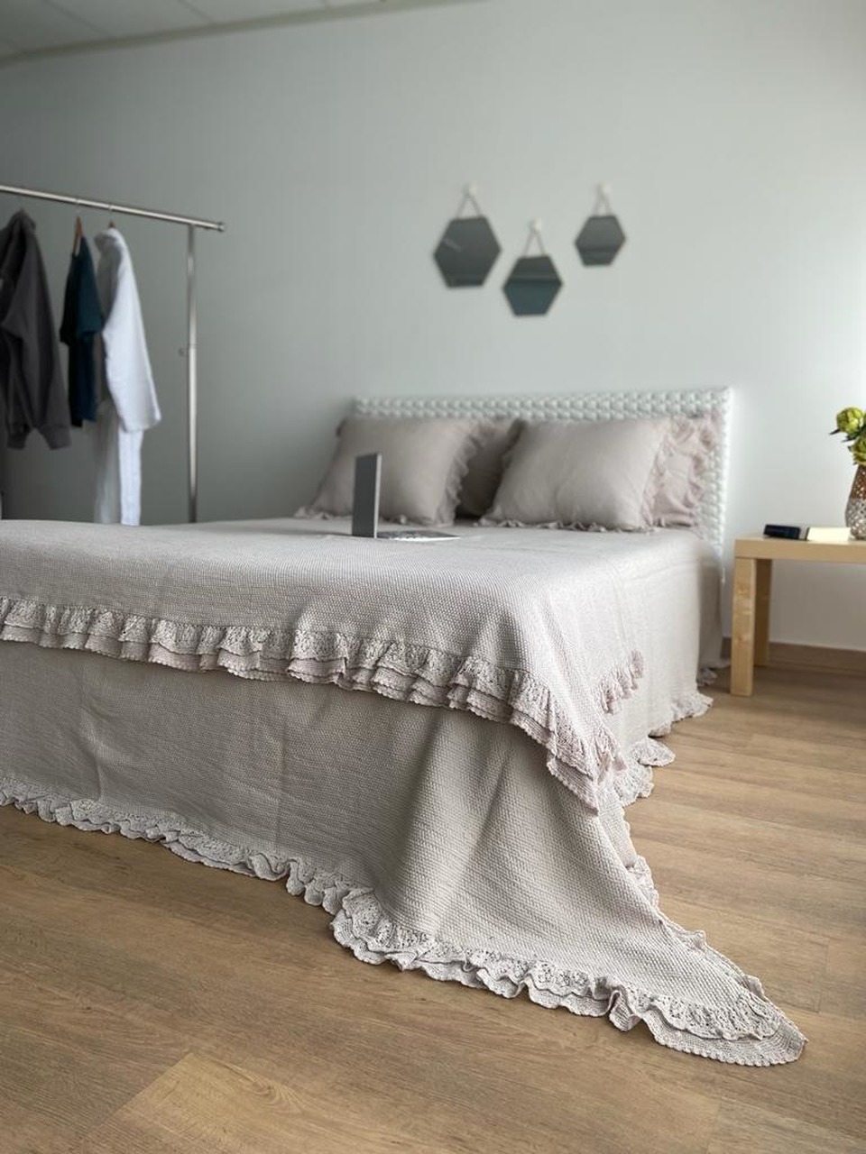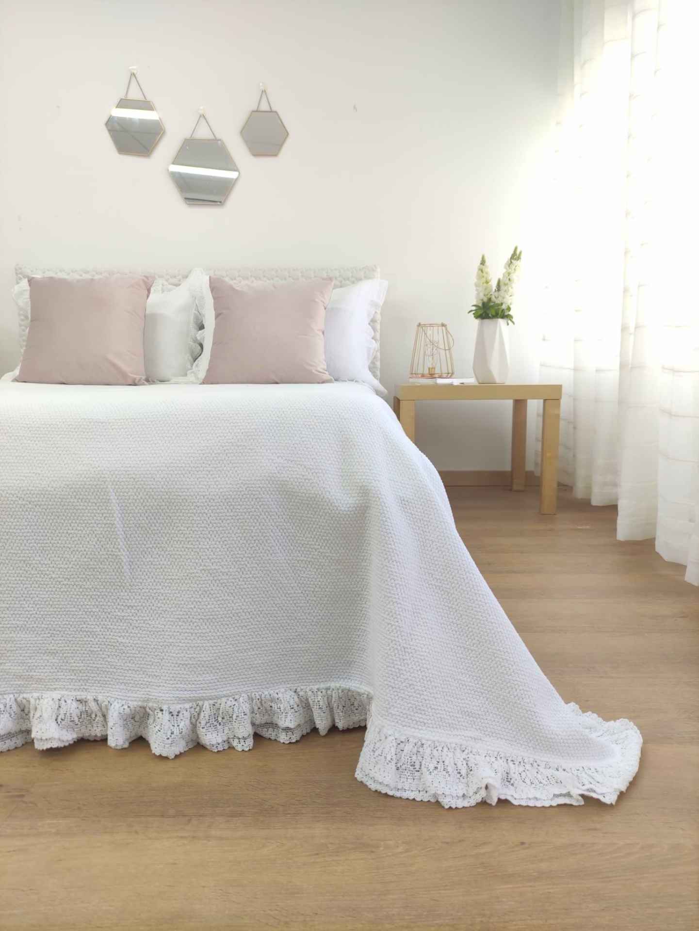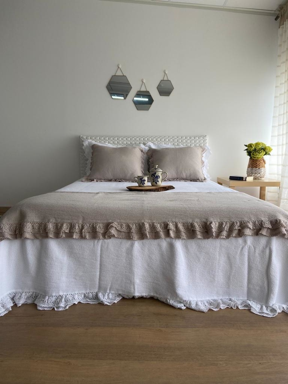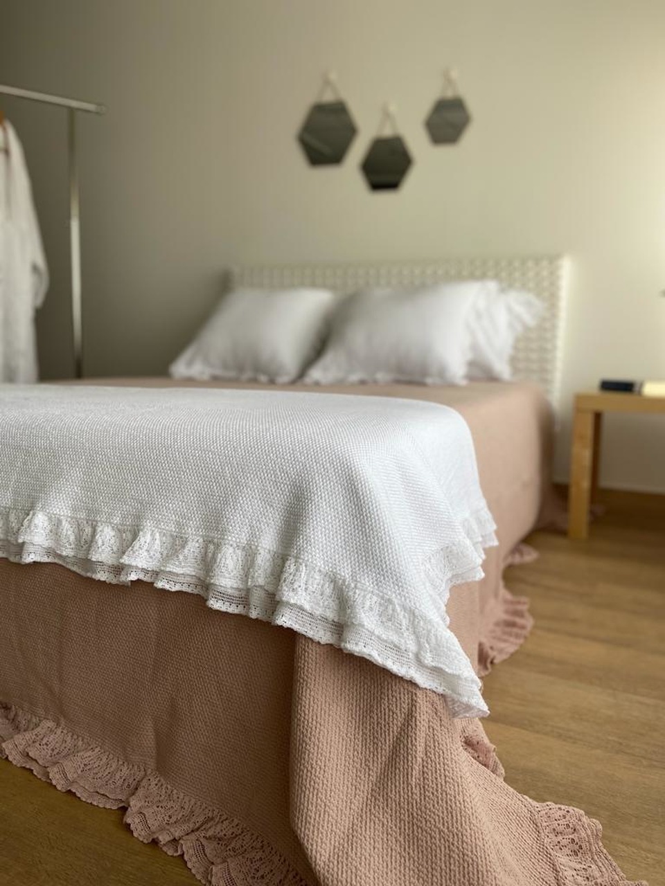 Colcha premium, 100% algodão, efeito trabalhado discreto e elegante. Detalhe de acabamento de folho a toda a volta.