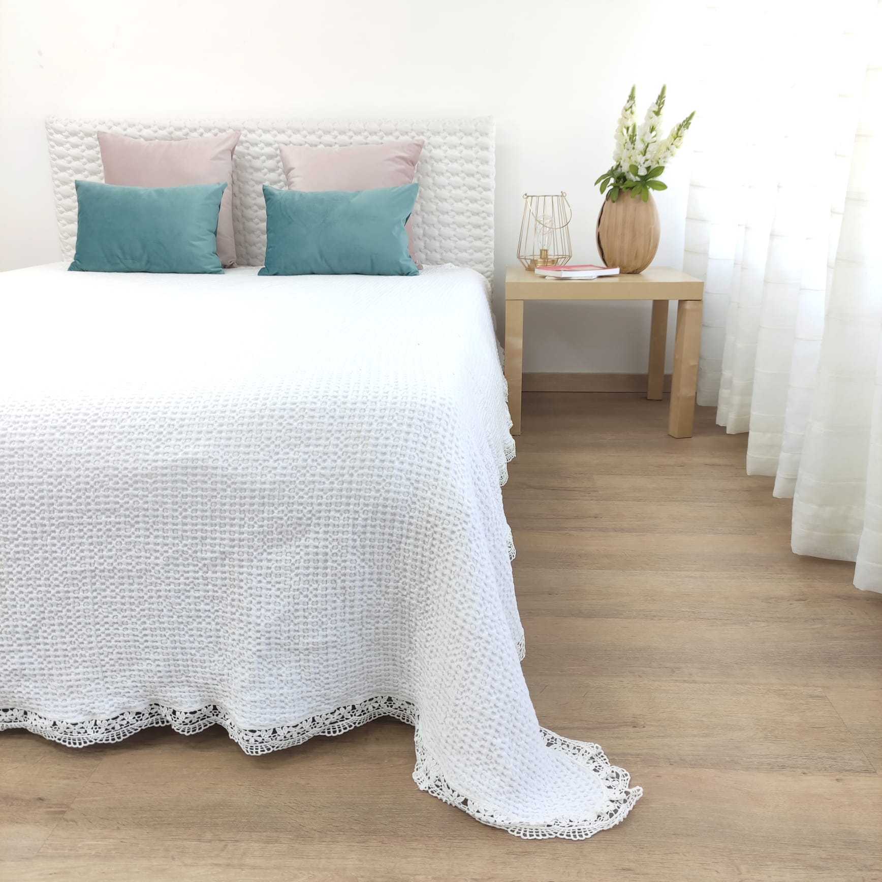 Colcha Roma em algodão branco com textura e acabamento em renda