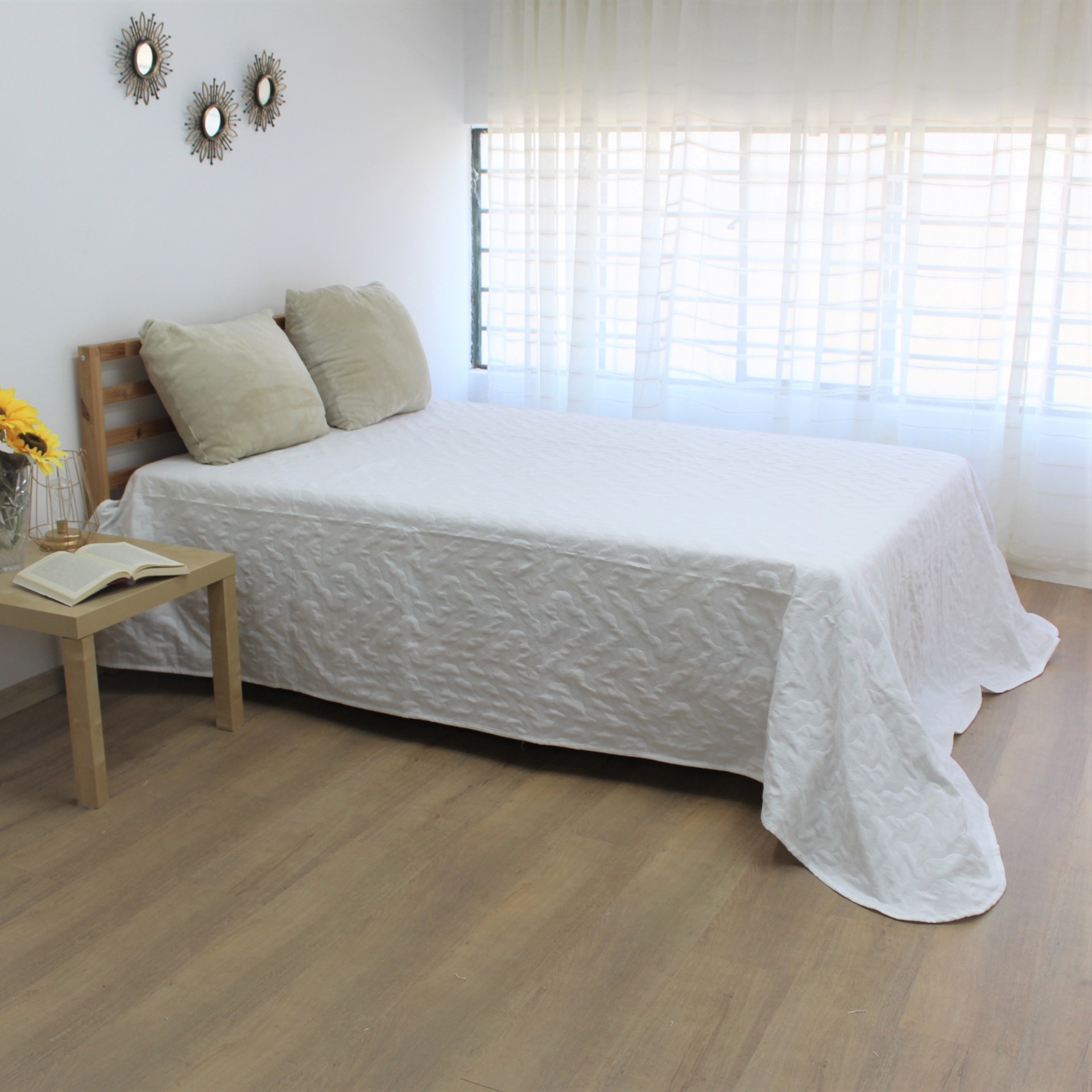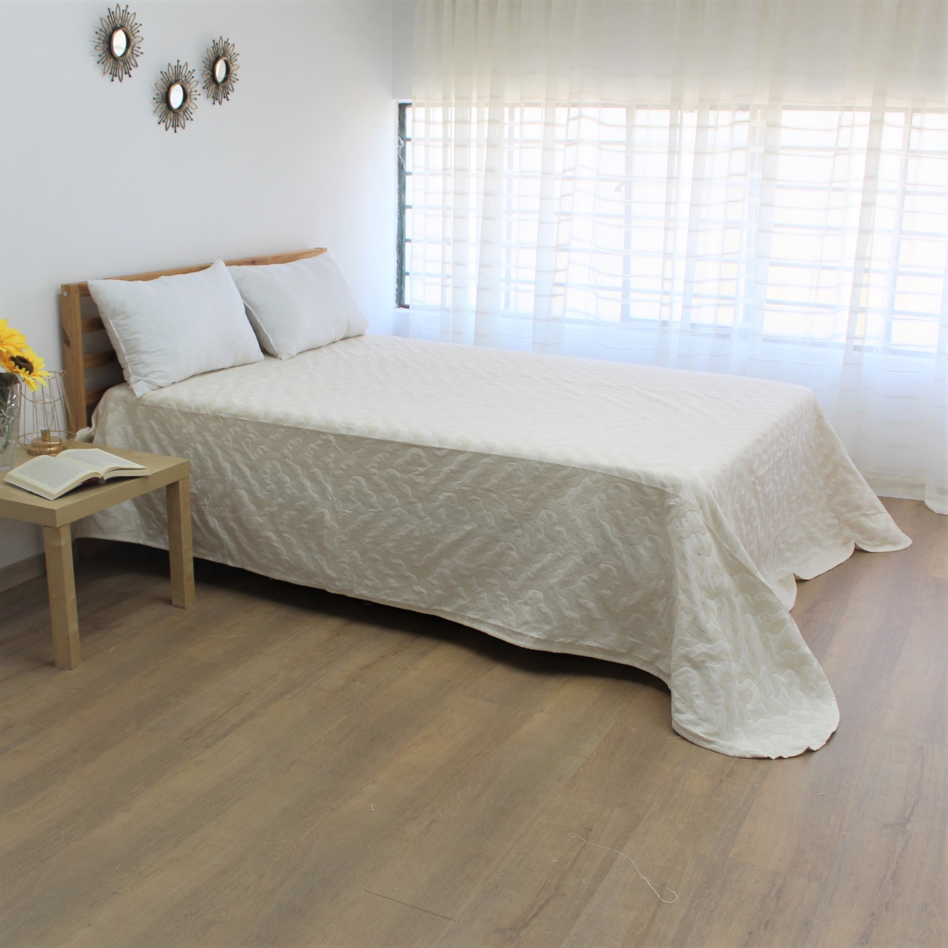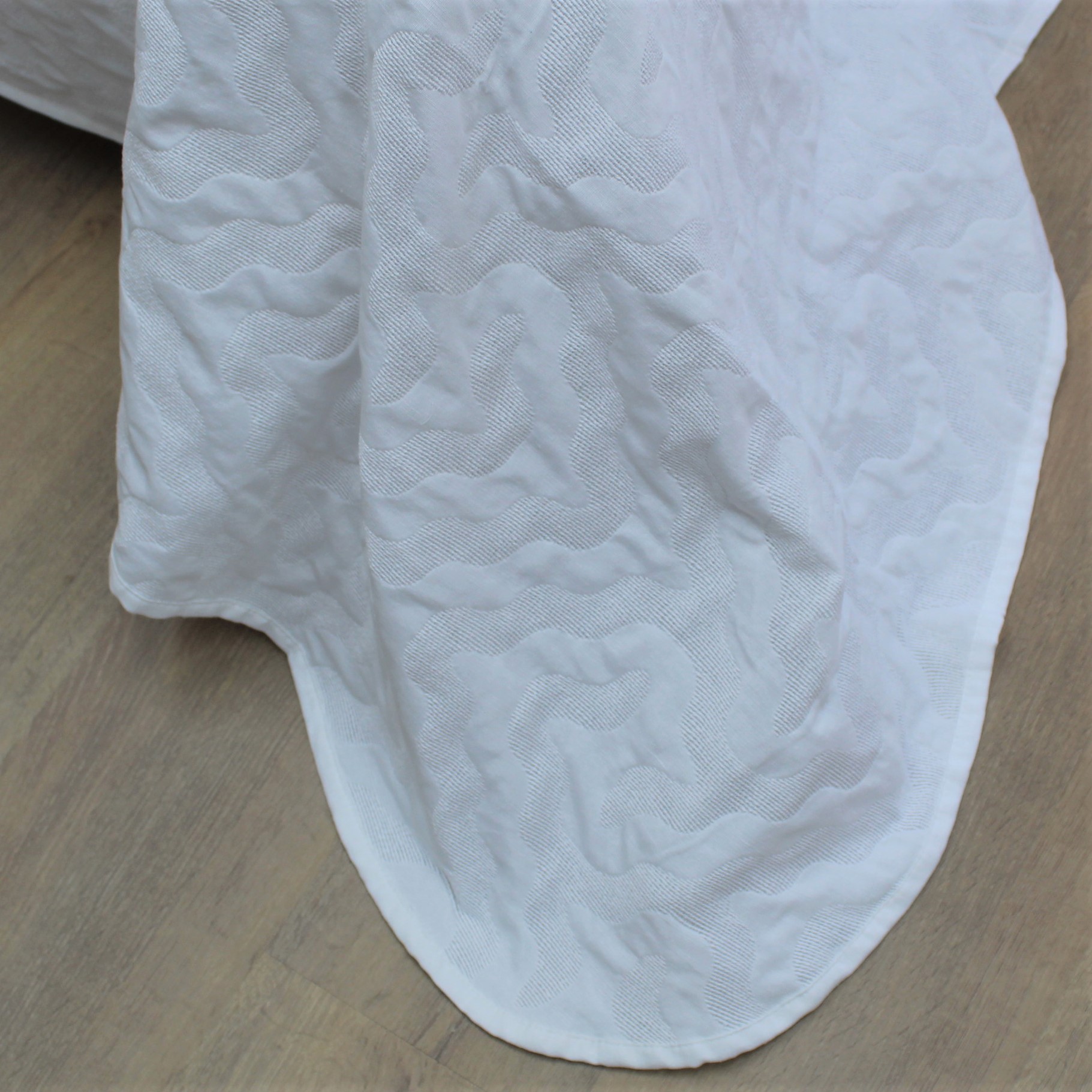 Colcha modelo Rosia em tom branco e bege, com um design discreto.