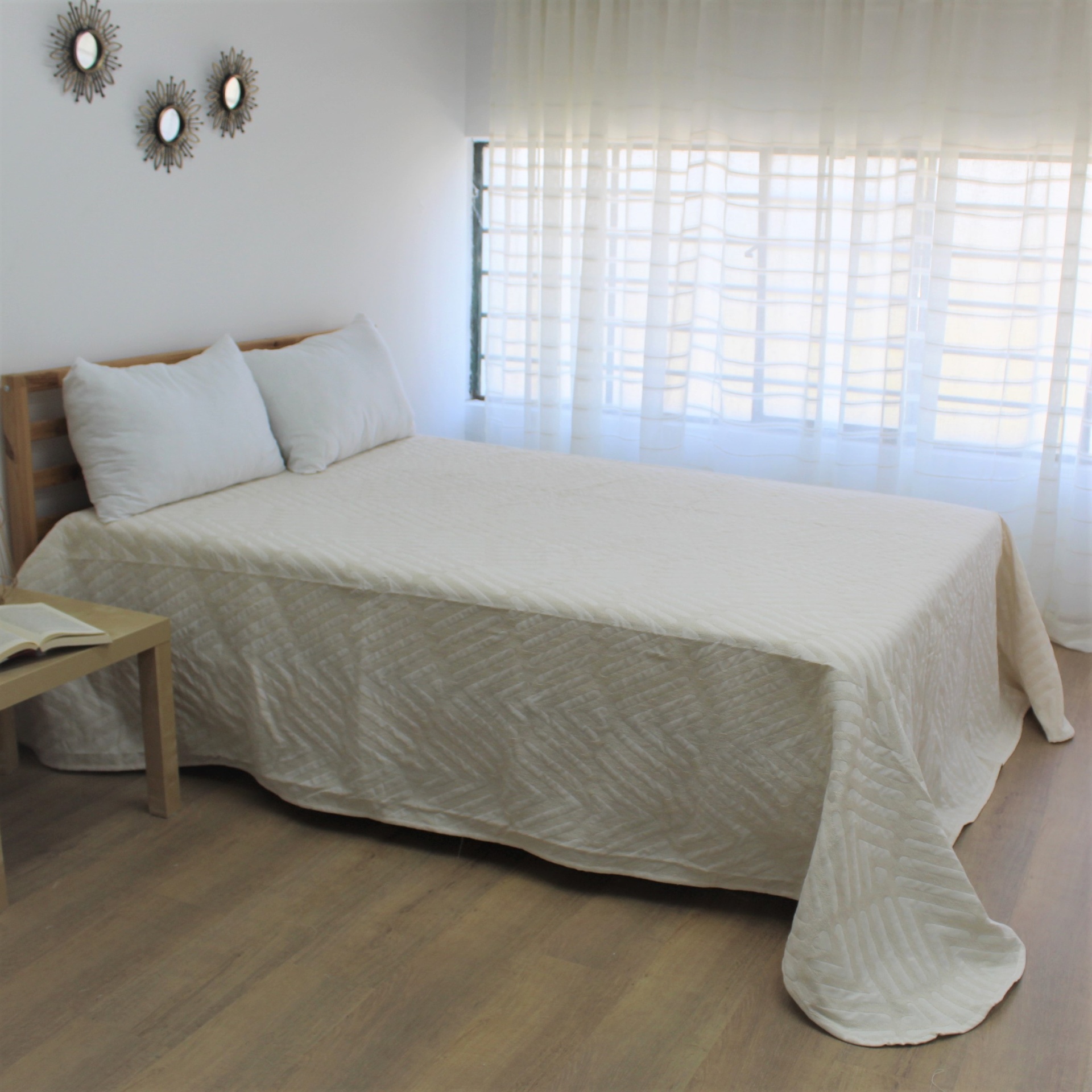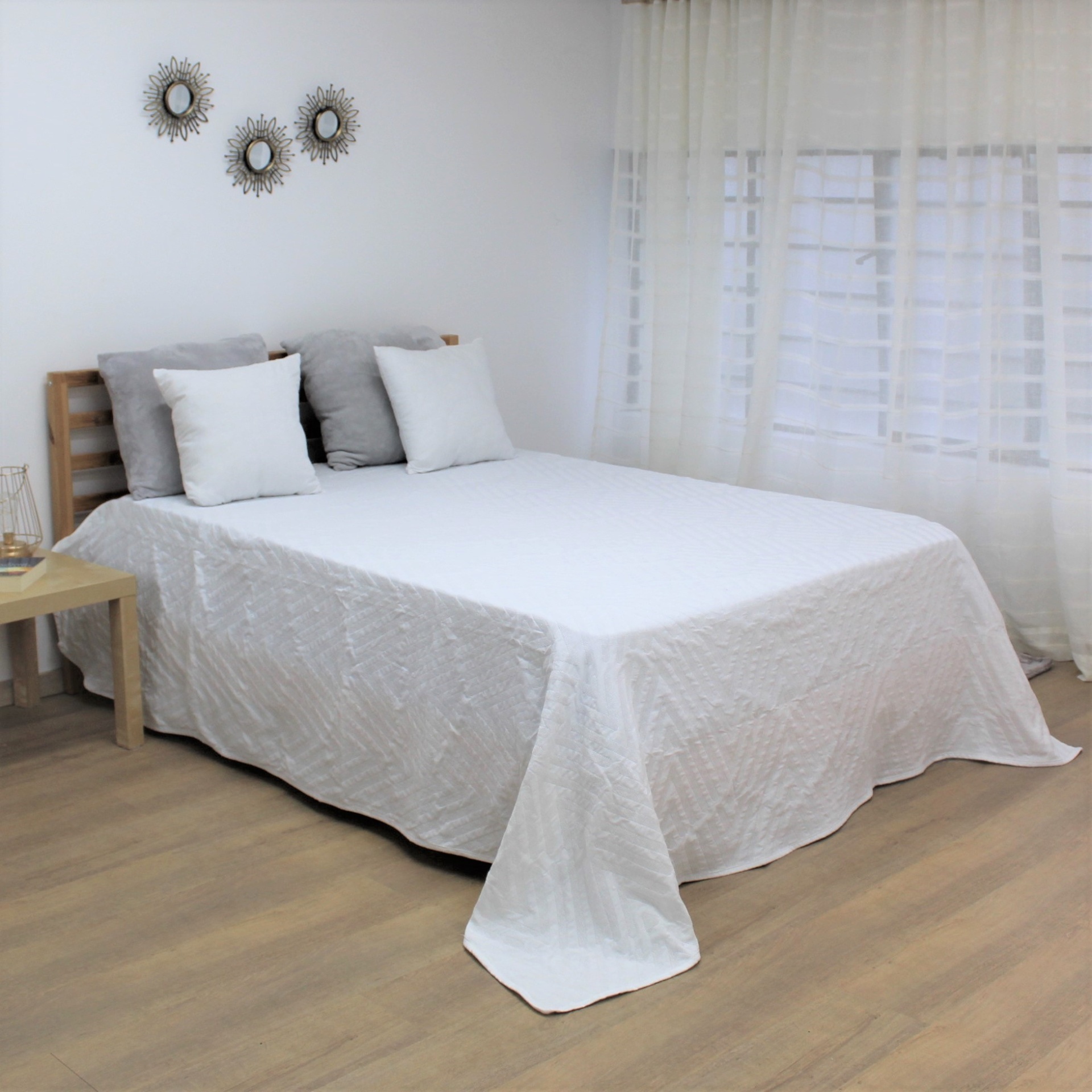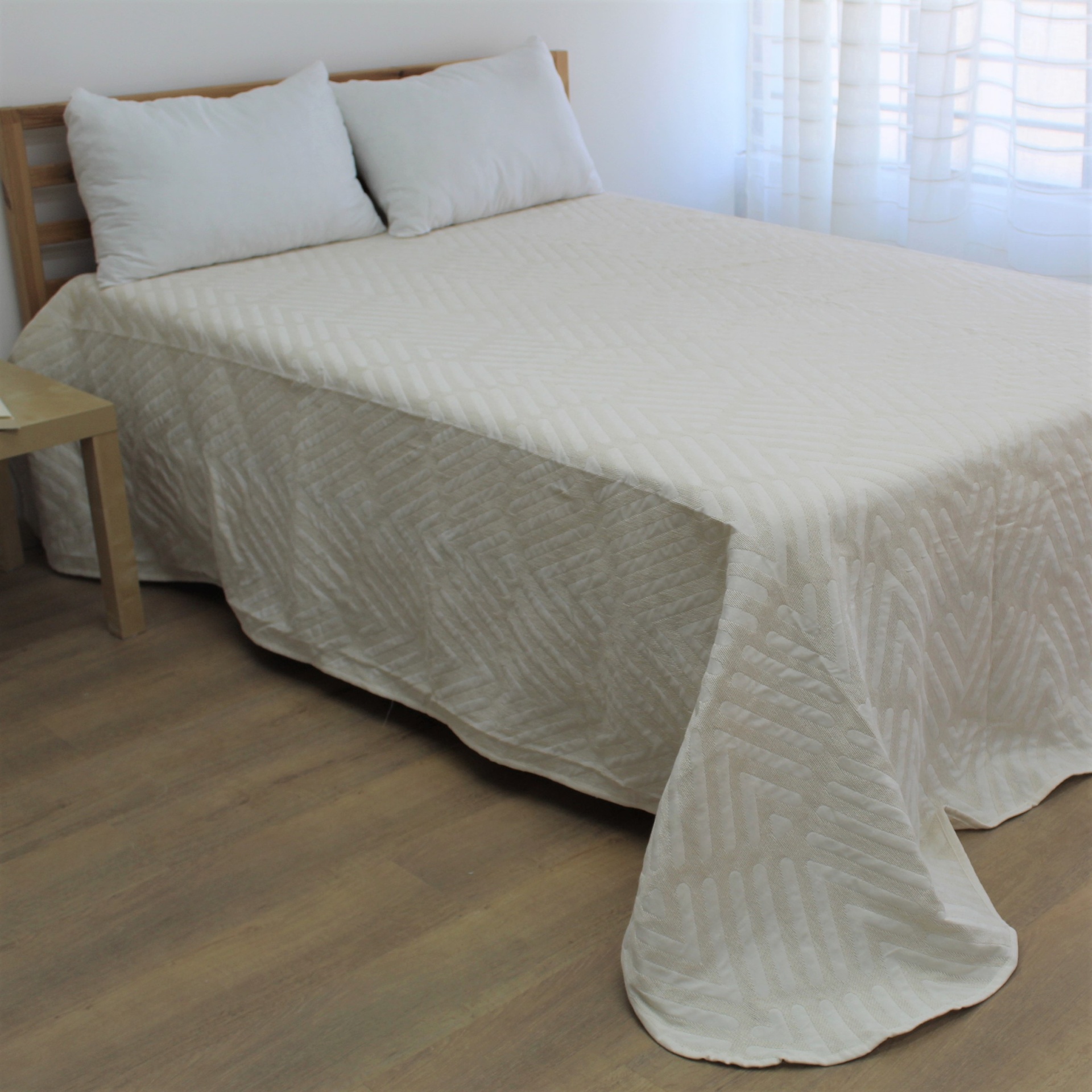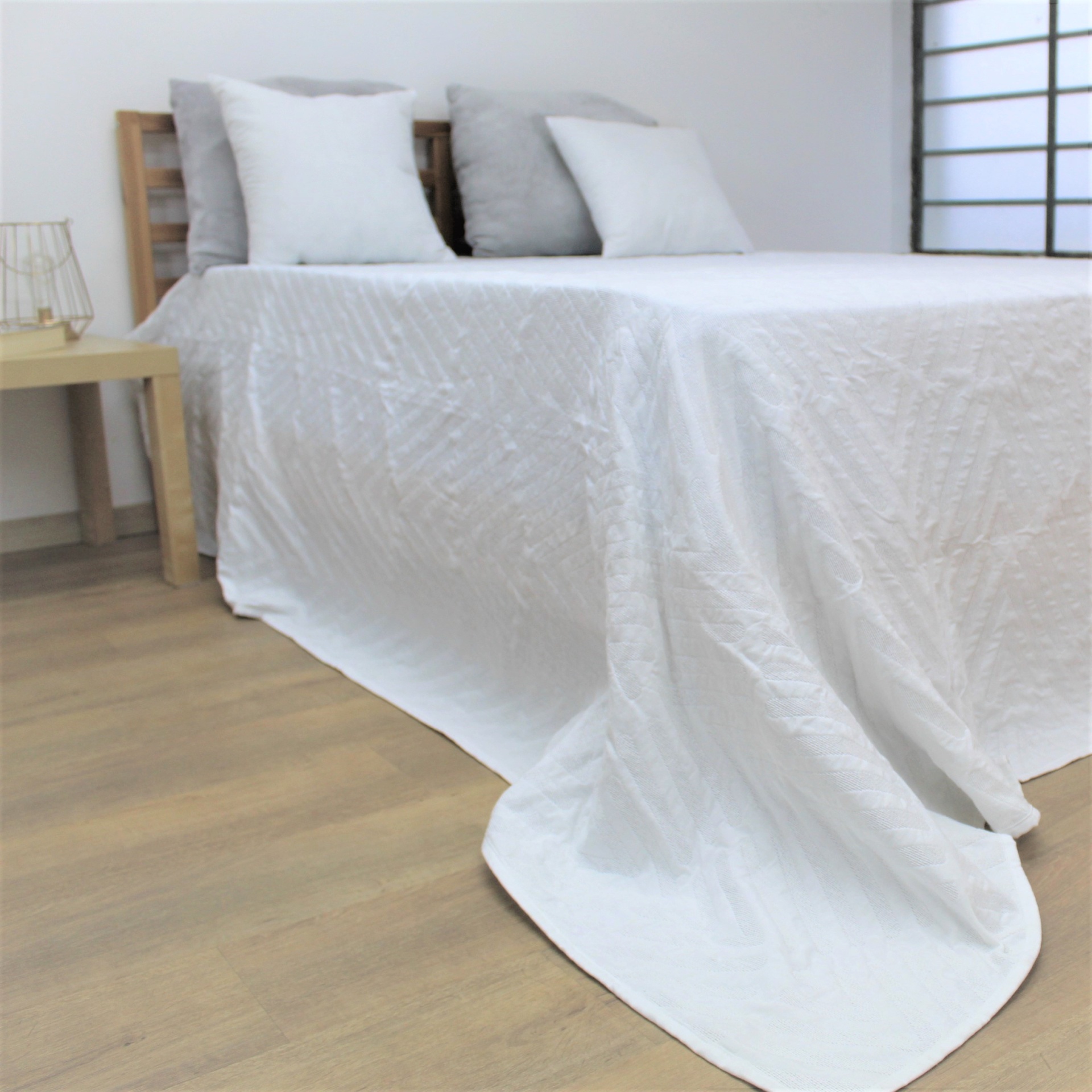 Colcha modelo Suni em tom branco, com um design discreto.